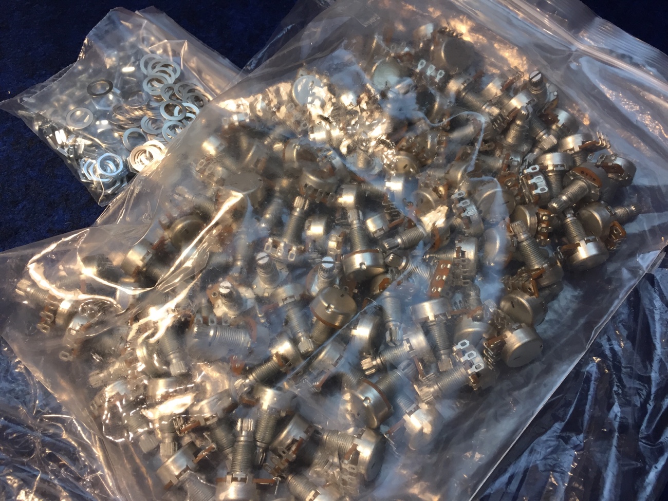 ナットを待っている間に配線を少し進めましょう。 新品のポットをマスターボリューム&マスタートーンにして、元の配線から取り出した2個はダミーになります。 トーン用コンデンサは部品取りして流用します。