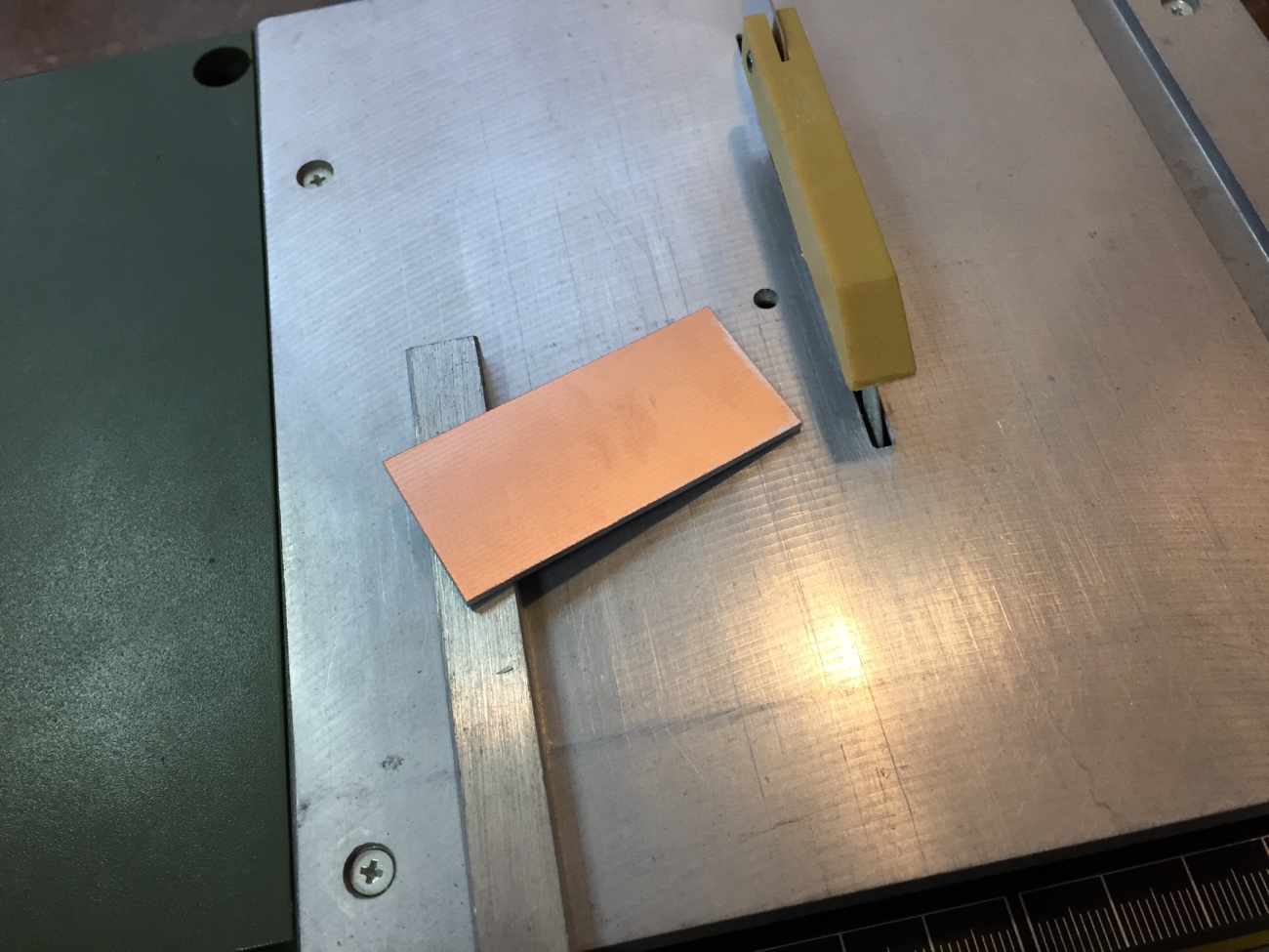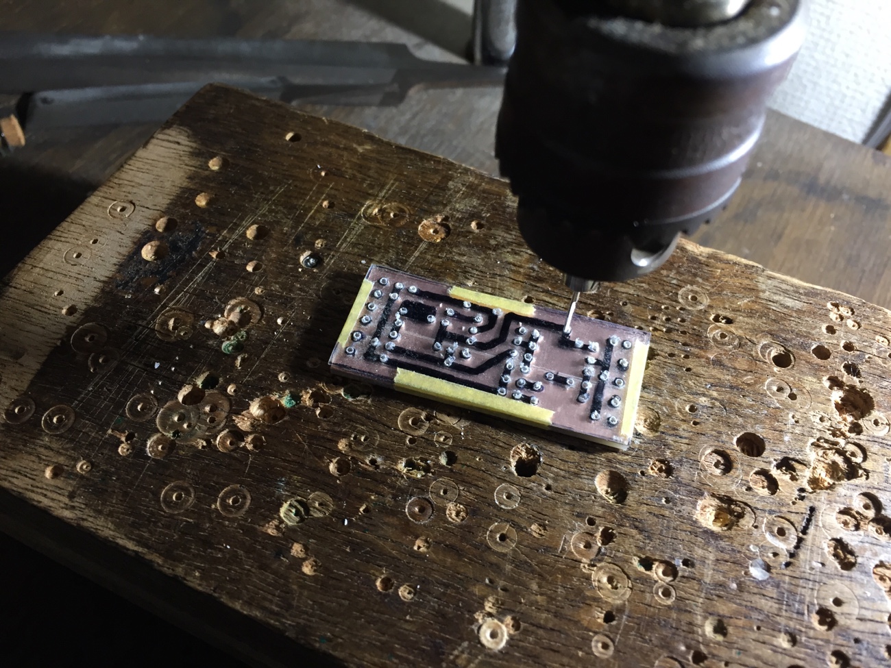 穴あけして、レジストペンでパターンを描きます。 エッチング液に付けると基板が出来上がります。