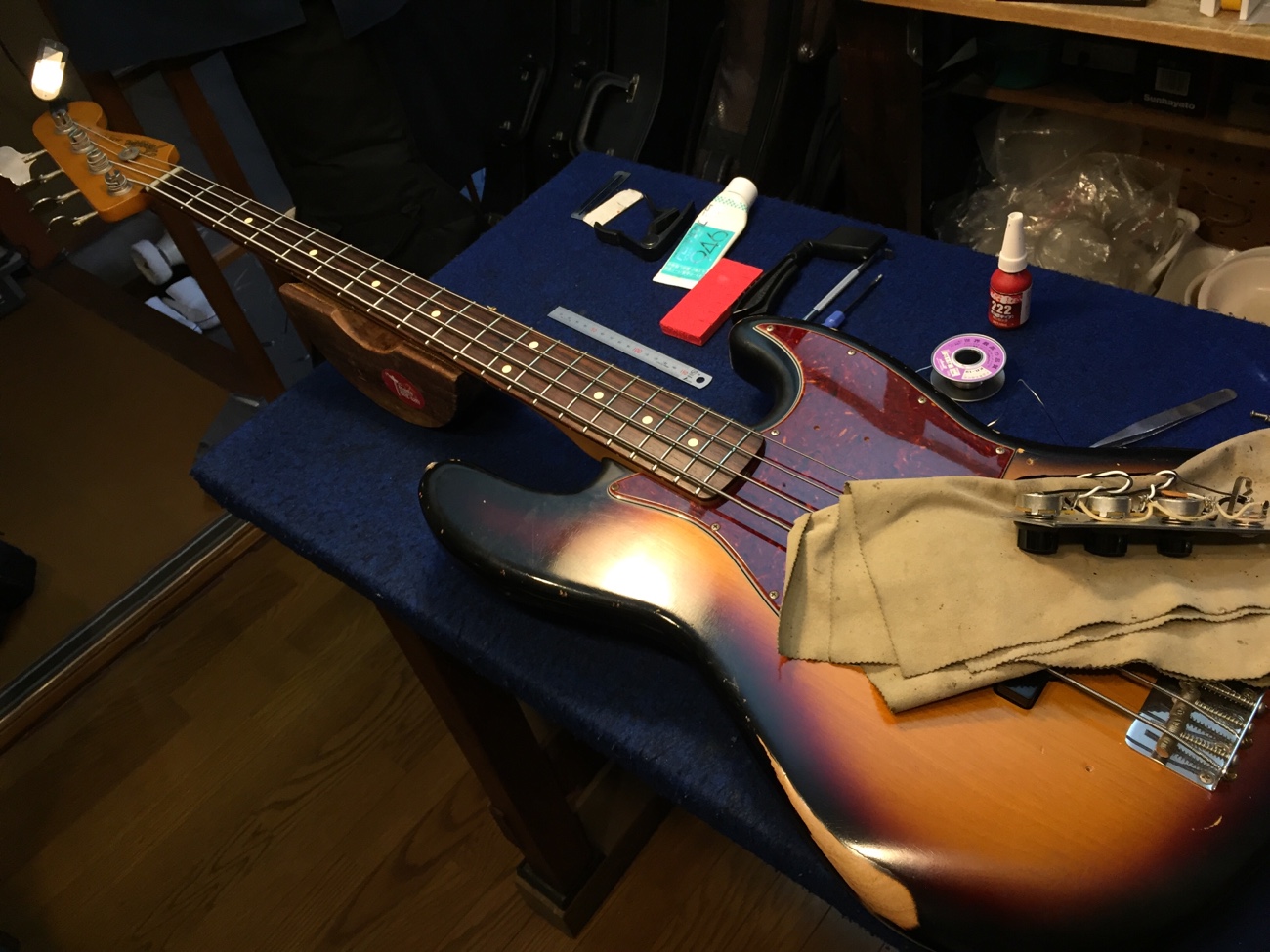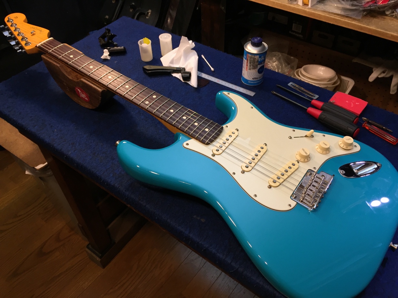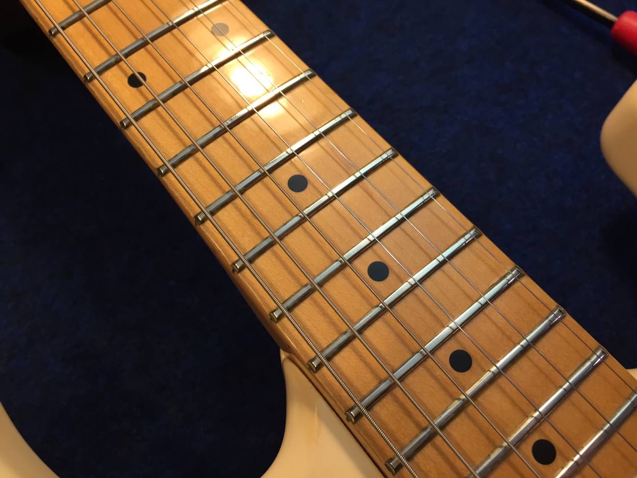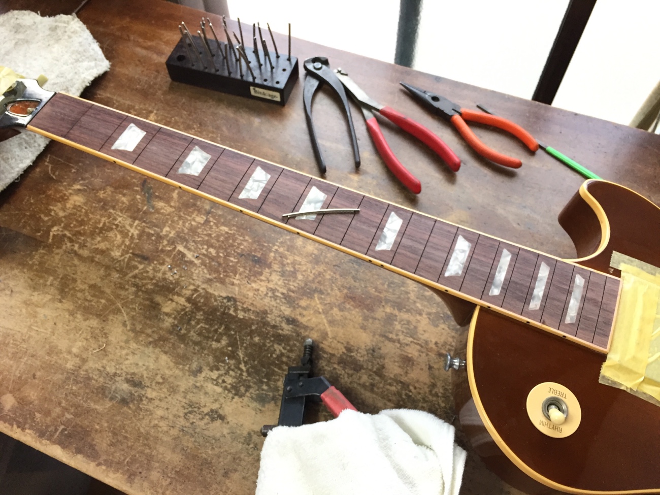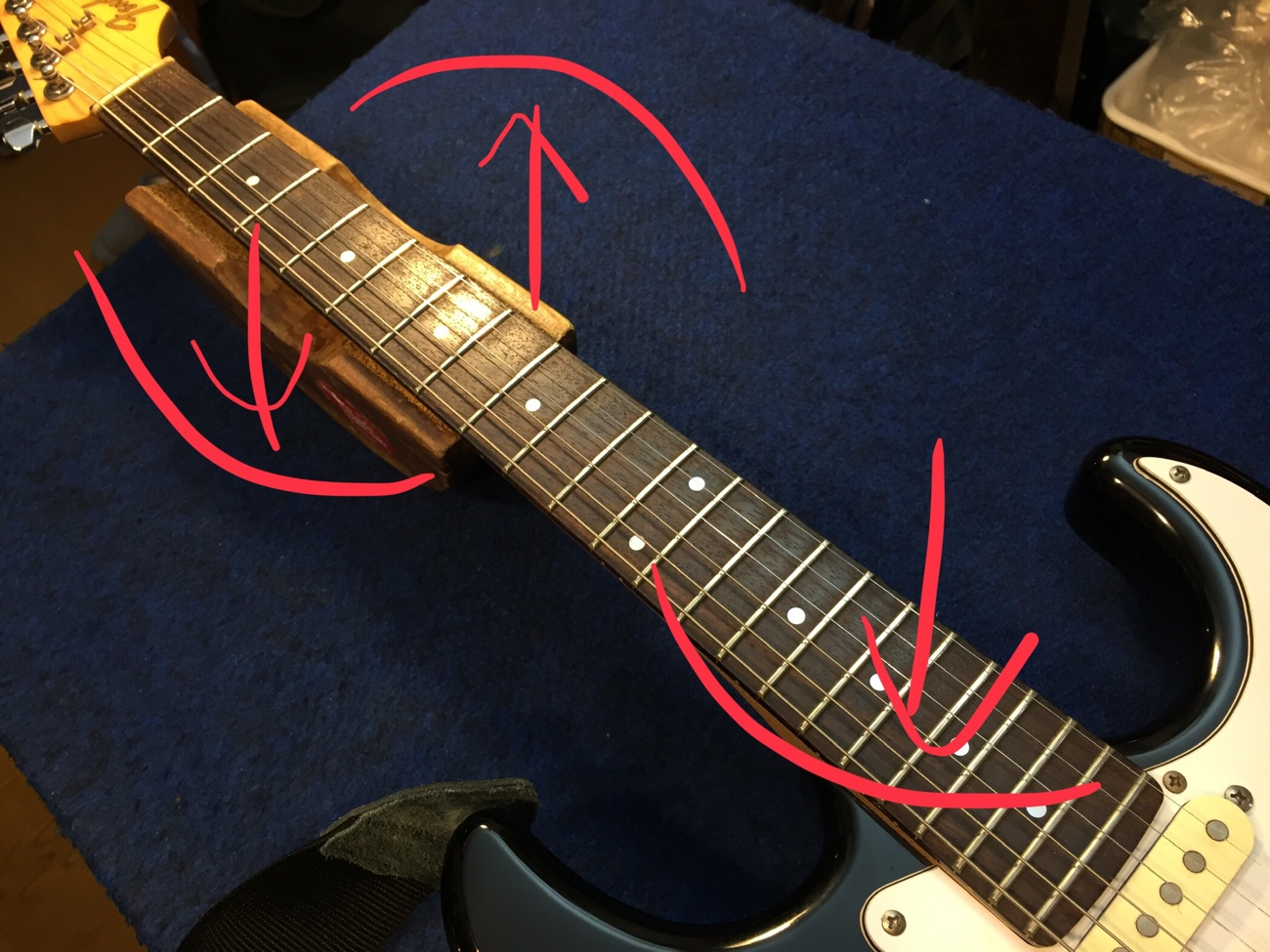 フレットが減ってきたので交換したいとのことです。 指板Rは10インチ付近。これよりフラットになると弾きにくく感じるそうなので指板Rを崩さないように研磨します。