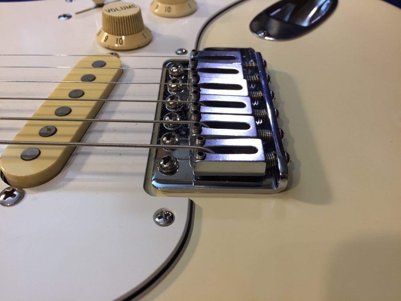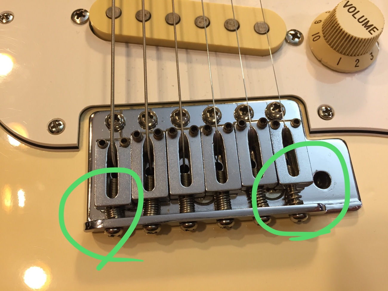 1弦のバネの長さがたりていませんが6弦のバネは切らないとサドルがさがらないかもしれません。