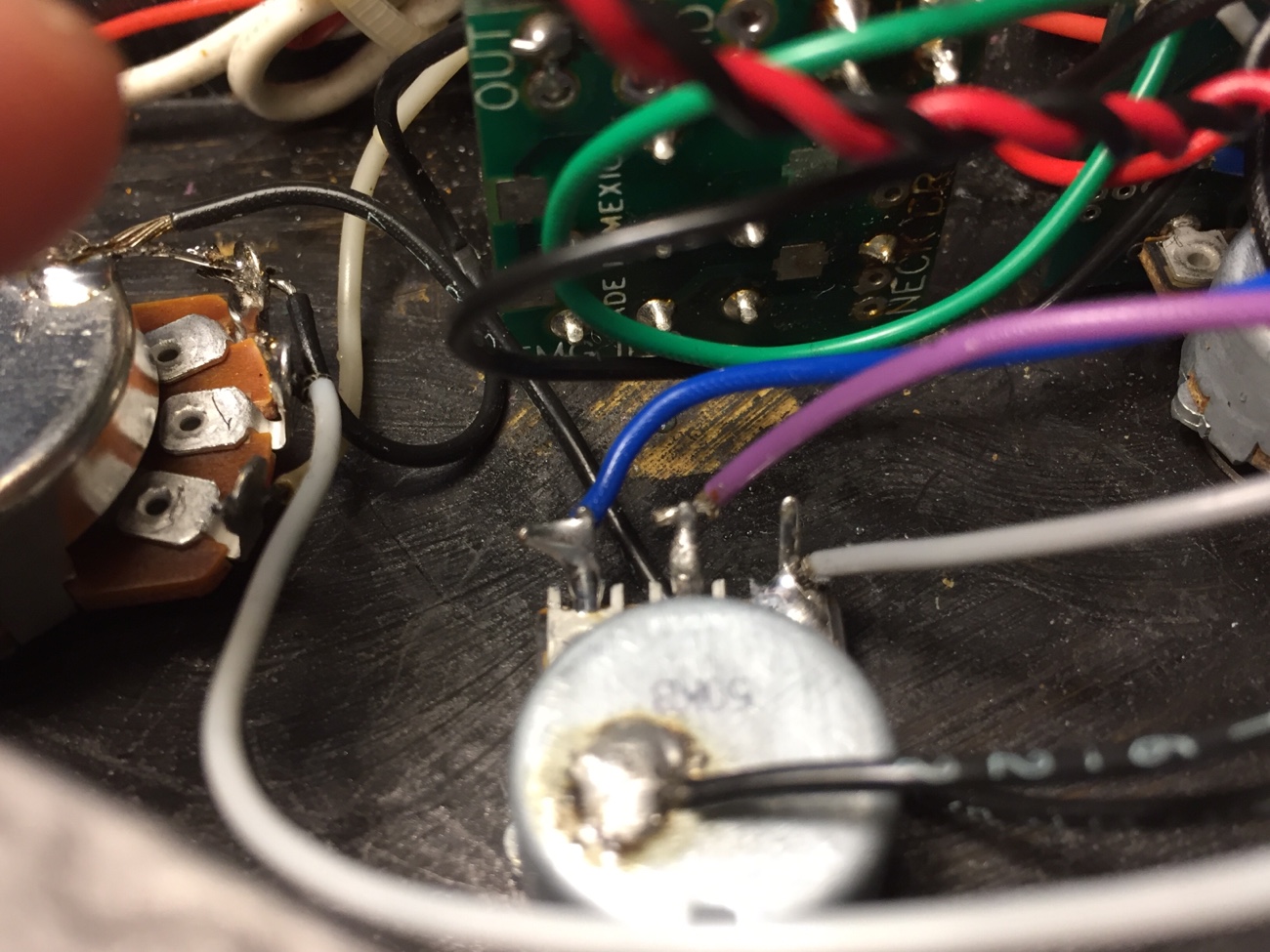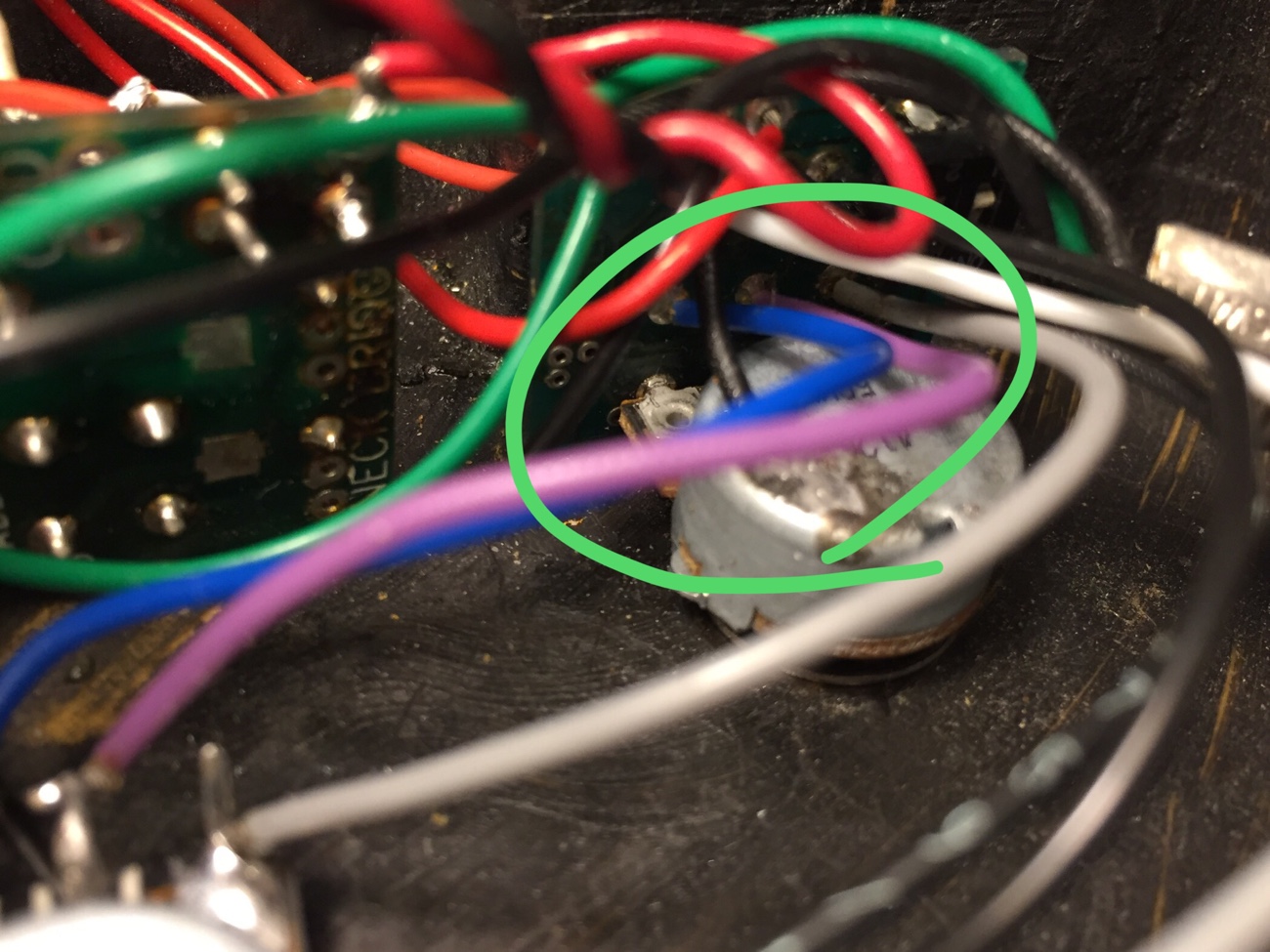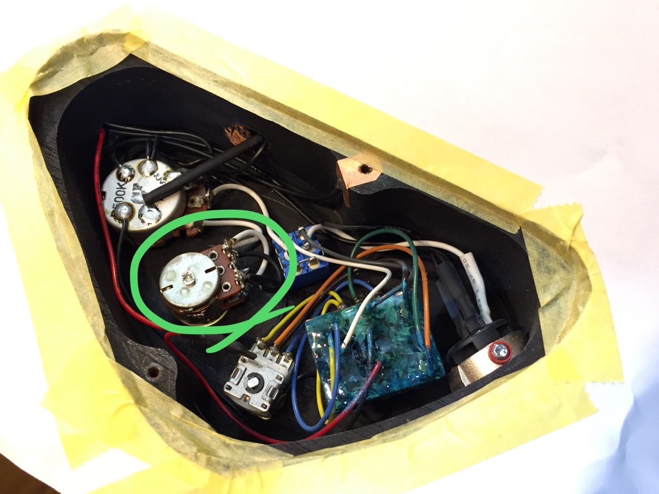 基板に直付けになっているポットのハンダ付け箇所の真上から3本の線が出ています。 スタックポットでトレブル&ベースをコントロールする基板から配線を引っ張り出しています。
