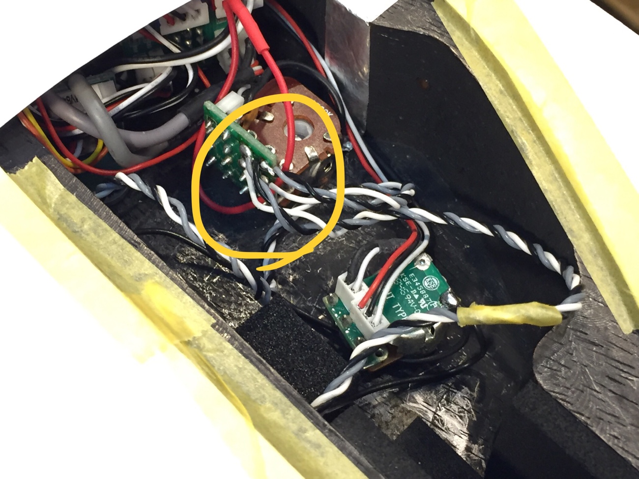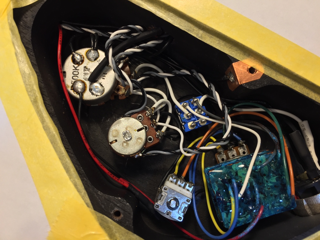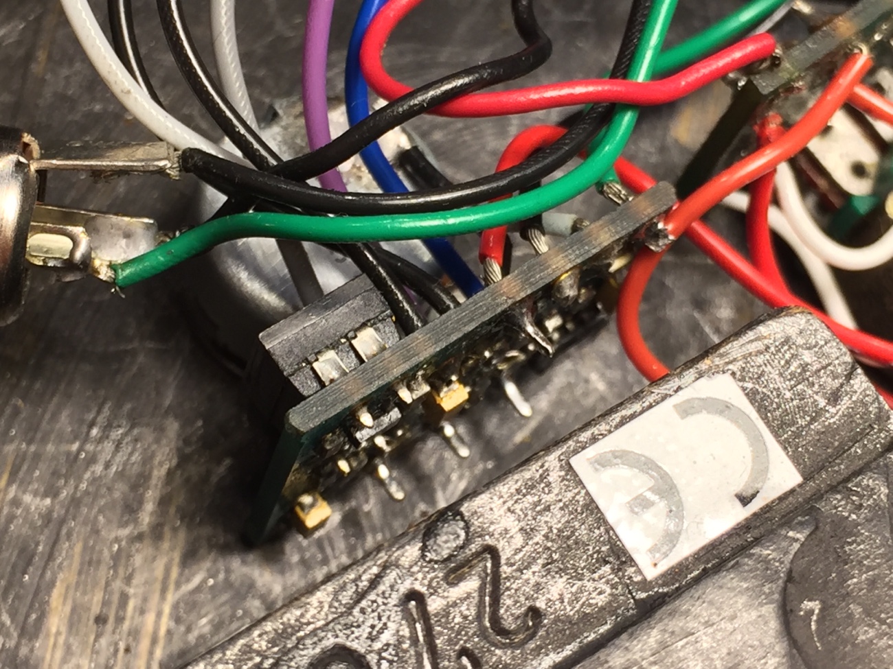 基板に直付けになっているポットのハンダ付け箇所の真上から3本の線が出ています。 スタックポットでトレブル&ベースをコントロールする基板から配線を引っ張り出しています。
