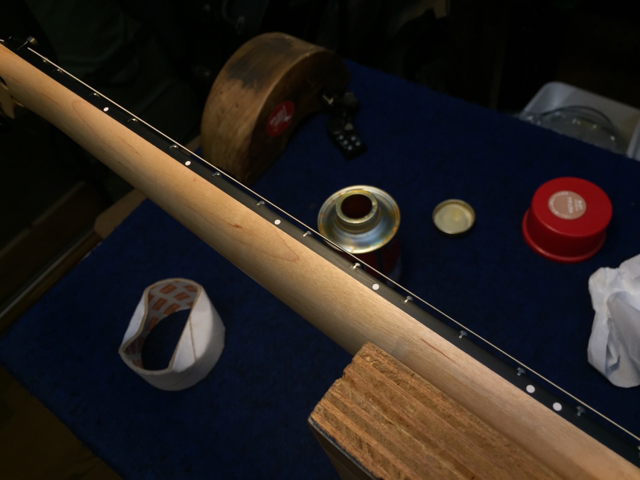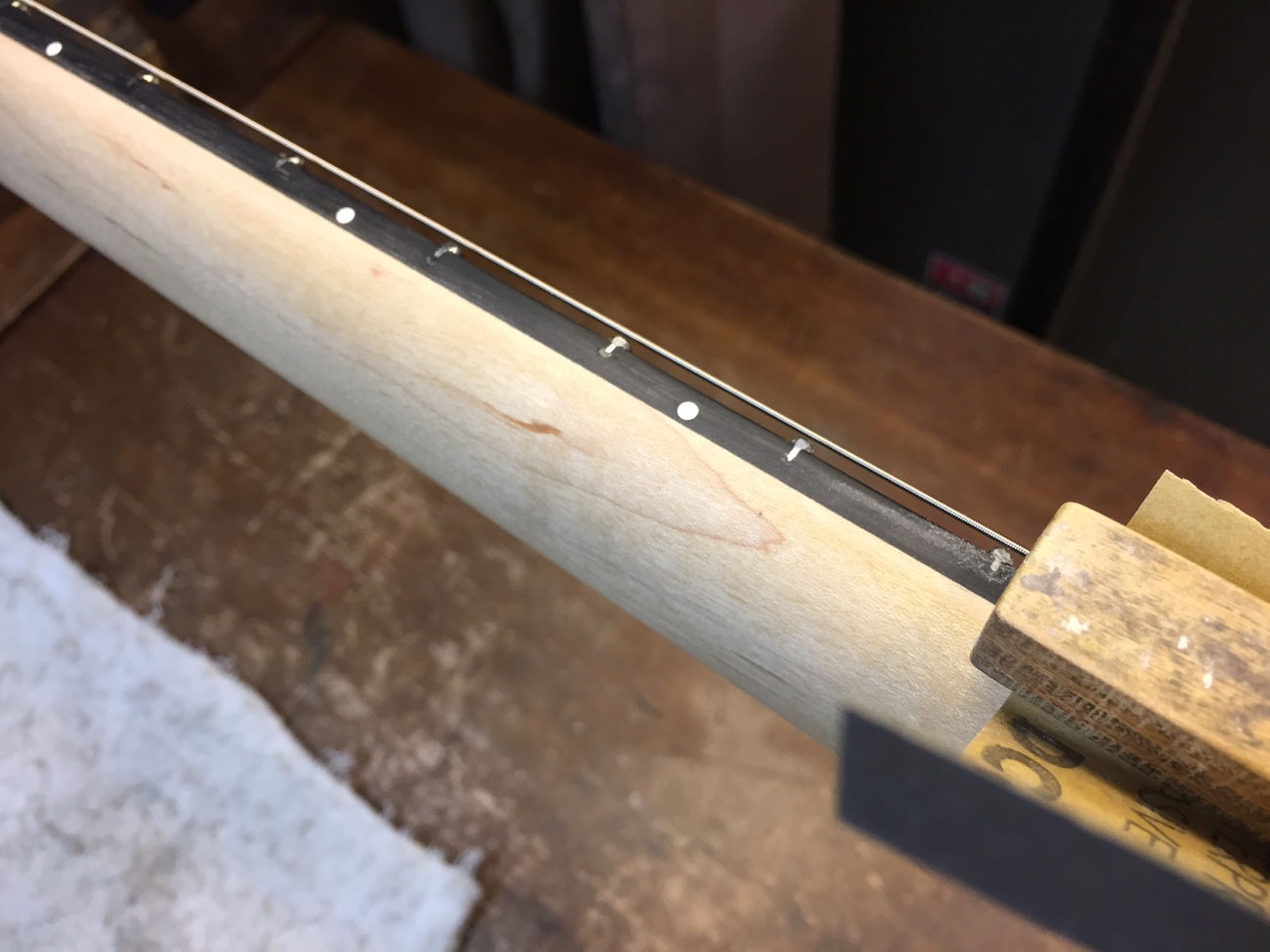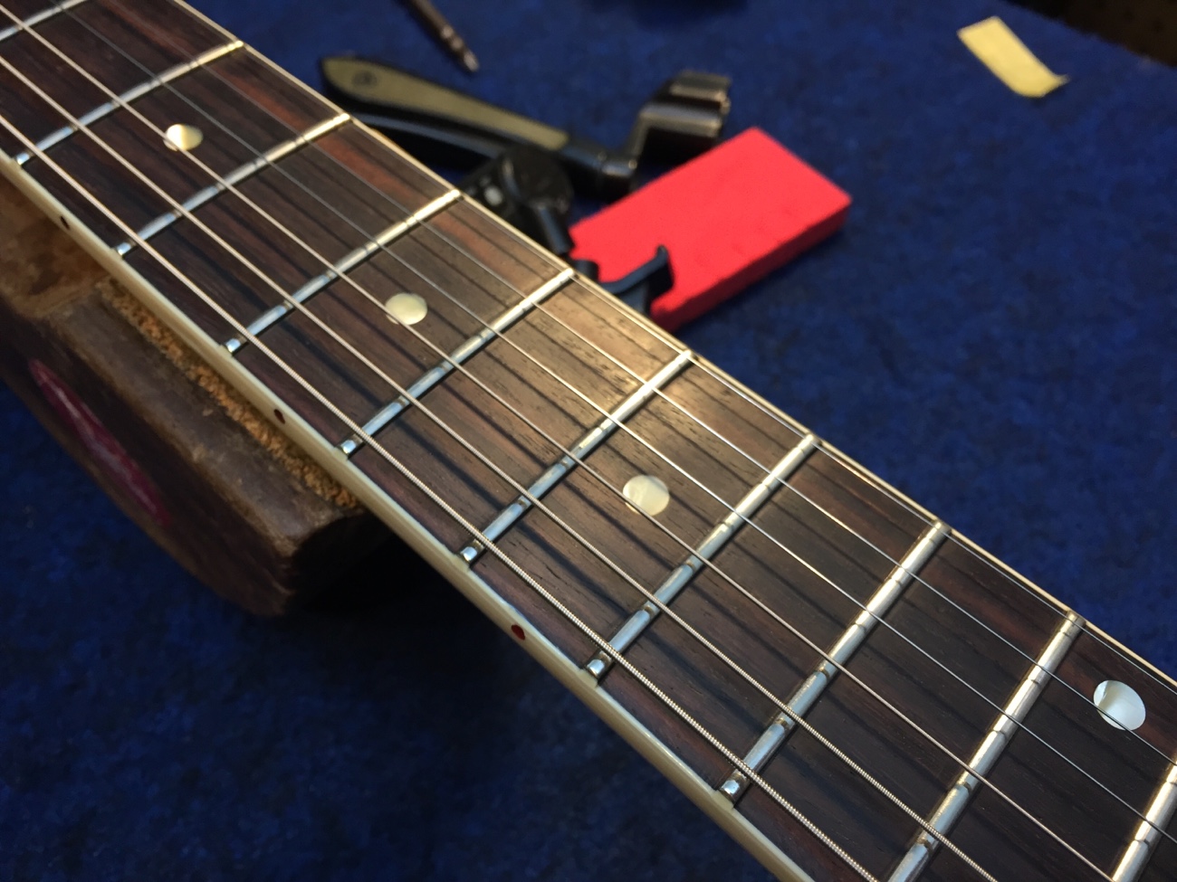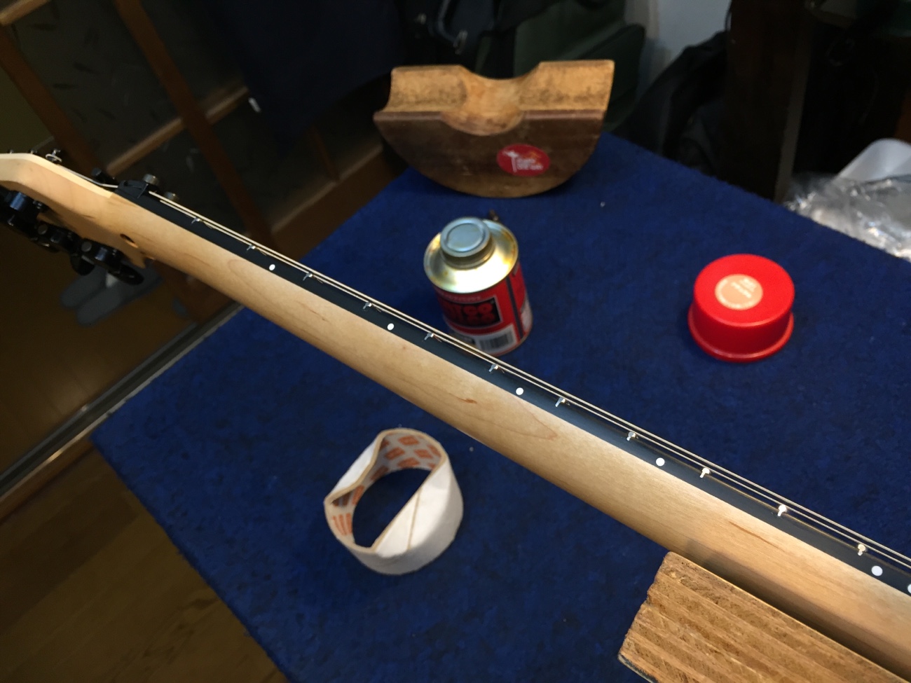 フレットのすり合わせをします。 弦を張って、演奏時と同じように抱えた状態でフレットの頂点をそろえていきます。