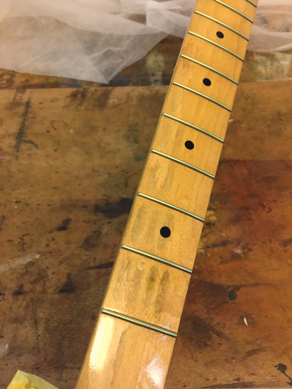ブラックナイロン弦に交換されています。 この弦の張力の低さを考慮して弦高を決めて、全体を調整することにします。