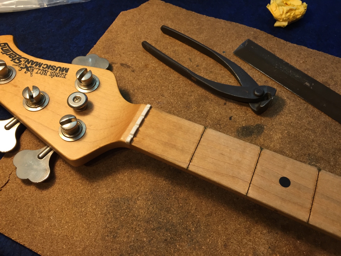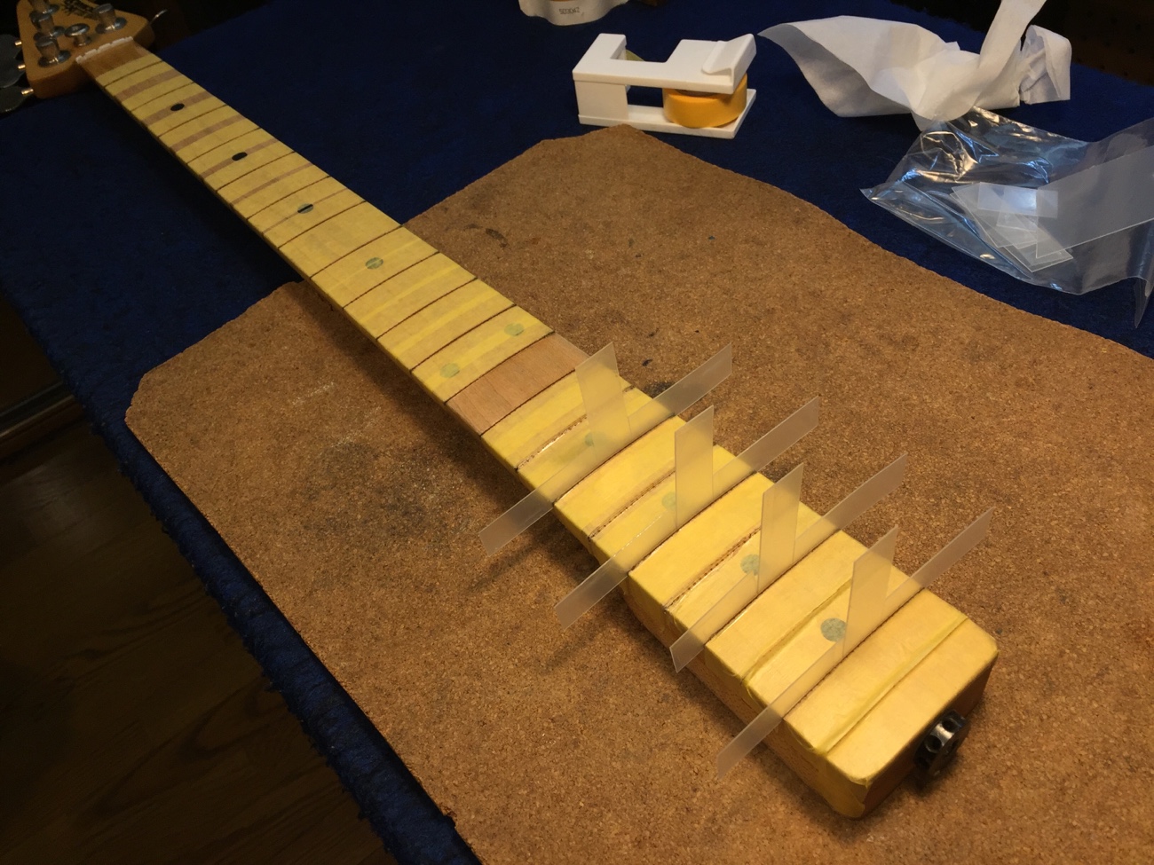 溝を狭める【スターリン4Hのフレット交換-12】 投稿日時: 2025年10月11日 投稿者: admin フレットのタングで指板を内側から押し広げるように支えたいので、フレット溝を狭めます。 全部マスキングしましたけれど、ハイポジションだけで良いかもしれません。 Tweet