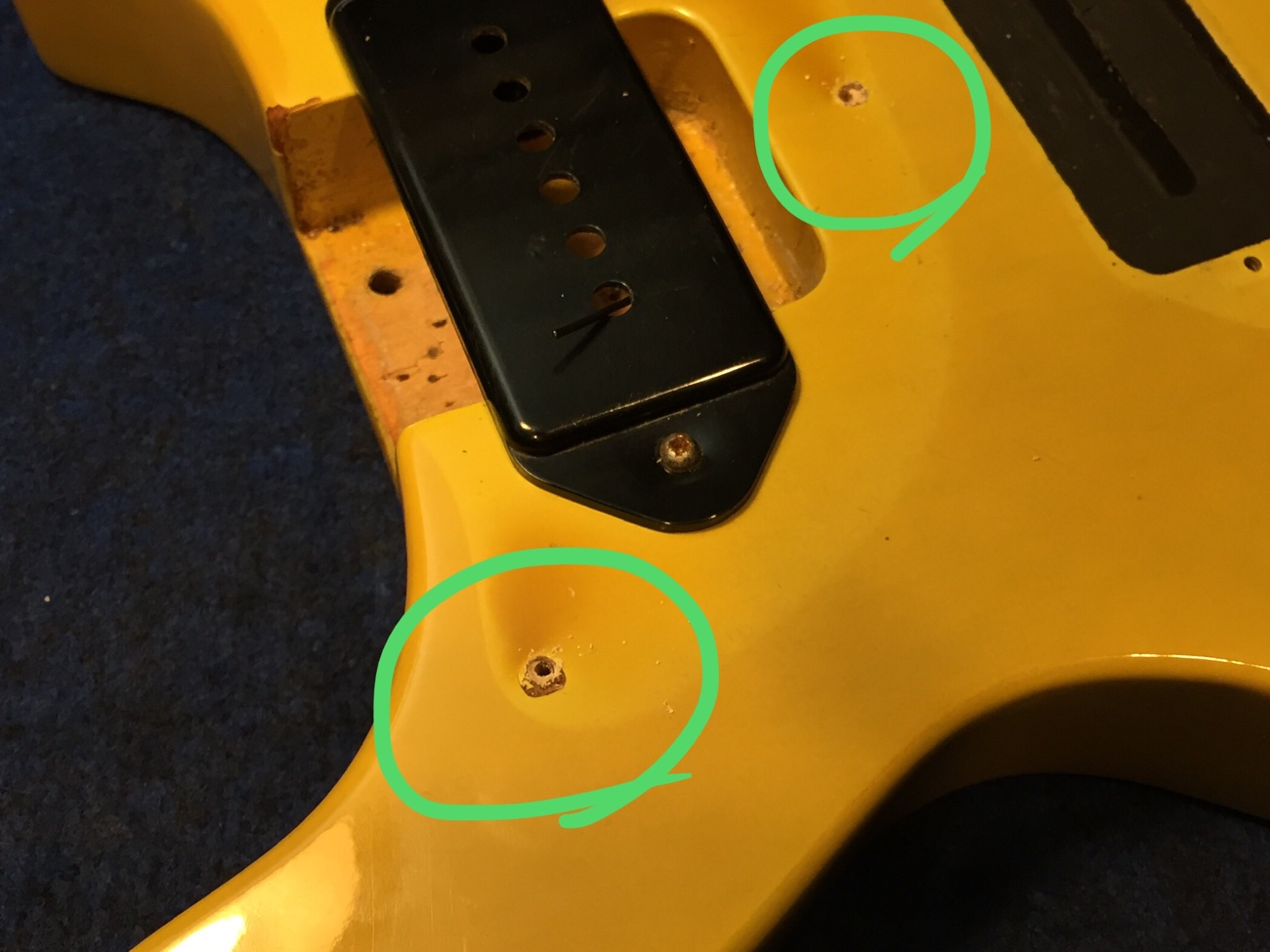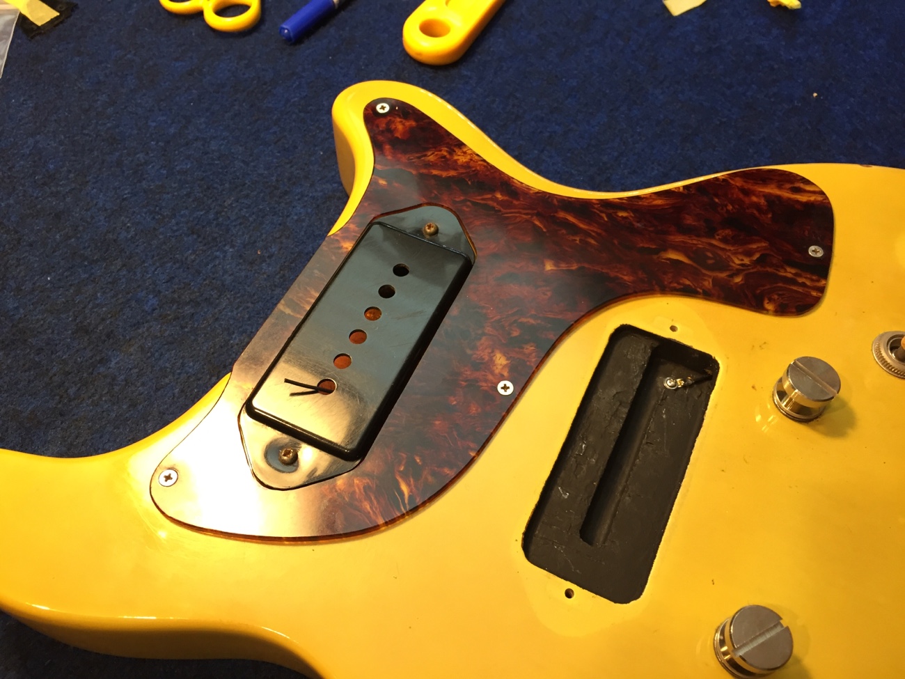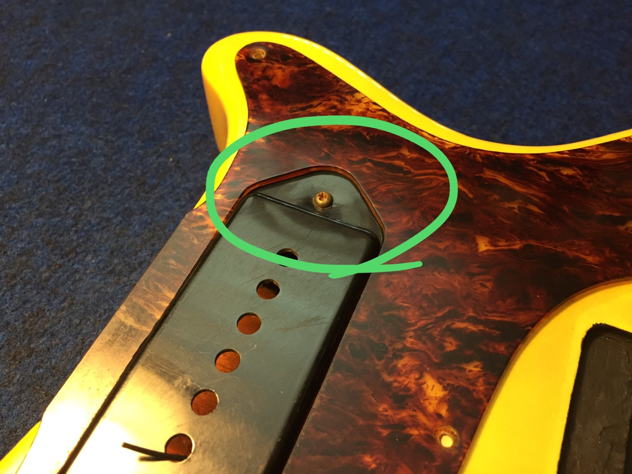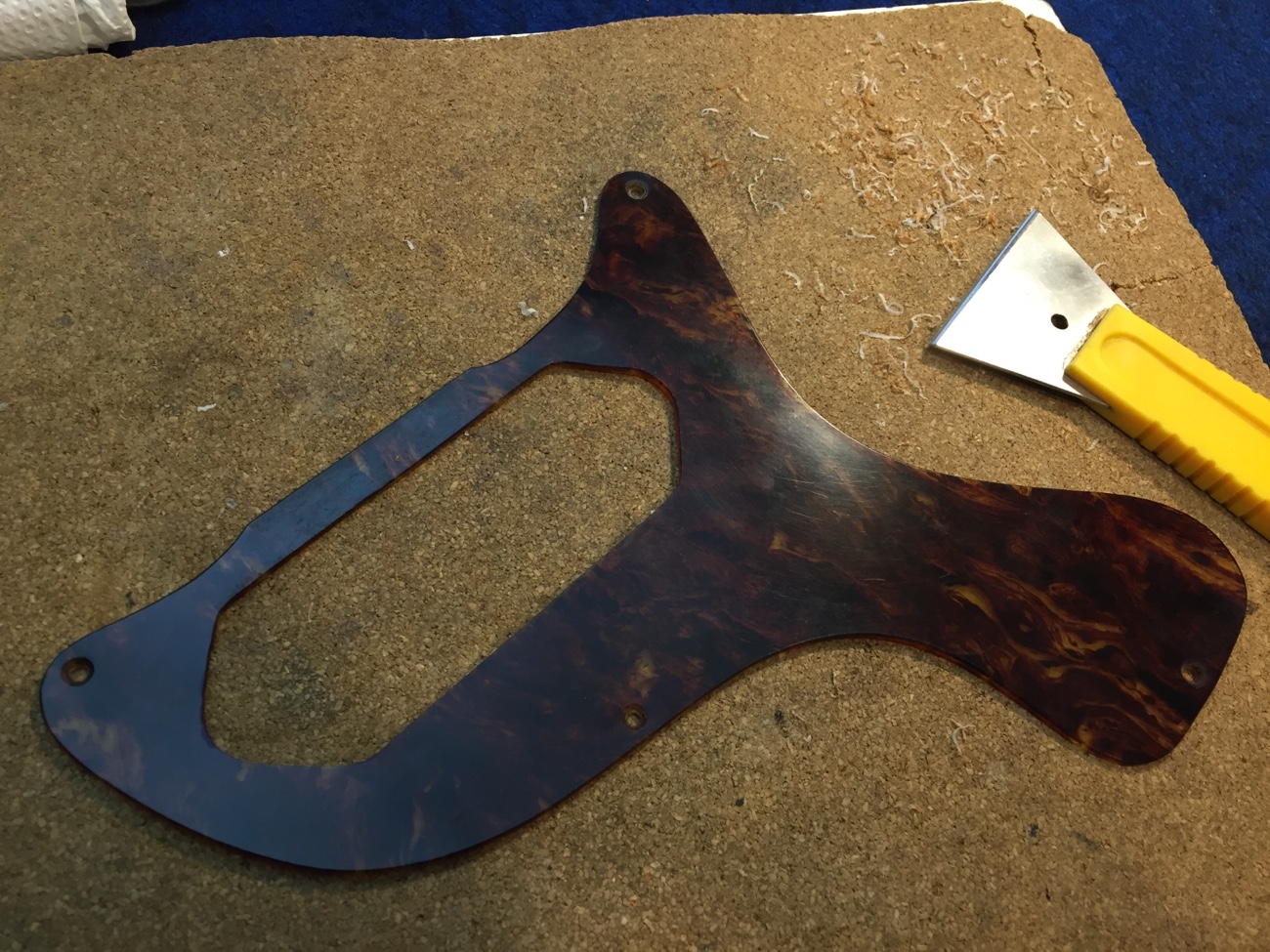 縮んだピックガードの取り付け修正【Burnyのレスポールジュニアタイプのチューンナップ-38】 投稿日時: 2025年10月12日 投稿者: admin ピックガードが縮んでいて取り付けられなくなっています。 ネジ穴も合いません。 ピックアップの穴を手作業で拡げていきます。 埋めておいたネジ穴を新しくあけ直します。 ぴったり付きました。 牛骨ナットの弦溝を仕上げて、ネックジョイントにシムが必要か確認していきます。 そのあとピックアップとコンデンサの配線をすれば完成が見えてきます。 Tweet