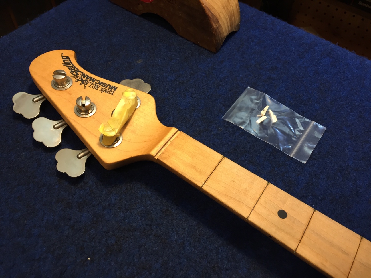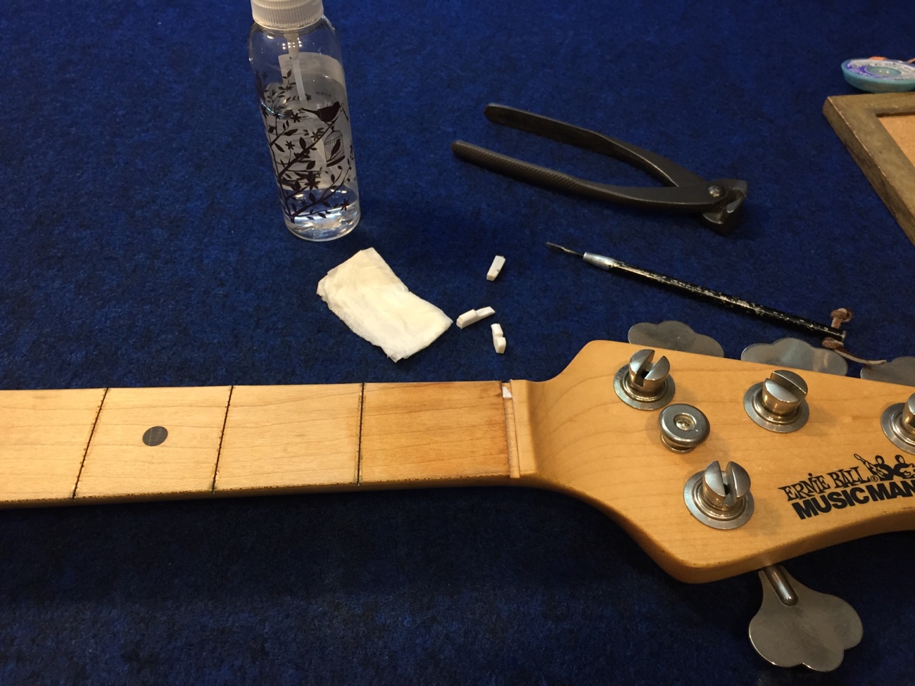 ナットを外す【スターリン4Hのフレット交換-13】 投稿日時: 2025年10月12日 投稿者: admin ナットの接着が良くて外れません。 スチームで温めて取りましたけれどバラバラに割れてしまいました。 破片を組み直して弦の間隔だけ参考にしましょう。 ナット付近の指板も研磨していきます。 フレットを打つ前に指板着色とオイルフィニッシュをすることになると思います。 Tweet