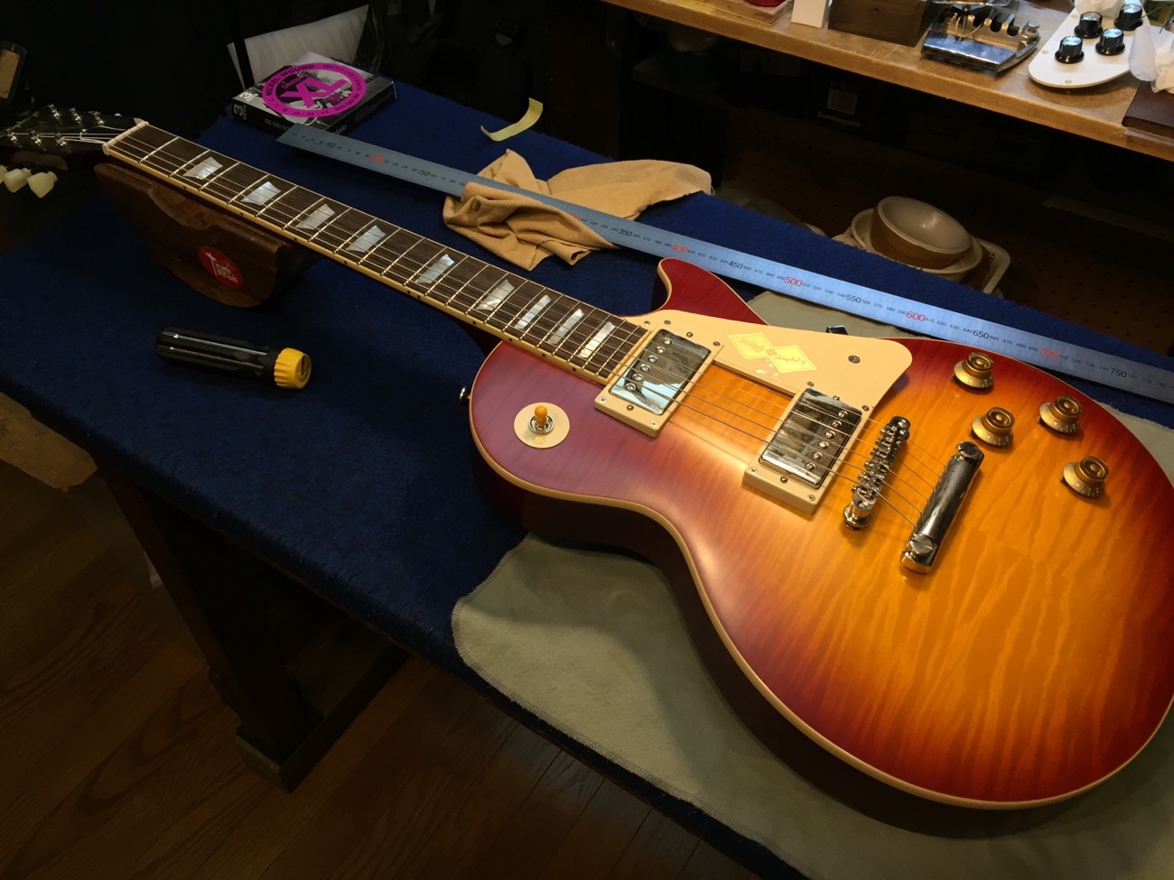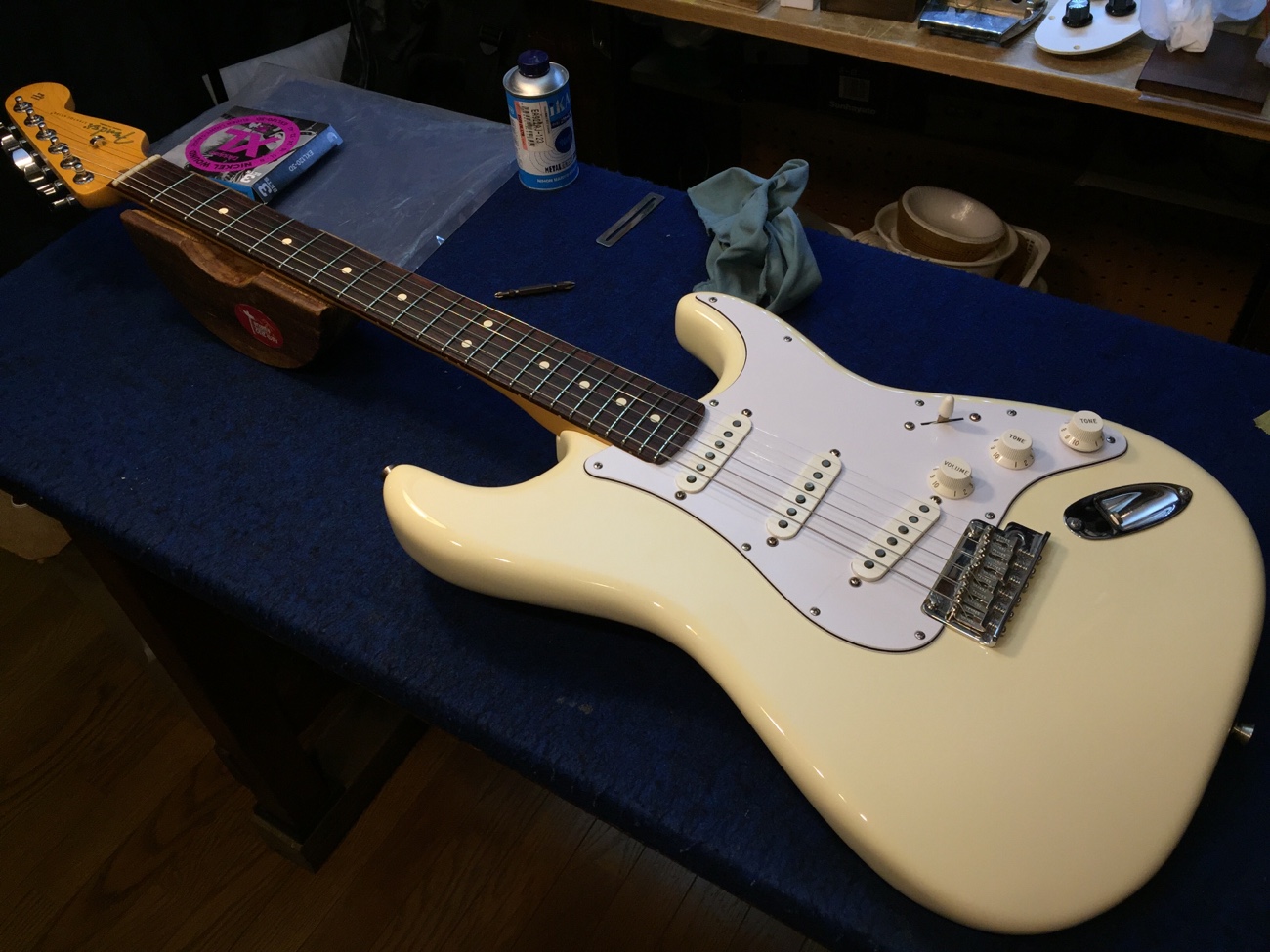 弦交換、ネック調整、弦高、オクターブチューニング、ピックアップの高さ調整などをしました。
