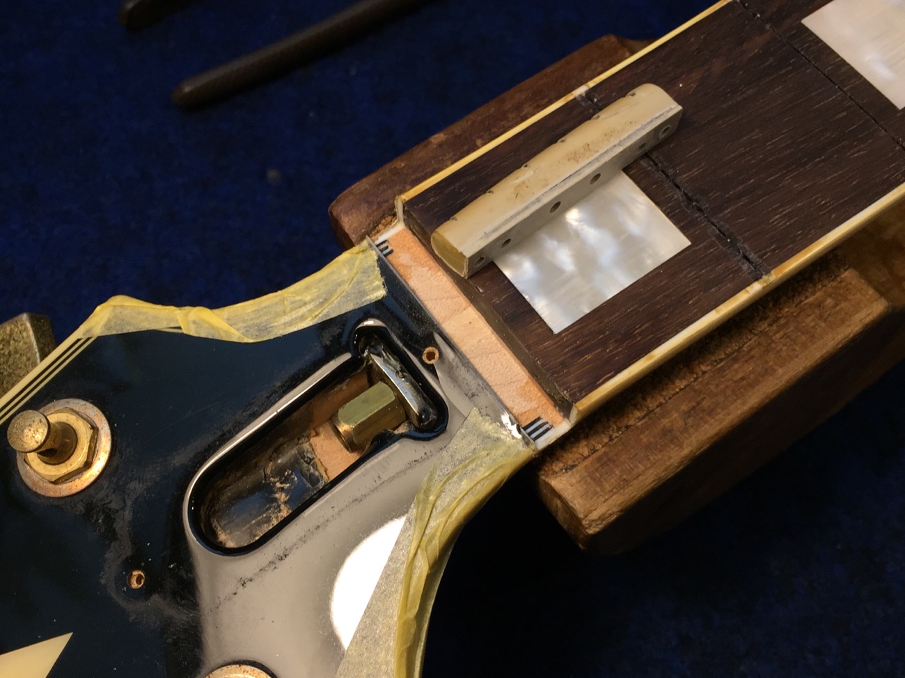 シムの追加【Burnyのレスポールジュニアタイプのチューンナップ-47】 投稿日時: 2025年11月27日 投稿者: admin ネックの角度を調整していきます。 ポケットのいろいろな部分の隙間を調べています。 ネックがどっちに行きたがっているのかが分かってきました。 ここに隙間を作って上げるとヘッドが6弦側に振られて、弦が良い位置に来るようです。 ここでネックを受け止めます。 銅箔テープに導電塗料を塗って分断されているフロントピックアップキャビティの導電塗料をつなぎました。 これで上手くいくと良いですね。 いよいよ完成が近づいてきました。 Tweet