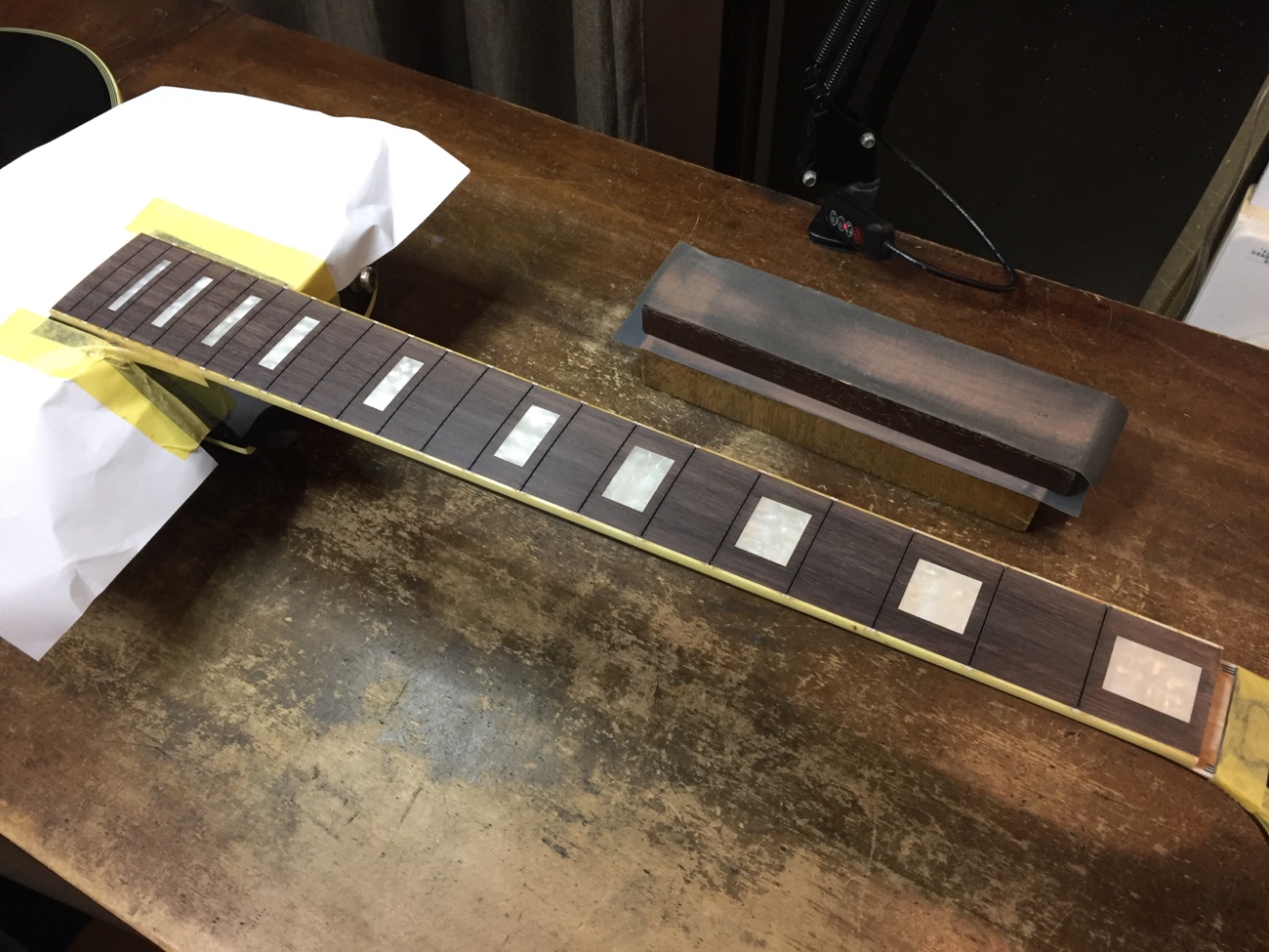 指板を仕上げた【Laid Backのレスポールカスタムタイプのチューンナップ-14】 投稿日時: 2025年11月28日 投稿者: admin 弦を張った状態で指板の直線性を確かめます。 これで良さそうです。 ナットを外してナット付近も#600まで研磨しましょう。 指板を仕上げました。 フレットを用意していきます。 Tweet
