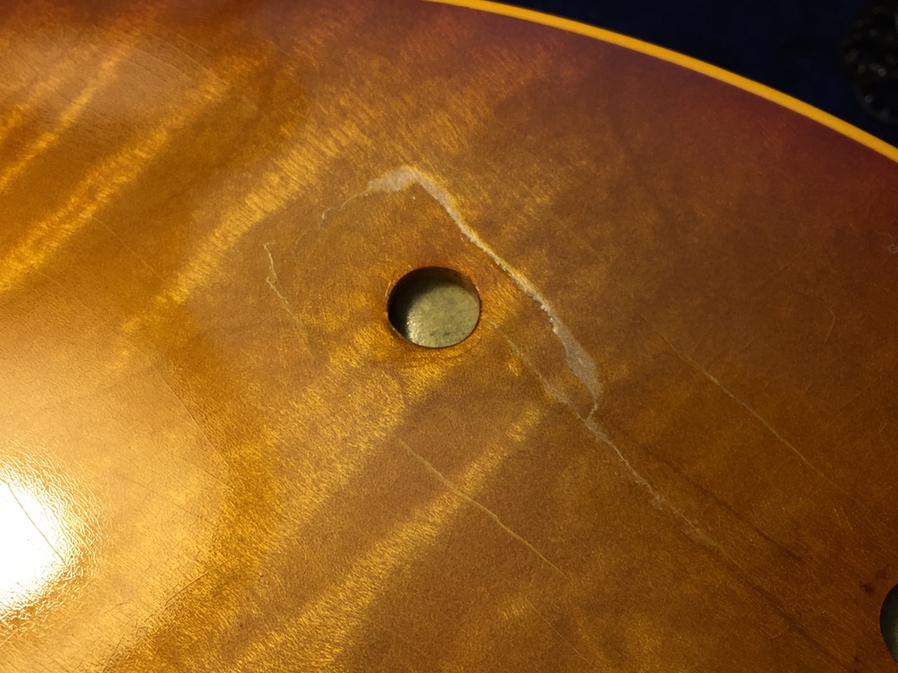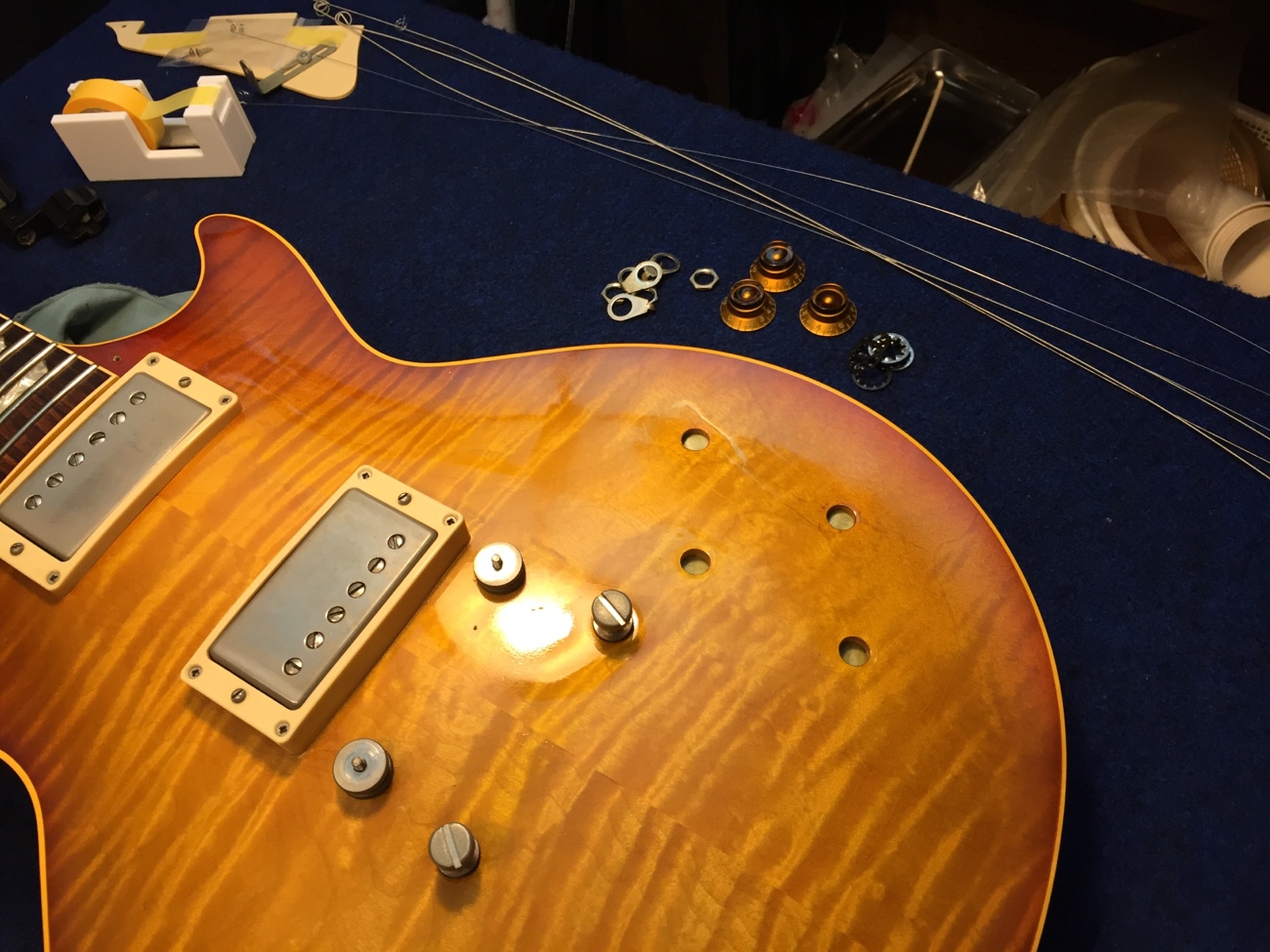 部品を外した【レスポールスタンダード(20250830お預かり)の塗装修理-2】 投稿日時: 2025年11月28日 投稿者: admin 塗装を修正する付近の部品を外しました。 2mmくらいの幅で色がなくなっているところにはタッチアップラッカーが塗られています。 これを削り取って色を塗って、コーティングします。 細かいところはクラックとして茶色を入れていきましょう。 Tweet