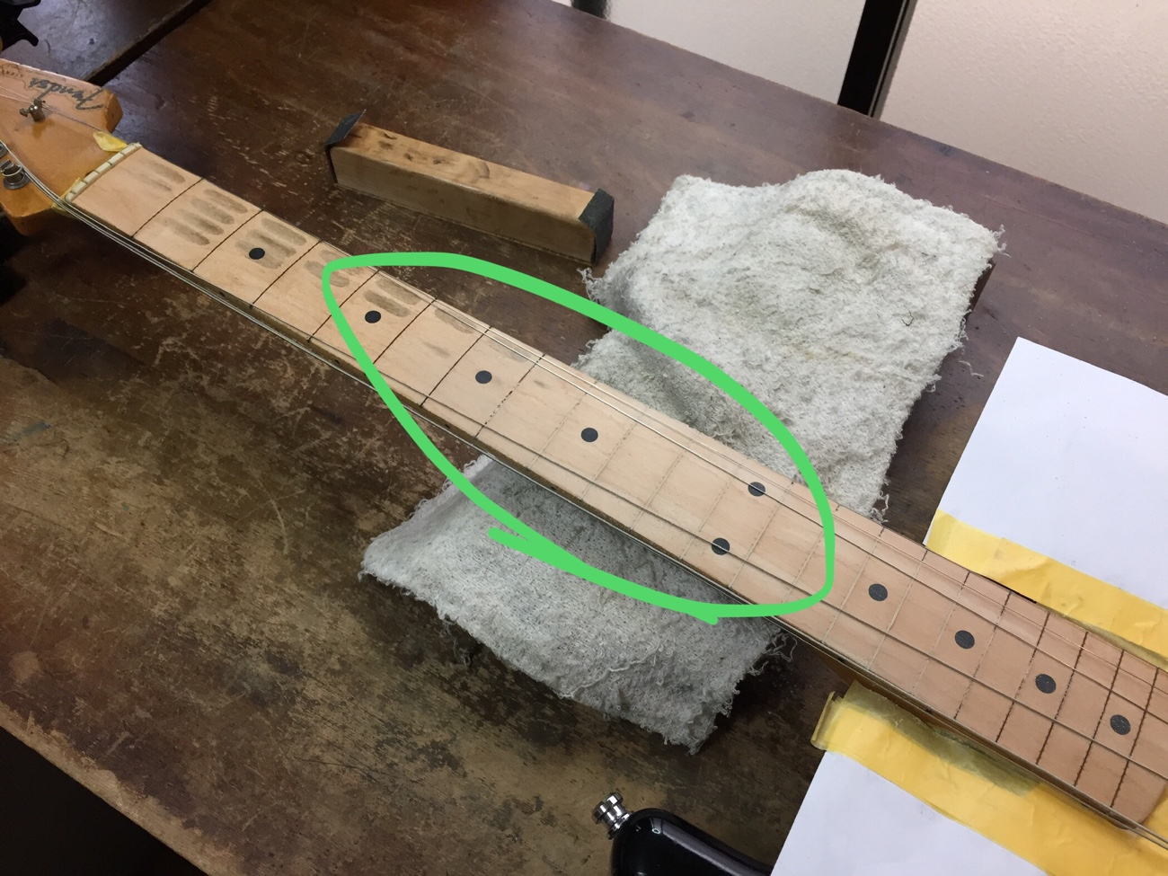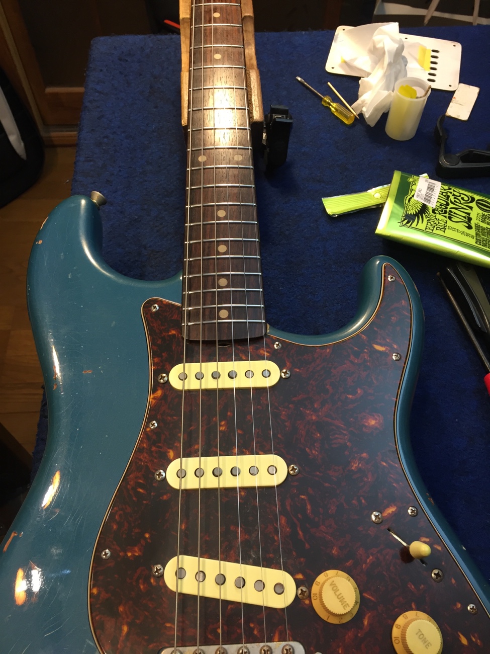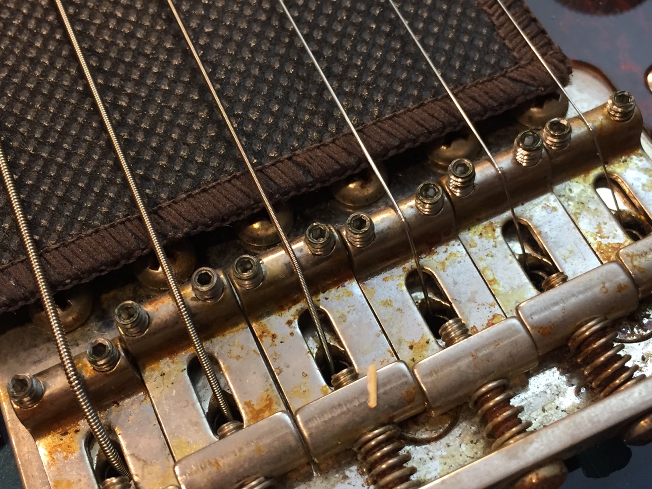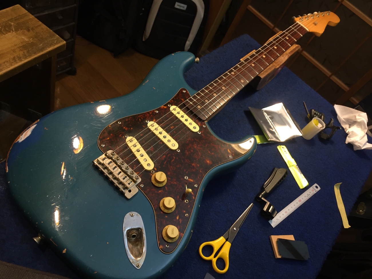 ペグのブッシュナットが緩んでいないかチェックして、ナットの弦溝に追いグリスしておきます。 ネックの反りは動いていません。