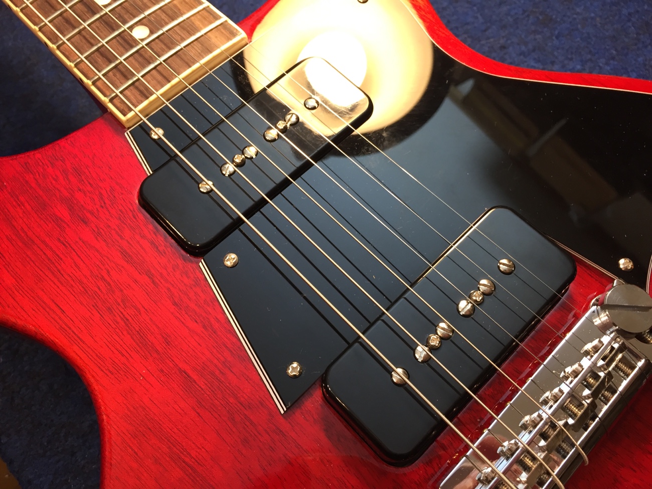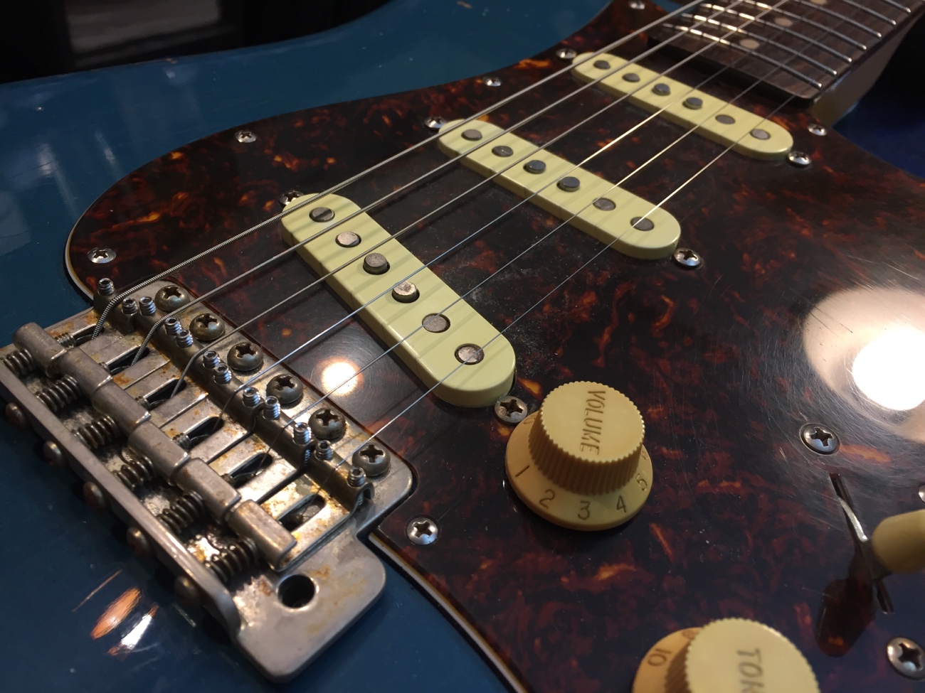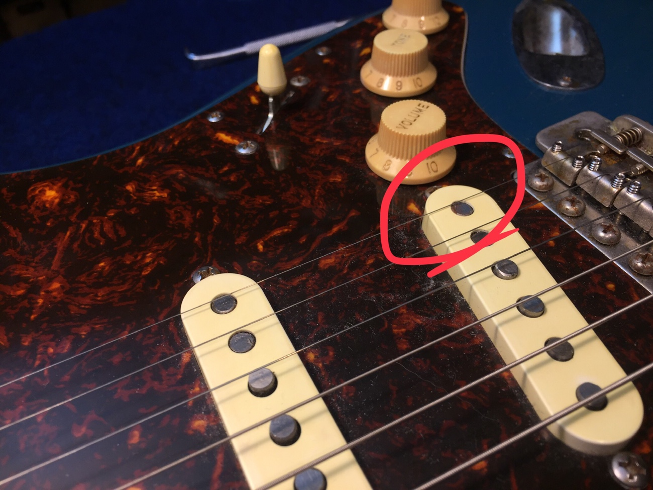 このギターは両方ともN極のピックアップが付いています。 おそらく同じ出力なので、大胆にネック側を下げた方が音量バランスが良くなります。