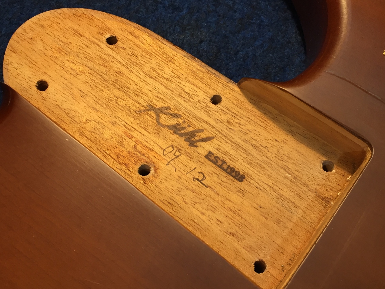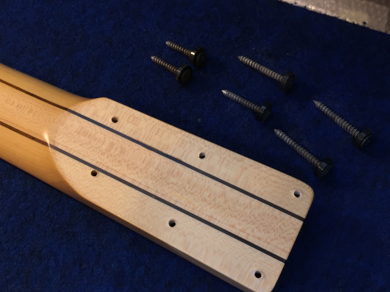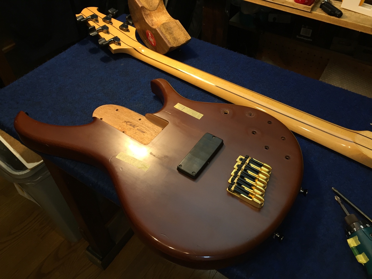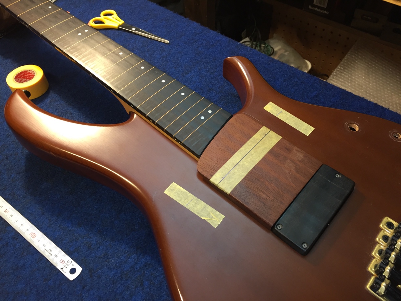 取り付け位置を決めた【Kiihlの5弦フレットレスベースの改造-15】 投稿日時: 2025年9月28日 投稿者: admin 最初は指板とスロープのつなぎ目のラインをそろえるつもりでしたが、フレットレスベースでそれをやるとハイフレットを演奏時にスロープに当たってビビります。 これはあくまでもピックアップの延長であって指板の延長ではないということですね。 下側のカーブも考慮してここにしか付かないという結論になりました。 ねじ穴の位置もあまりネック側だとカーブにかかってピックアップ側が浮くのでここにしかネジが打てません。 ネックを外します。 ジョイント部はこんな感じ。 ネジの長さは3種類ありますね。 Tweet