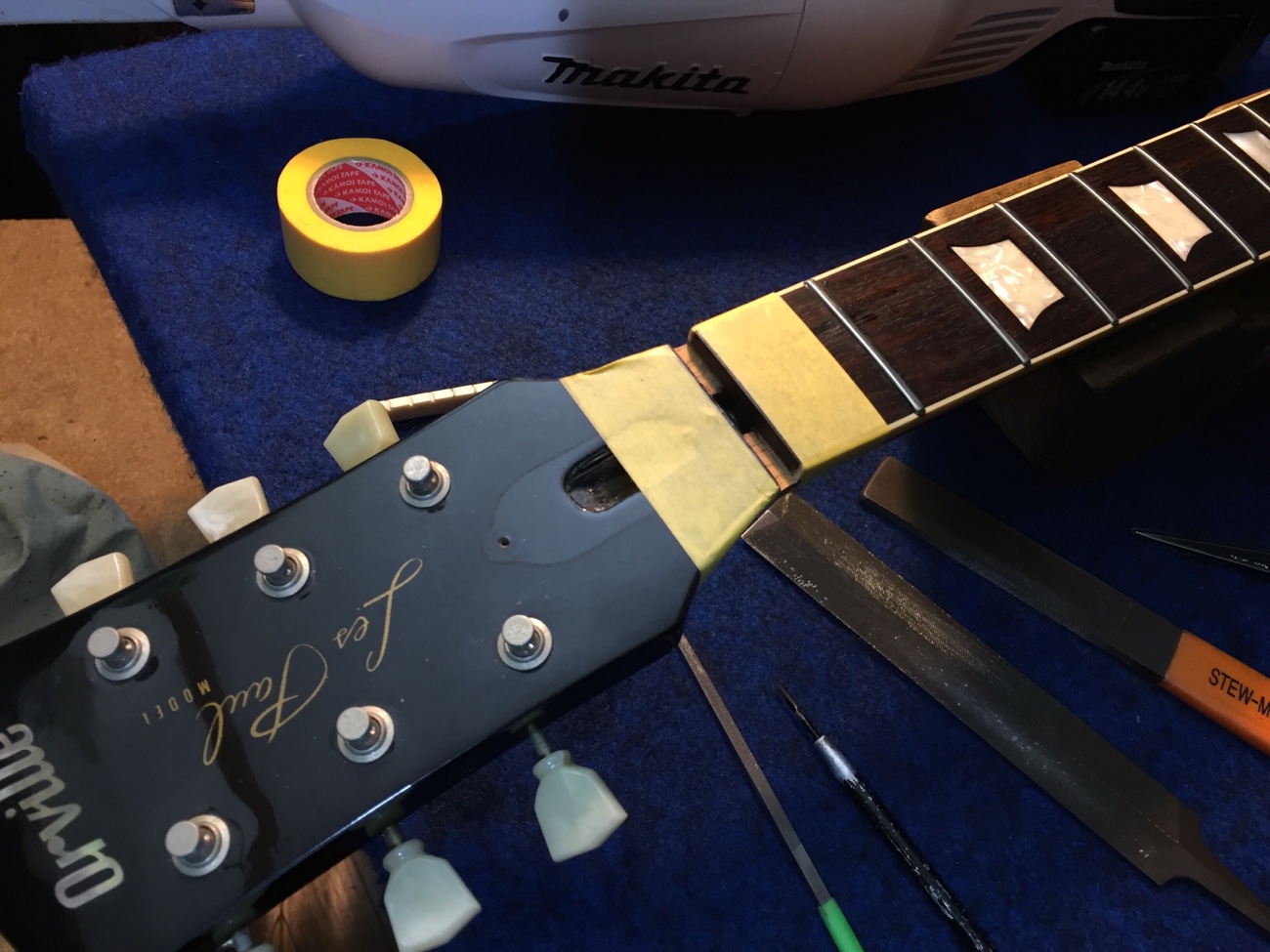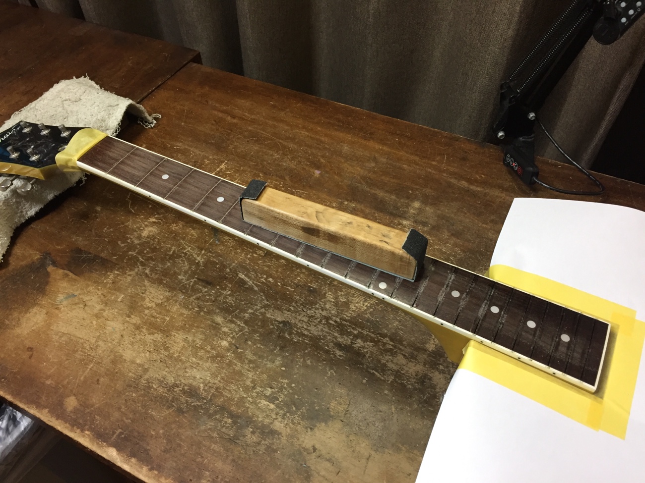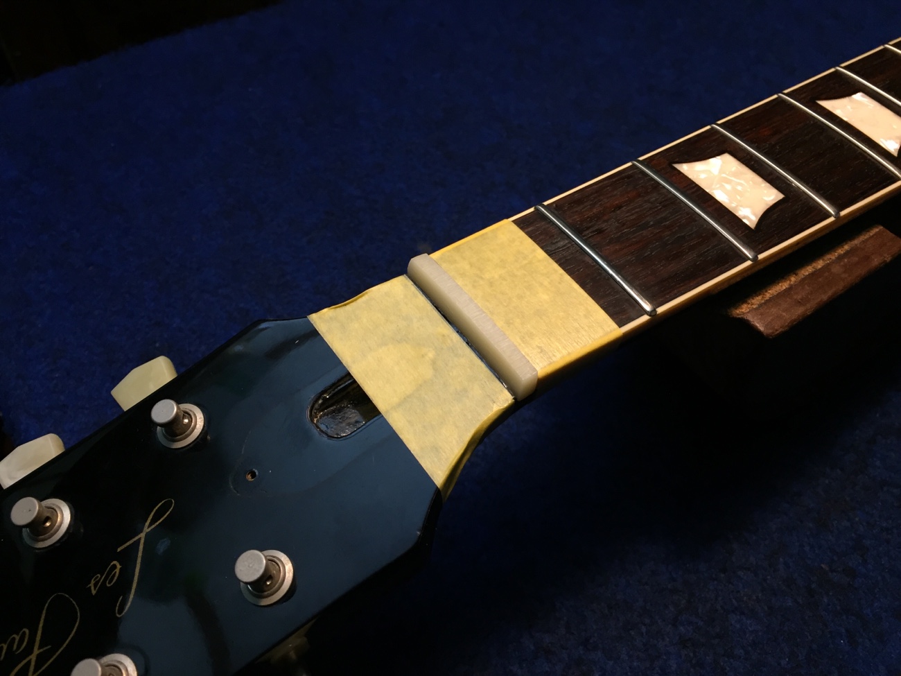 牛骨ナットの接着【Orvilleのレスポールスタンダードの改造-6】 投稿日時: 2025年10月4日 投稿者: admin 埋木を整えました。 ナットを外しました。 溝の中の接着剤を掃除します。 オイル漬けした無漂白牛骨ナットを粗加工して・・・ 接着しました。 Tweet