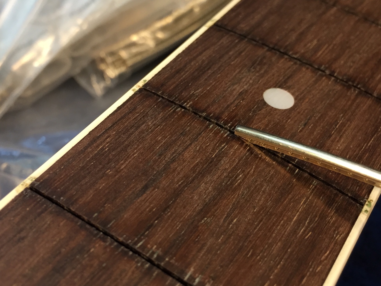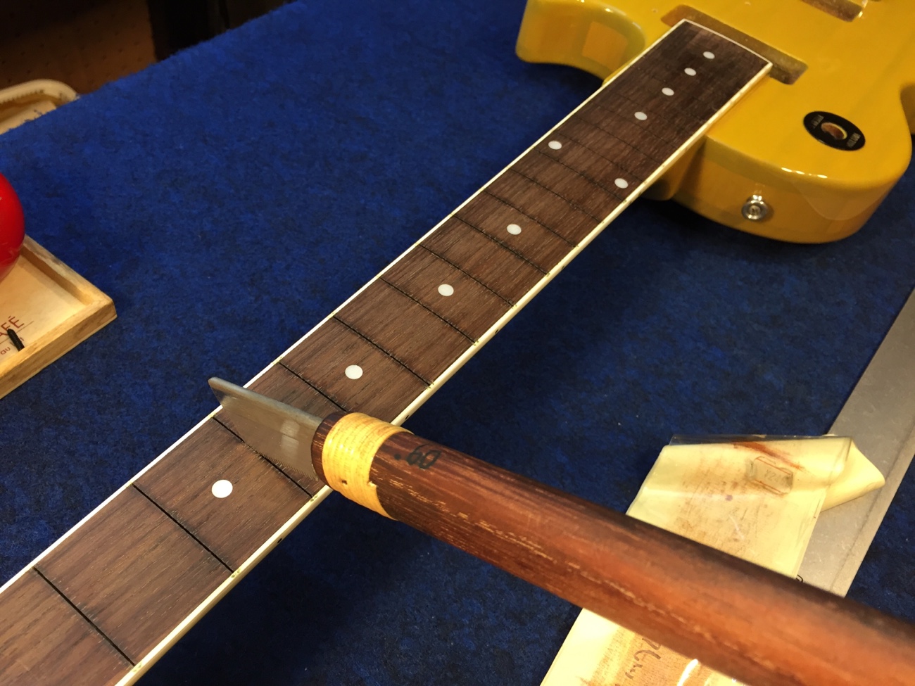 国産フレットに合わせてあるのでしょう、目標のノコよりひとつ幅広のものが入ります。 溝幅をケアしましょう。