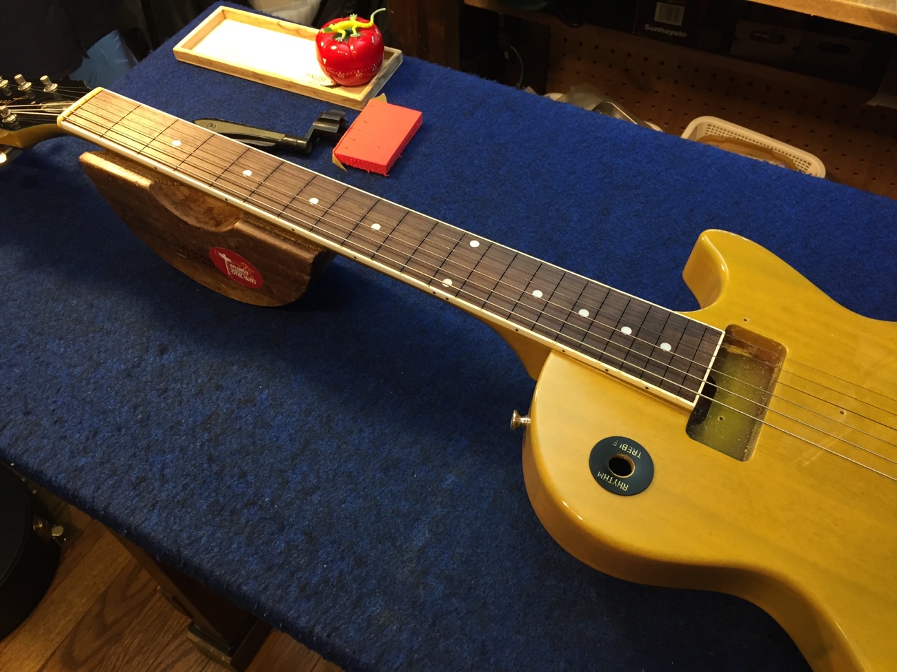 指板の凹凸を無くしておきたいので弦を張った状態で確認します。