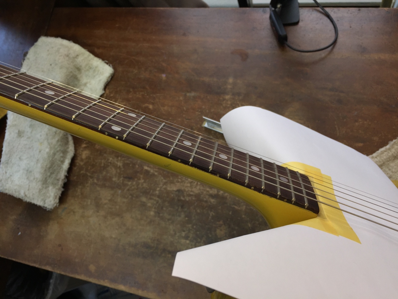 指板研磨【Tokai LSS158 SEB(20250824お預かり)のチューンナップ-6】 投稿日時: 2025年10月10日 投稿者: admin 指板の細かい凹凸を、弦を張った状態で研磨して整えておきます。 フレット溝の幅を調整していきましょう。 取りあえずマスキングまでできました。 Tweet