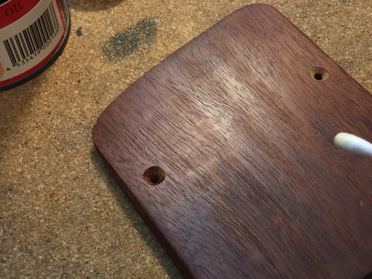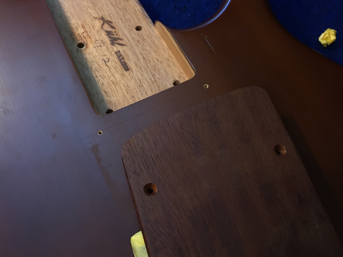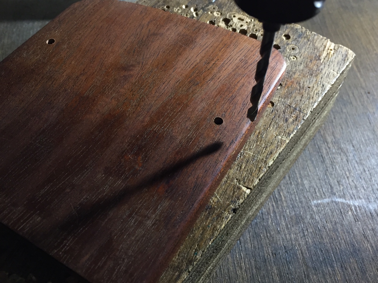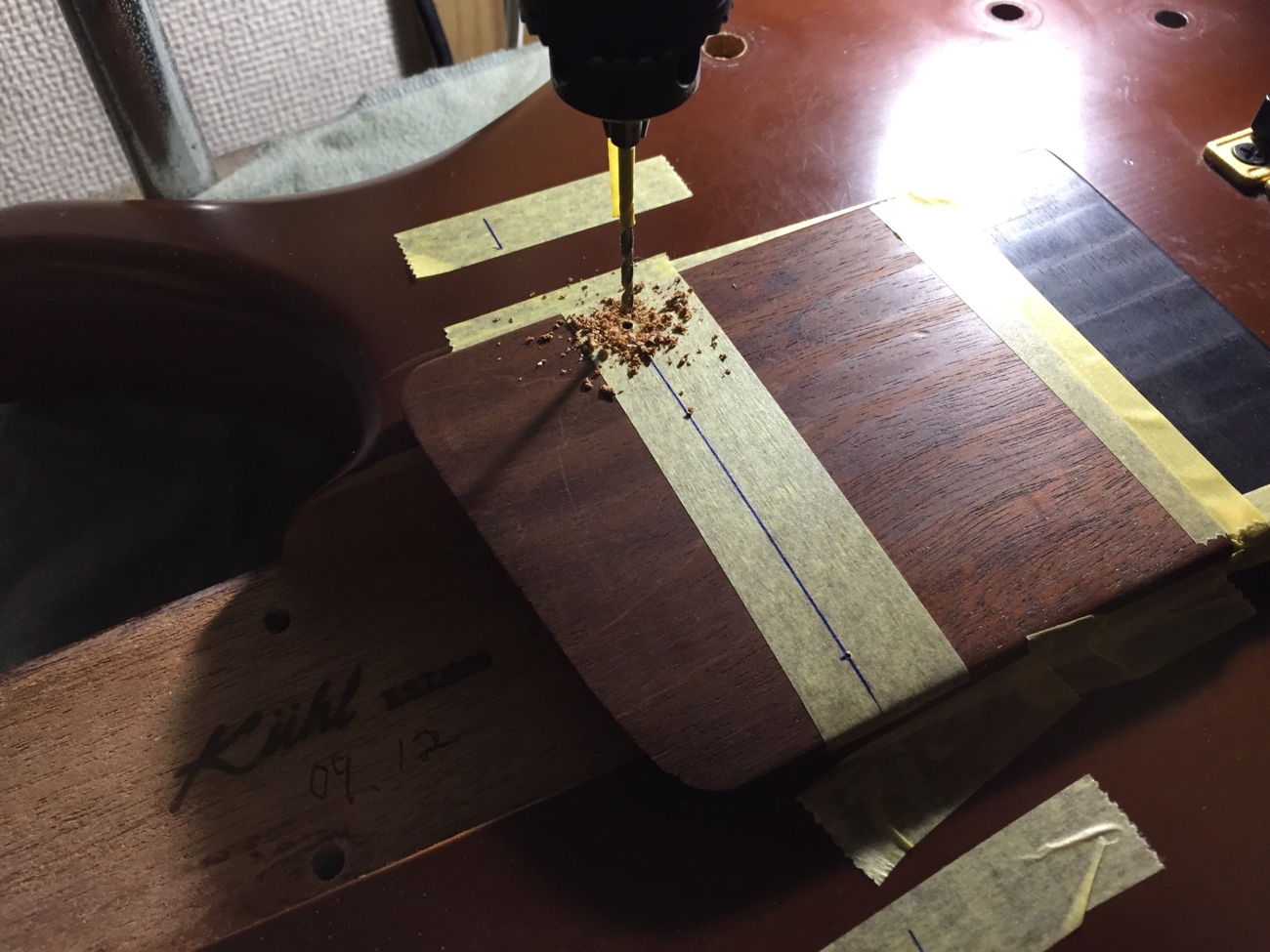 穴あけ【Kiihlの5弦フレットレスベースの改造-16】 投稿日時: 2025年10月10日 投稿者: admin 取り付け位置にガッチリ貼り付けて、部品ごとボディまで貫通させました。 ネジの径より太く拡げて・・・ 面取りしました。 面取りした部分をオイルフィニッシュし直しておきます。 Tweet