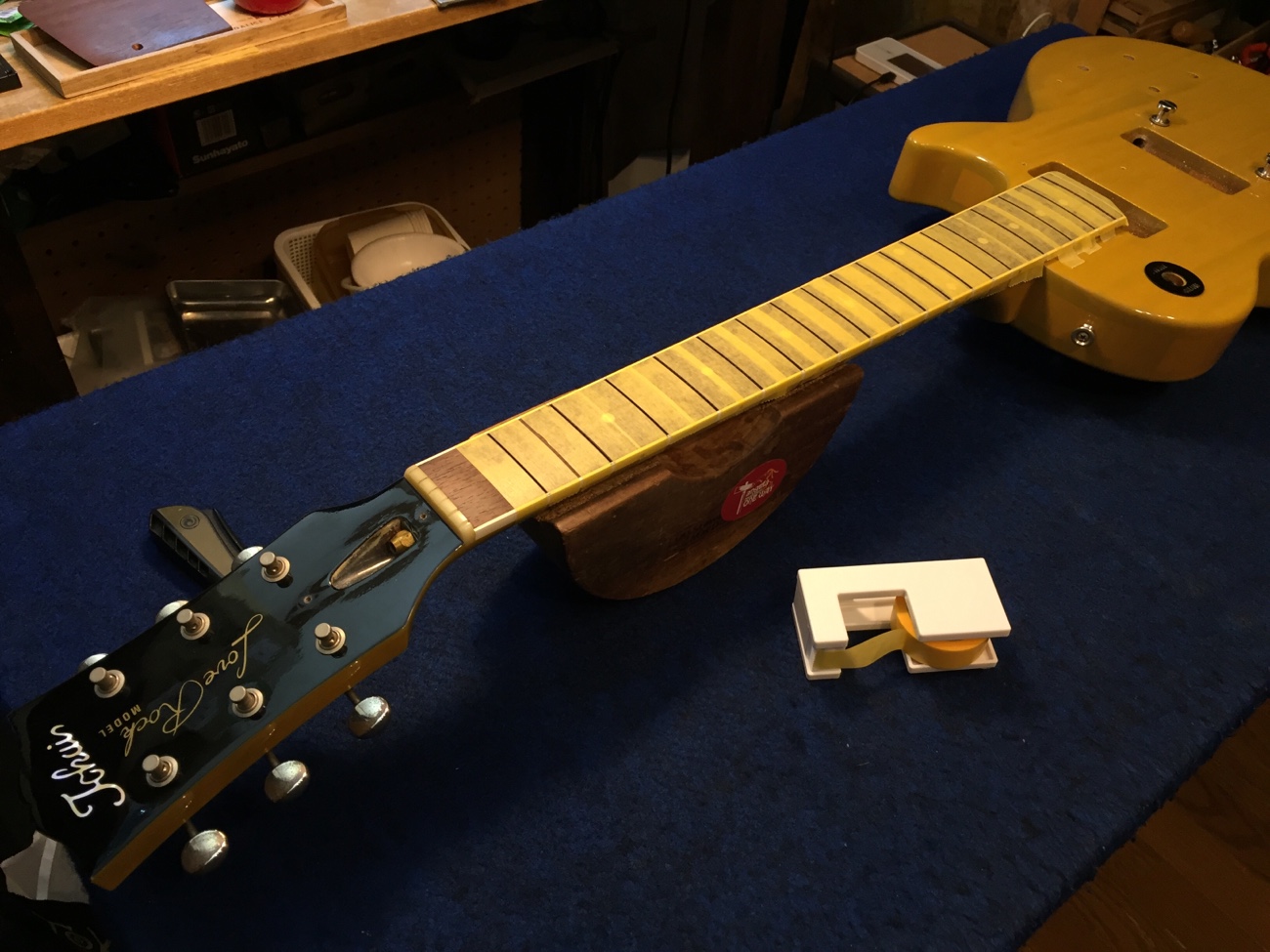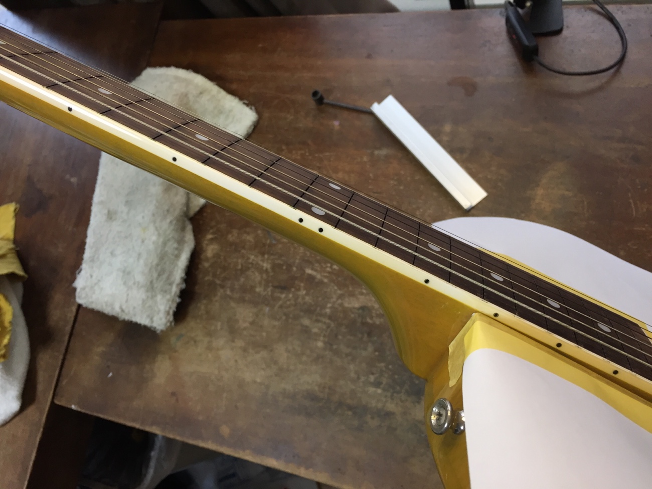 フレットのすり合わせ【Burnyのレスポールジュニアタイプのチューンナップ-36】 投稿日時: 2025年10月10日 投稿者: admin フレットのすり合わせを仕上げていきます。 弦を張った状態で、ギターを構えた角度でフレットの頂点を最終調整します。 Tweet