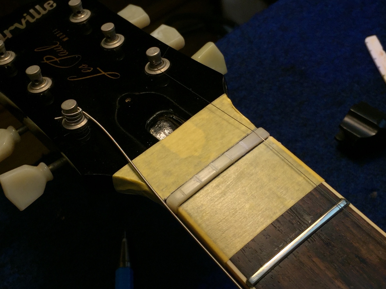 弦溝を作った【Orvilleのレスポールスタンダードの改造-8】 投稿日時: 2025年10月10日 投稿者: admin 弦溝を作りました。 張ってある弦が古すぎるので、深さ方向は新しい弦を張ってから整えることにしてペグの交換に進みましょう。 ゴールドパーツがつき始めると見た目がガラッと変わりそうです。 Tweet