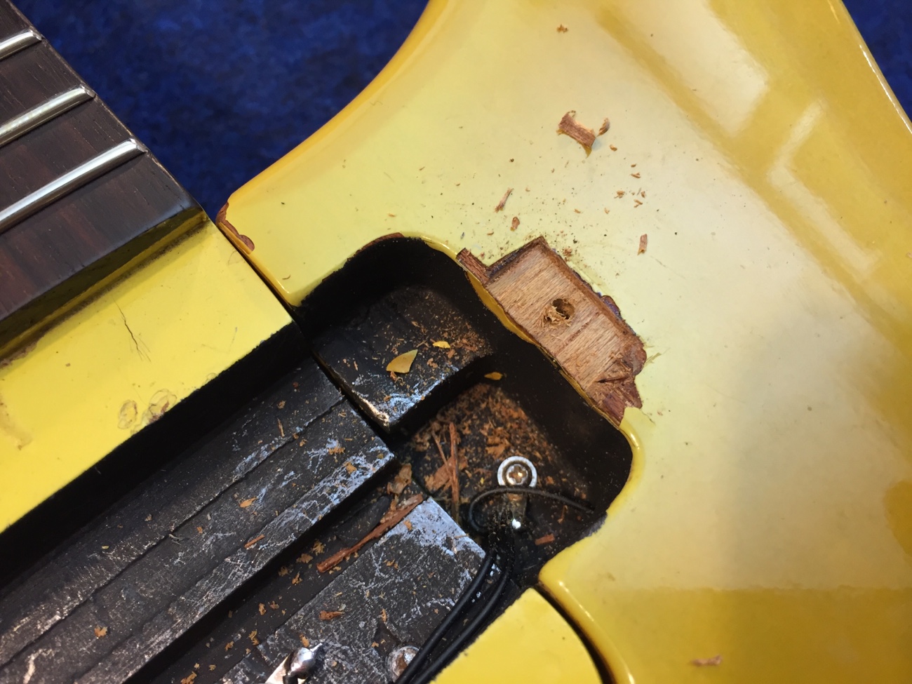 でも今度はネックとポケットの当たり具合が変わって弦が6弦側へよっています。 原因を調べましょう。