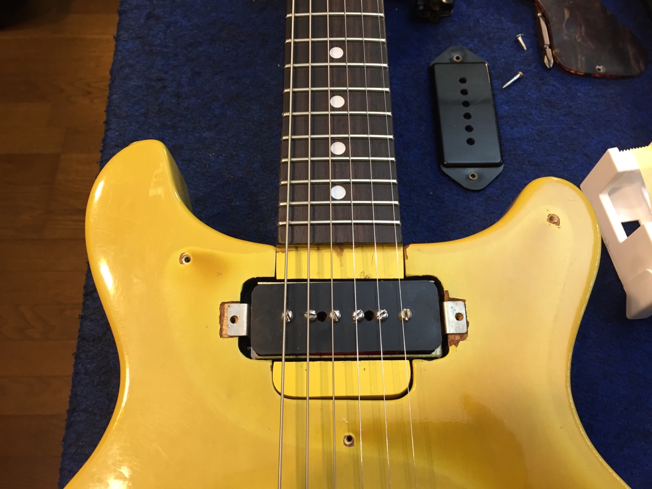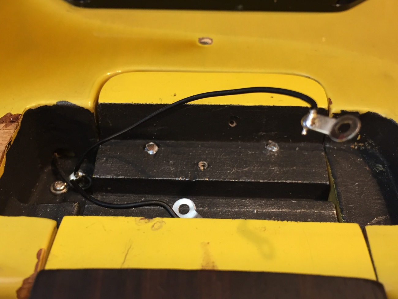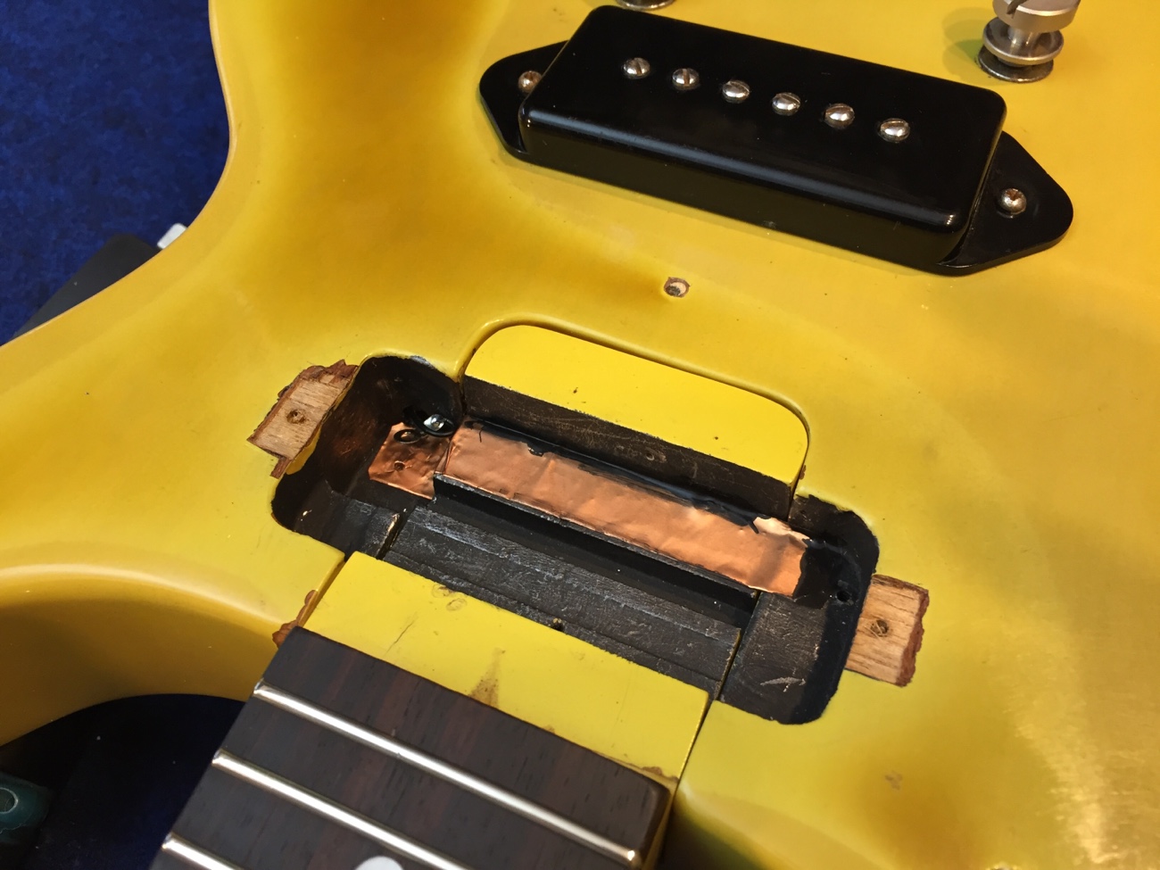 アース線がピックアップに当たるので銅箔テープに交換するしかないみたいです。