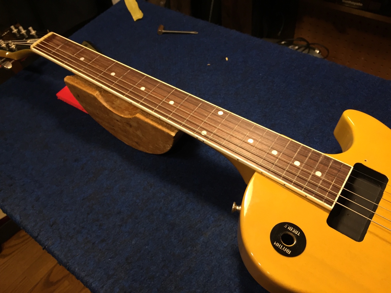 弦を張っておく【Tokai LSS158 SEB(20250824お預かり)のチューンナップ-11】 投稿日時: 2025年11月20日 投稿者: admin 指板研磨を進めるために弦を張って一晩おいておきます。 張力をかけた状態でトラスロッドを効かせて、指板の状態を確かめましょう。 Tweet