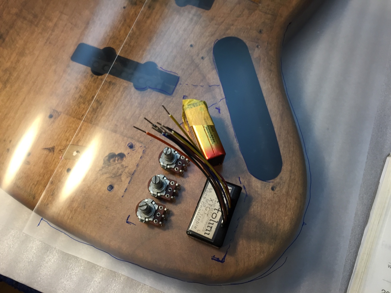 キャビティを検討中【Moon5弦にXTCTを増設する-4】 投稿日時: 2025年11月21日 投稿者: admin 使用するポットはA500kΩとかなのでスイッチポットが使えそうです。 ピックアップや弦アースなどの配線が通っているトンネルが既にあるので、線の取り回しも考えつつ、こんな感じになりそうな気がしています。 透明なテンプレートを作っておいて裏側にあててチェックして、間違いの無いように掘り込みます。 Tweet