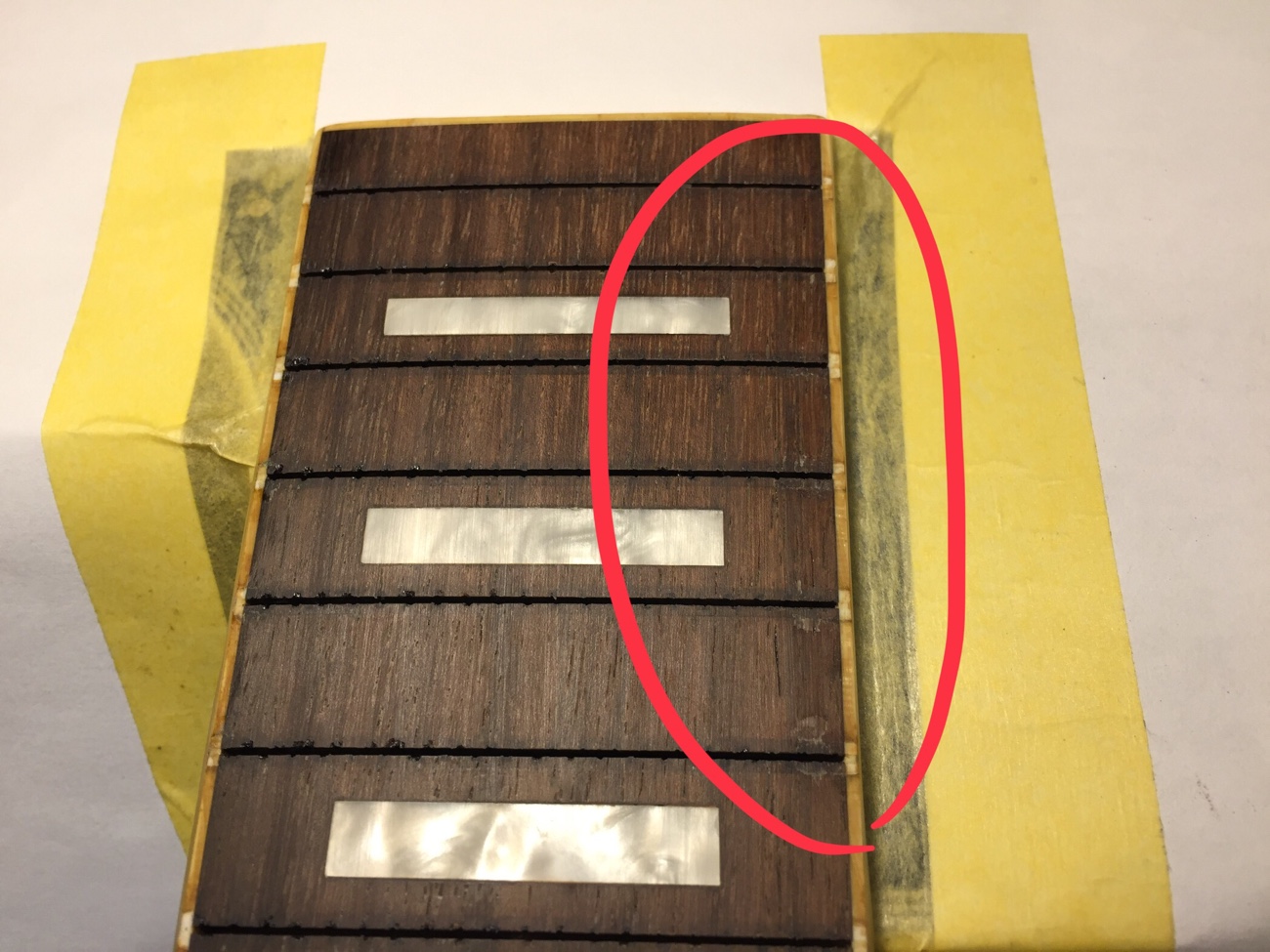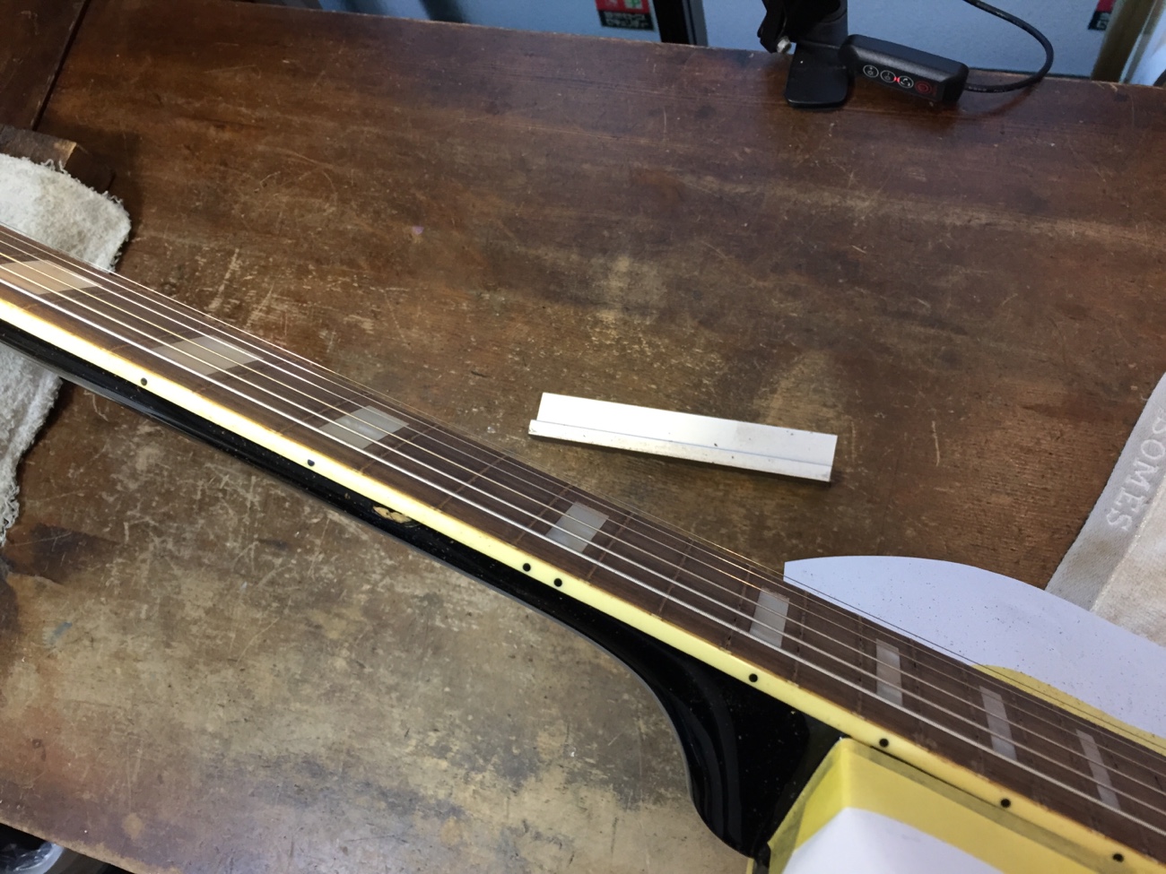 指板研磨する【Laid Backのレスポールカスタムタイプのチューンナップ-10】 投稿日時: 2025年11月21日 投稿者: admin ヒーターがとても良いところに効いてくれたので指板研磨していきます。 6軒のハイポジションのRがくずれているのが分かります。 ここはフレット溝を補修するついでに接着剤を足して盛り上げておきましょう。 ネジが錆びだらけになってネジ頭がダメになってしまっているエスカッション周りは全て新しいネジに交換します。 エスカッションのネジがひとまわり細くなるので、リア側も埋めてあけなおすかもしれません。 Tweet