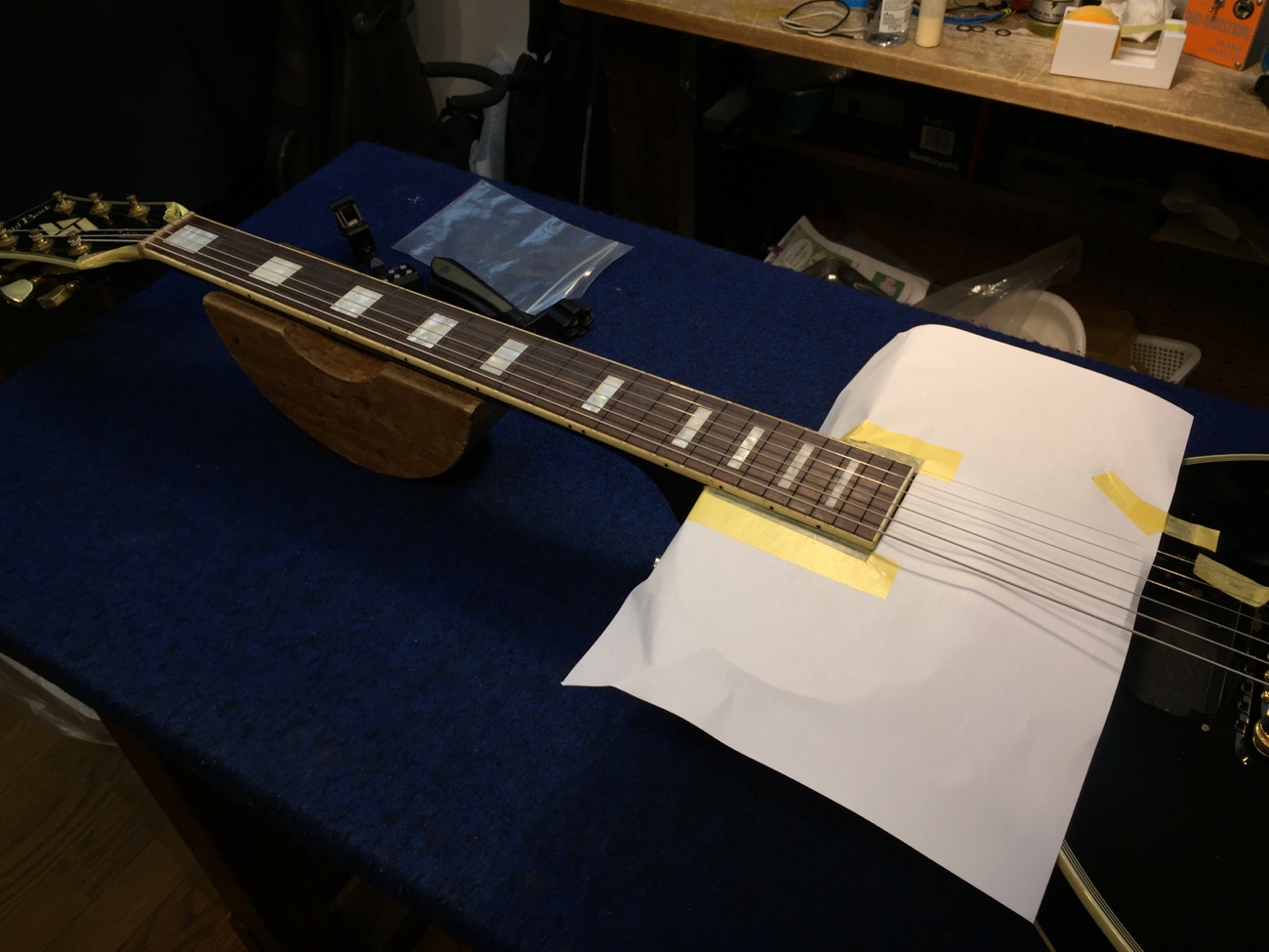 フレット溝を仕上げる【Laid Backのレスポールカスタムタイプのチューンナップ-13】 投稿日時: 2025年11月27日 投稿者: admin 打ち替えるフレットのタングに合わせてフレット溝を仕上げました。 弦を張っておきましょう。 弦を張った状態で指板の凹凸を最終チェックして指板研磨を完成させます Tweet