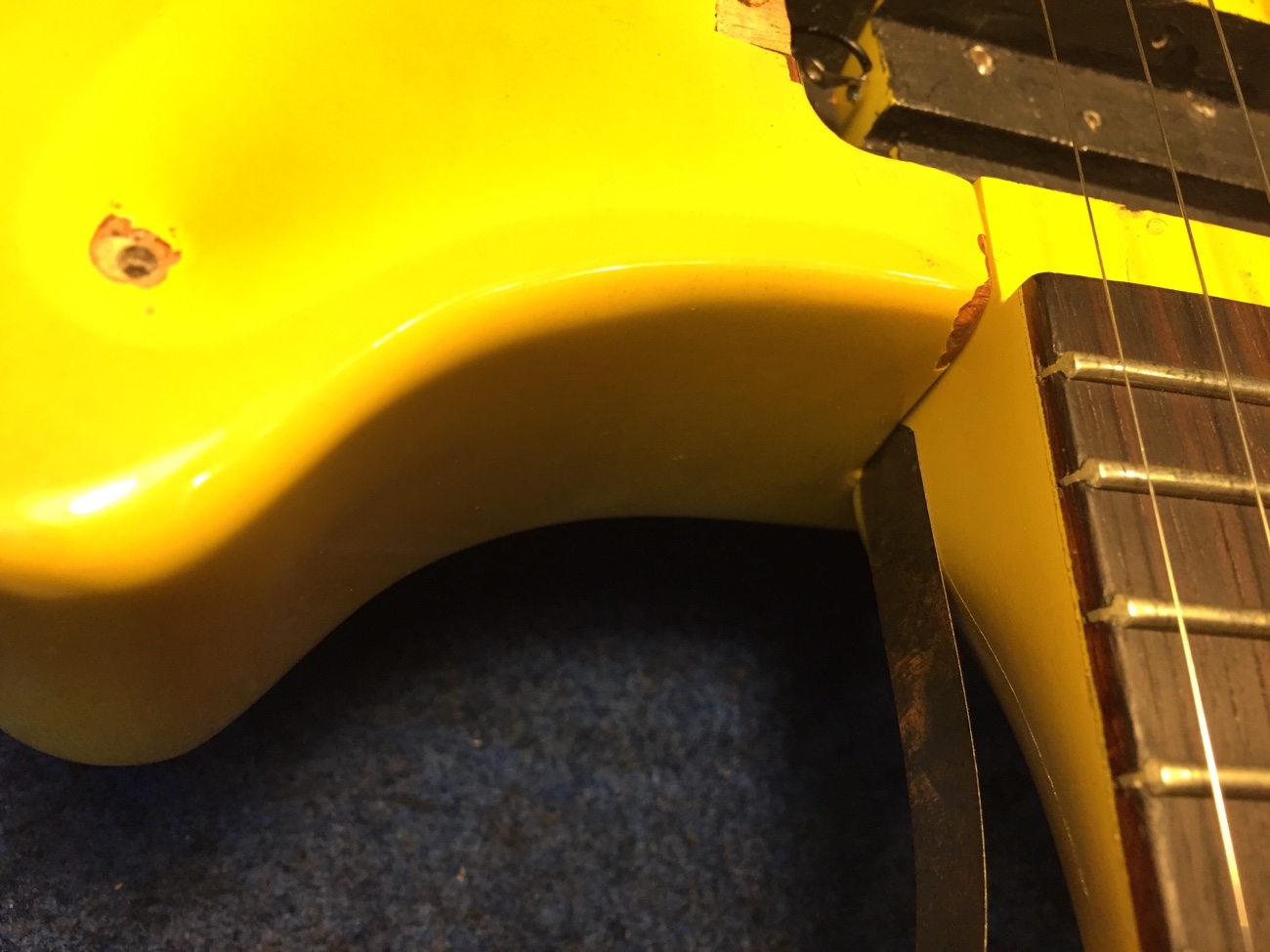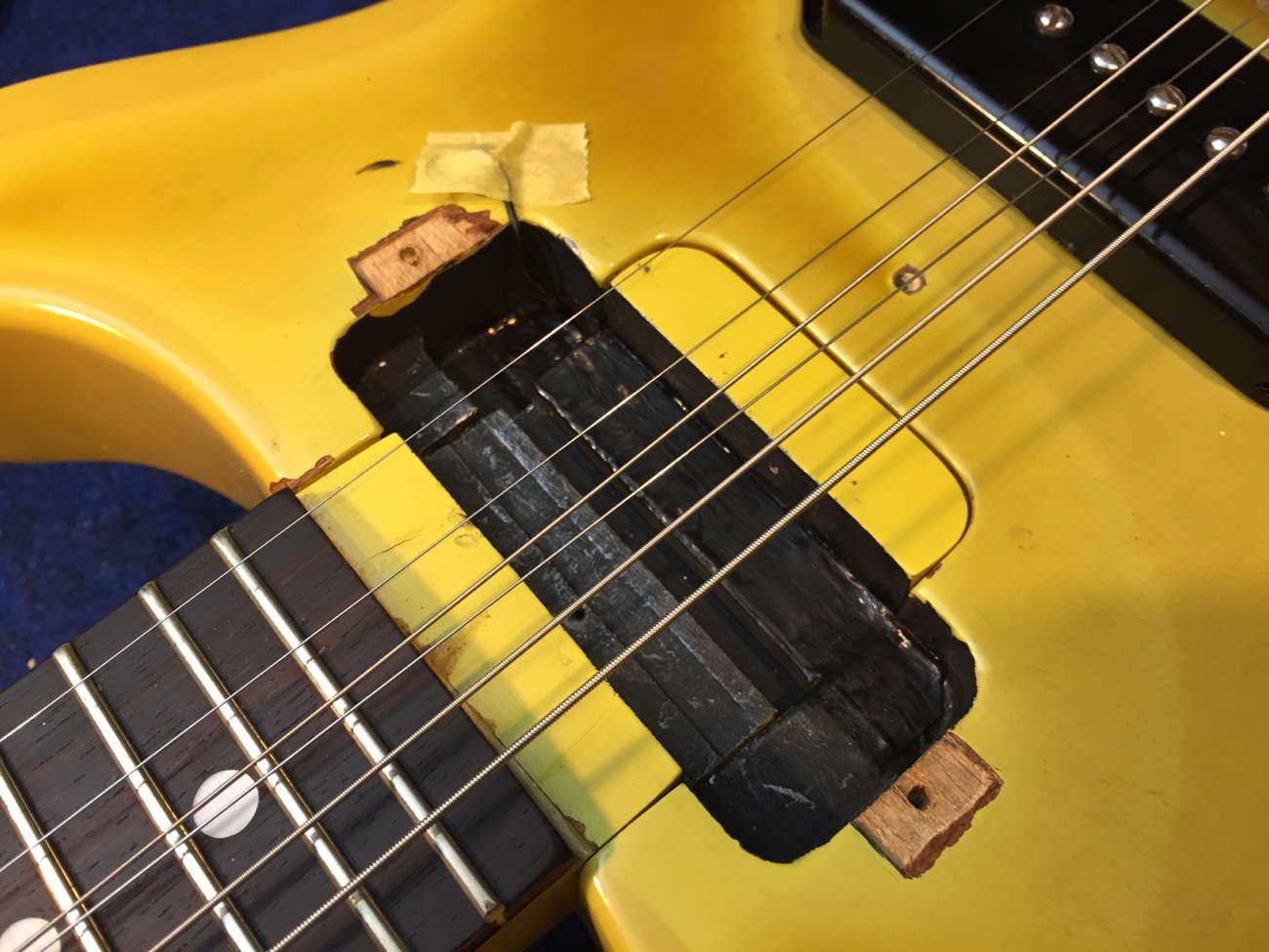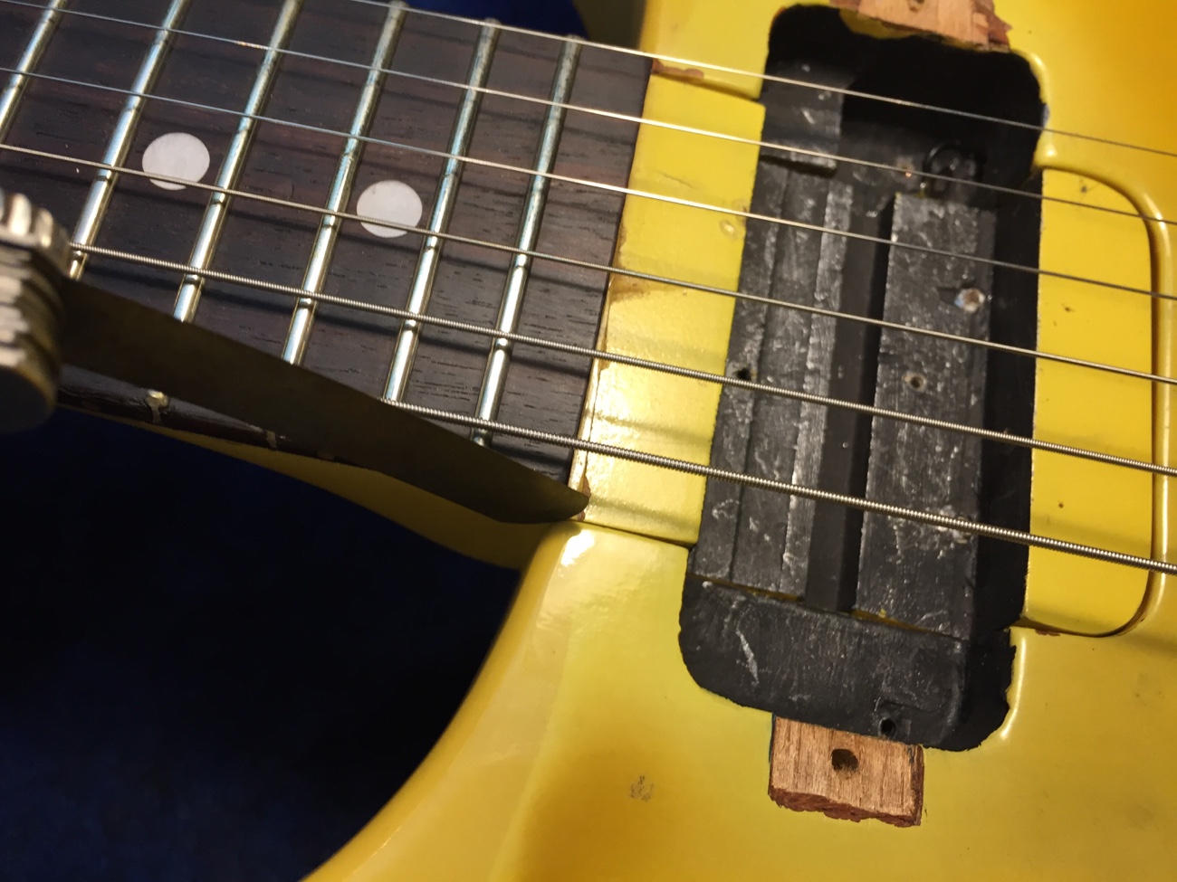 シムの追加【Burnyのレスポールジュニアタイプのチューンナップ-47】 投稿日時: 2025年11月27日 投稿者: admin ネックの角度を調整していきます。 ポケットのいろいろな部分の隙間を調べています。 ネックがどっちに行きたがっているのかが分かってきました。 ここに隙間を作って上げるとヘッドが6弦側に振られて、弦が良い位置に来るようです。 ここでネックを受け止めます。 銅箔テープに導電塗料を塗って分断されているフロントピックアップキャビティの導電塗料をつなぎました。 これで上手くいくと良いですね。 いよいよ完成が近づいてきました。 Tweet
