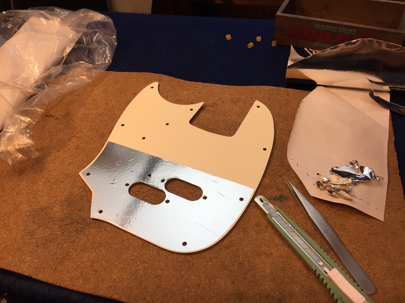 配線のオーバーホール【フェンダーメキシコ製ムスタングベースの改造-3】 投稿日時: 2025年12月23日 投稿者: admin ピックガードの裏側にアルミシートを貼ってシールドしていきましょう。 こんな感じになりました↓ コントロールパネルのところからアース電位に導通刺せようと思います。 部品を全て交換して、配線を引き直しました。 Tweet