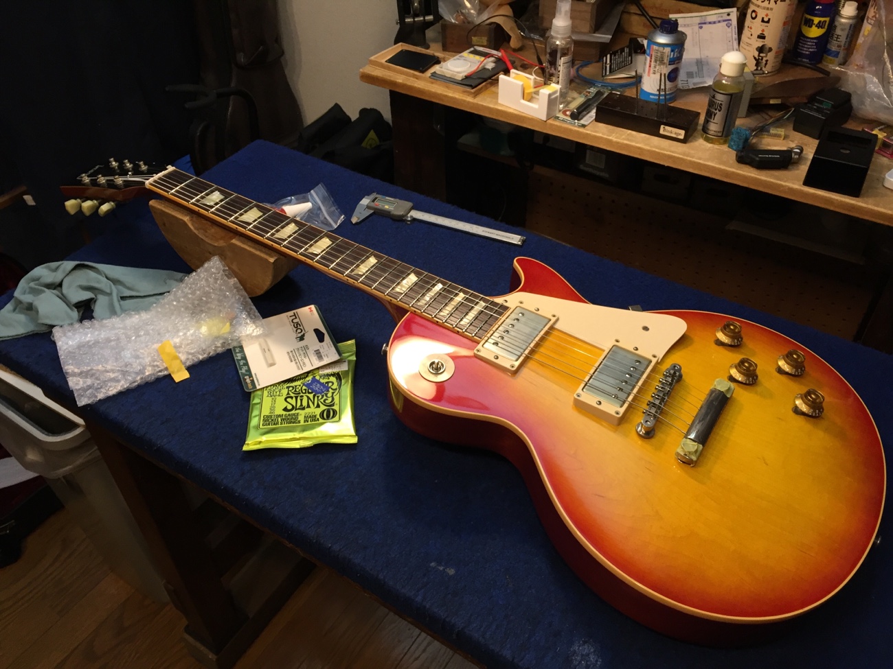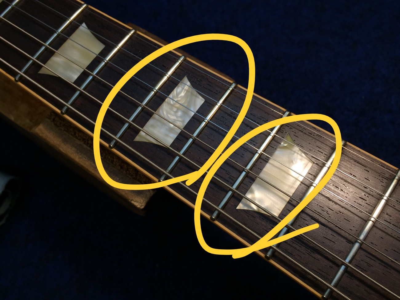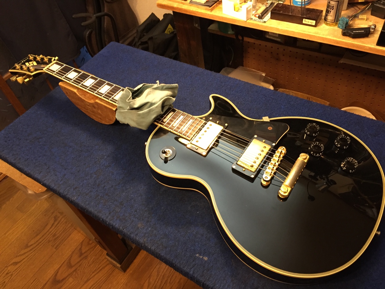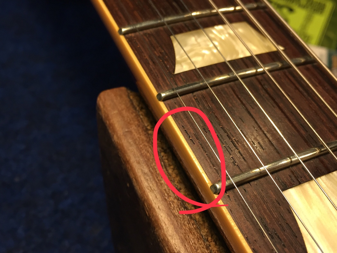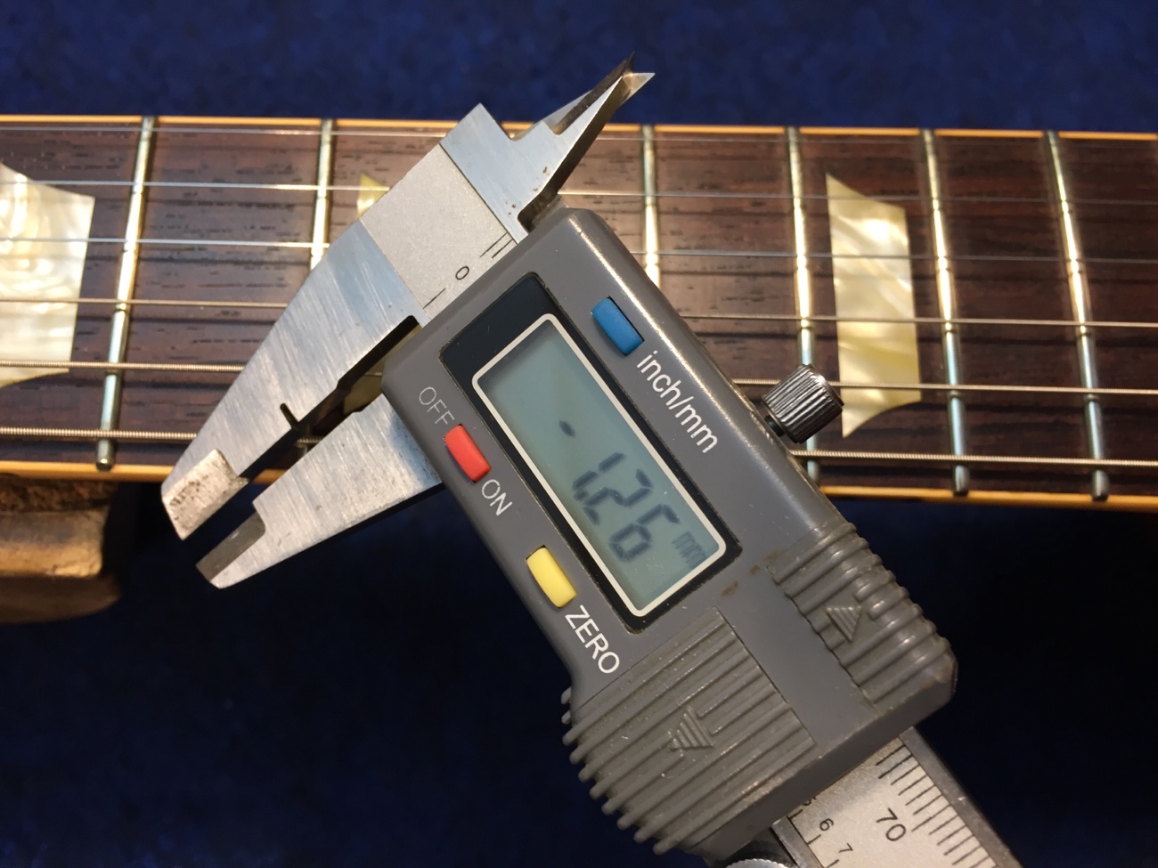 フレットが高くて手になじまないそうなので、これを1.0~1.1mmくらいまで削ることになっています。 その過程で、弦を張った状態でフレットの頂点がそろうようにすり合わせします。