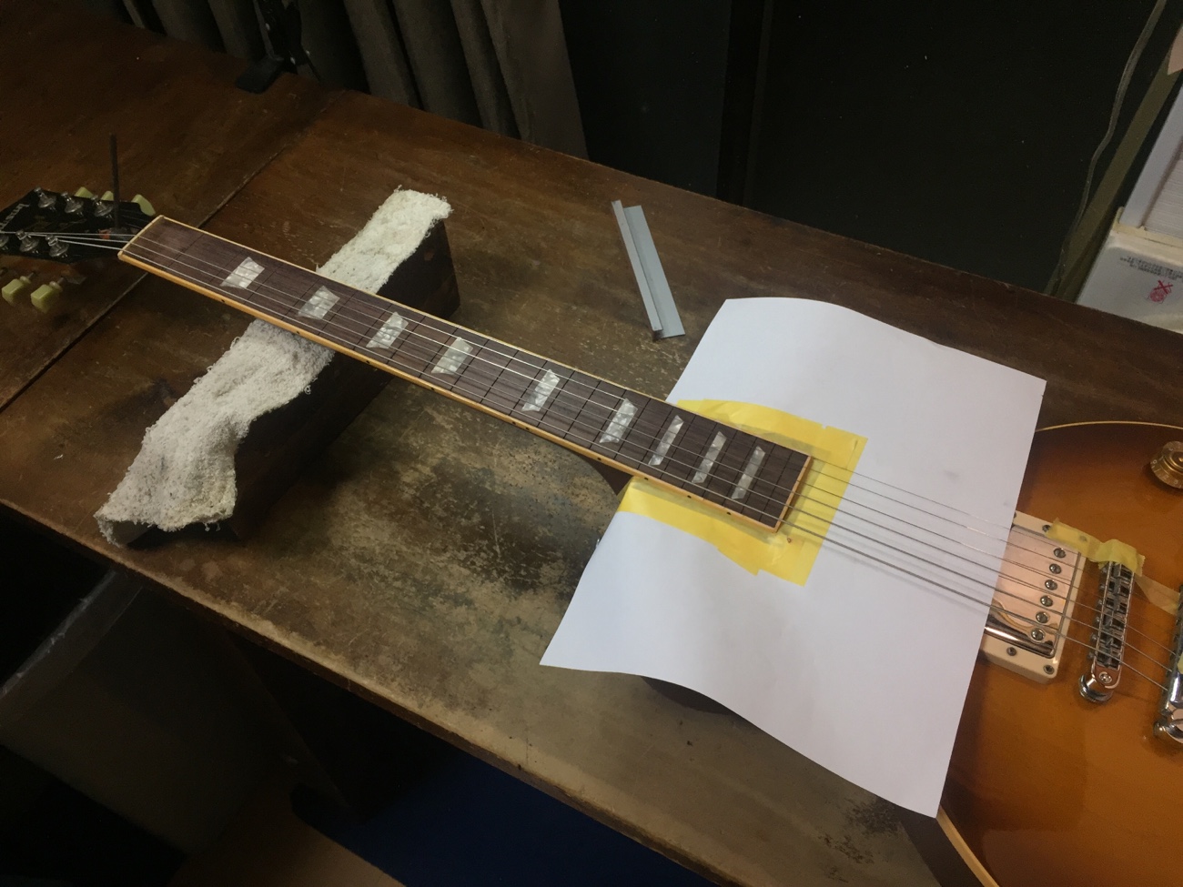 指板の研磨【ギブソンレスポールスタンダード(20251231お預かり)ネックのオーバーホール-15】 投稿日時: 2026年1月25日 投稿者: admin 4フレット付近にある凸を削ってそろえました。 フレット溝の幅を整えつつ、指板のRを整えていきます。 Tweet