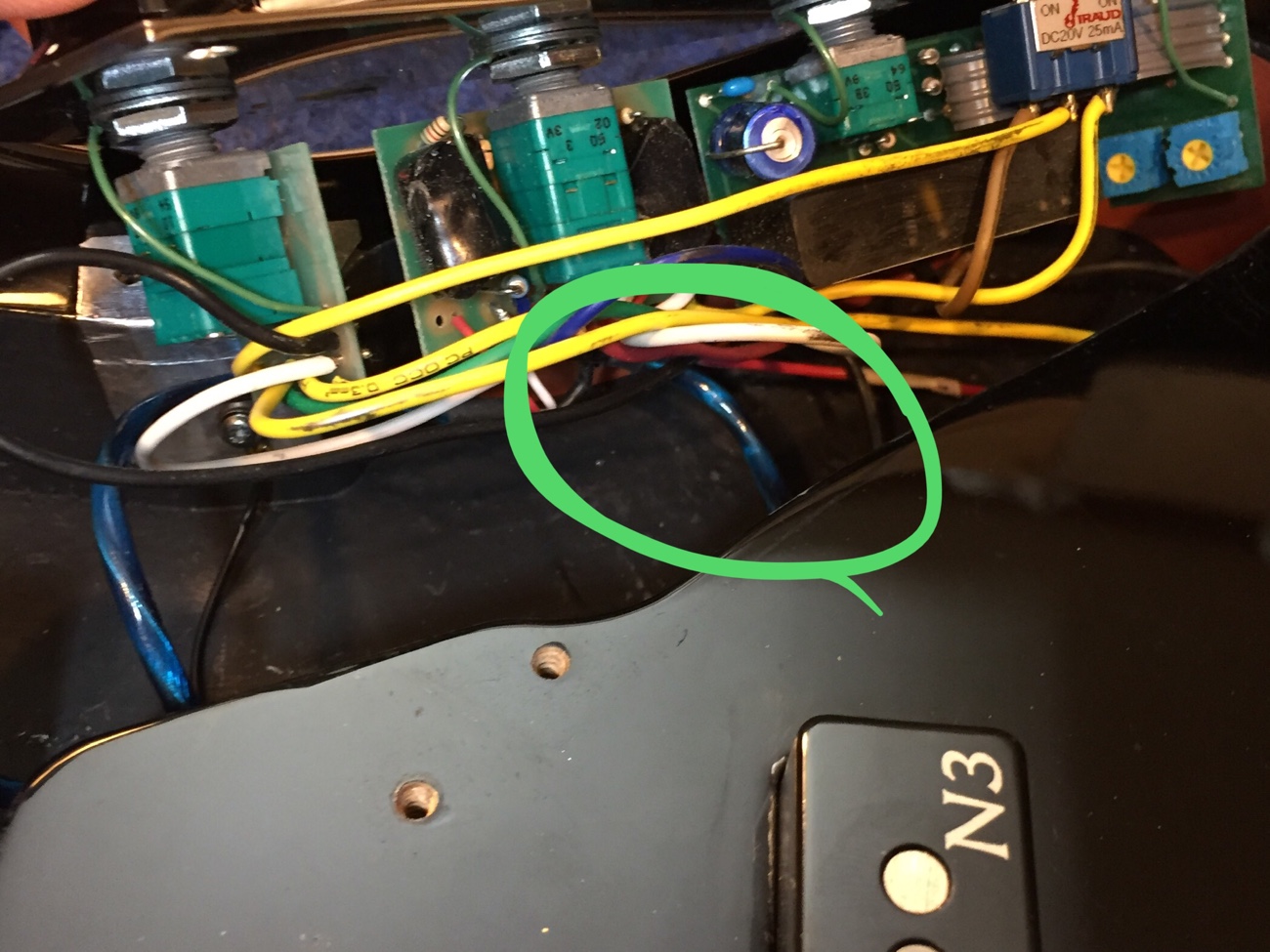 それはそうと、リアから来るピックアップの線が太すぎて基板に挟まってパネルが閉まりにくいですね。 導電塗料でシールドしましたし、普通の2本線に交換しても良いのですが、基板がブラックボックスでしかも取り付けを間違えている可能性があるのでやっかいです。