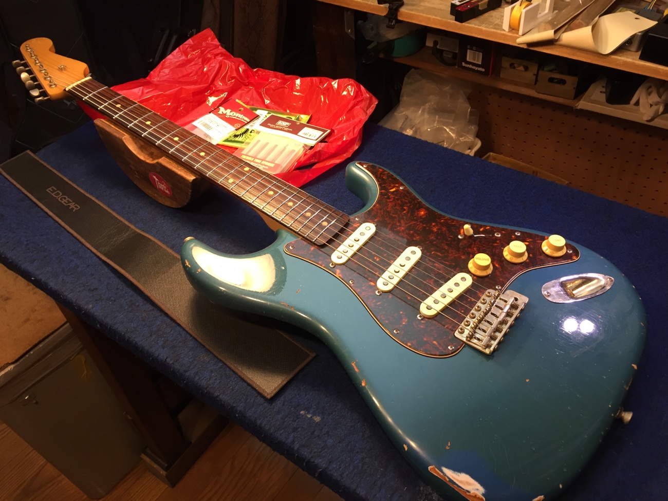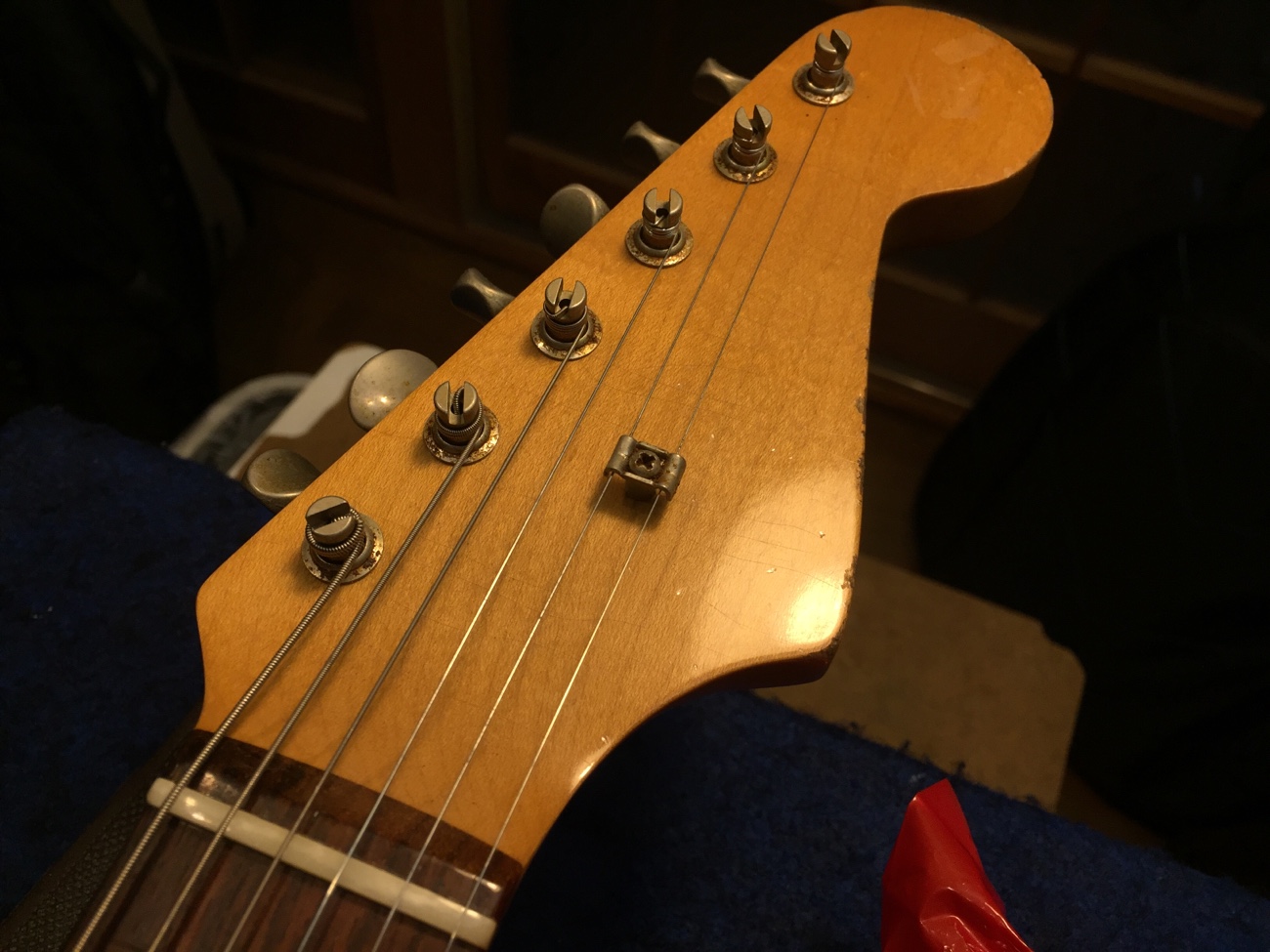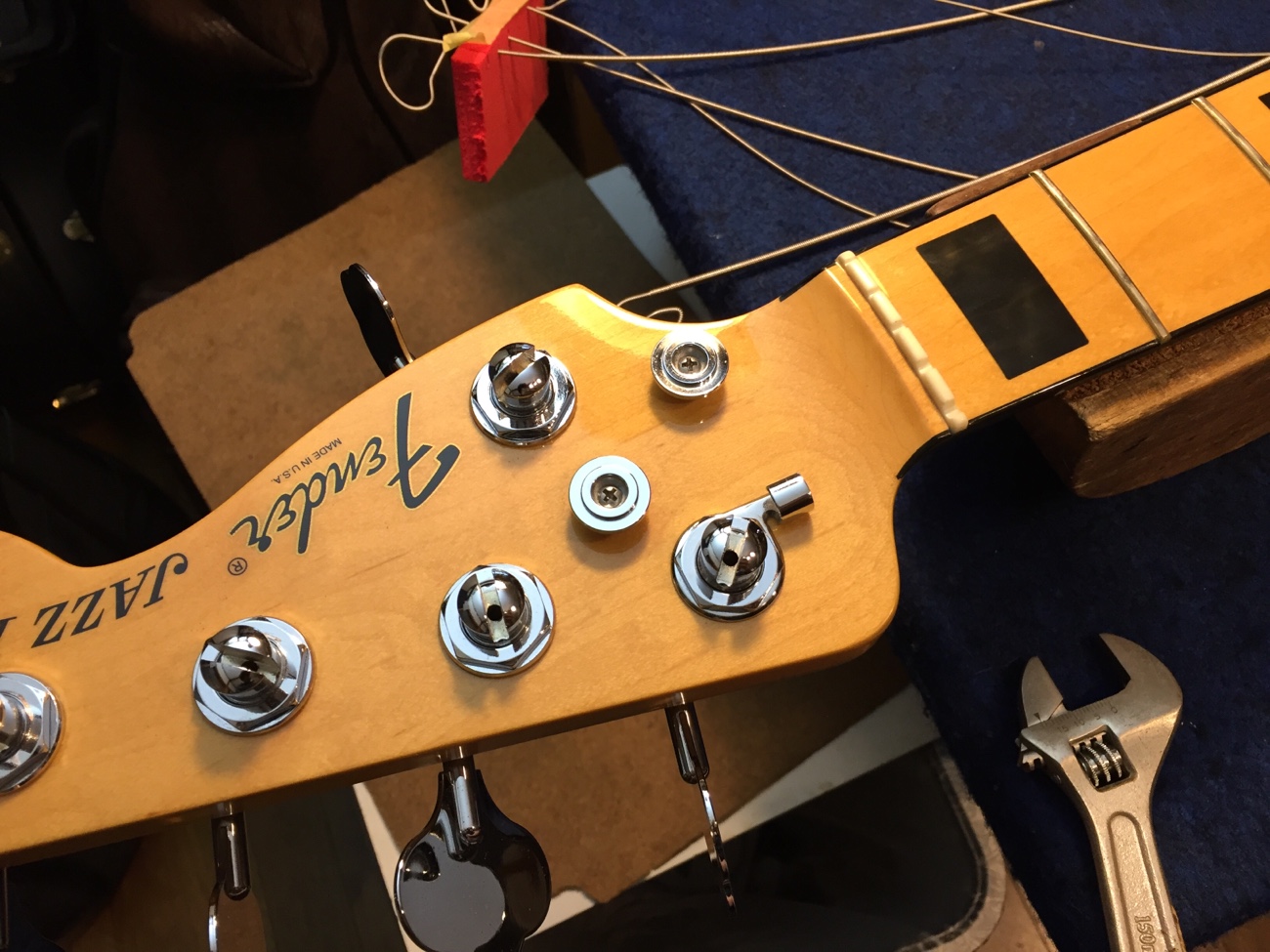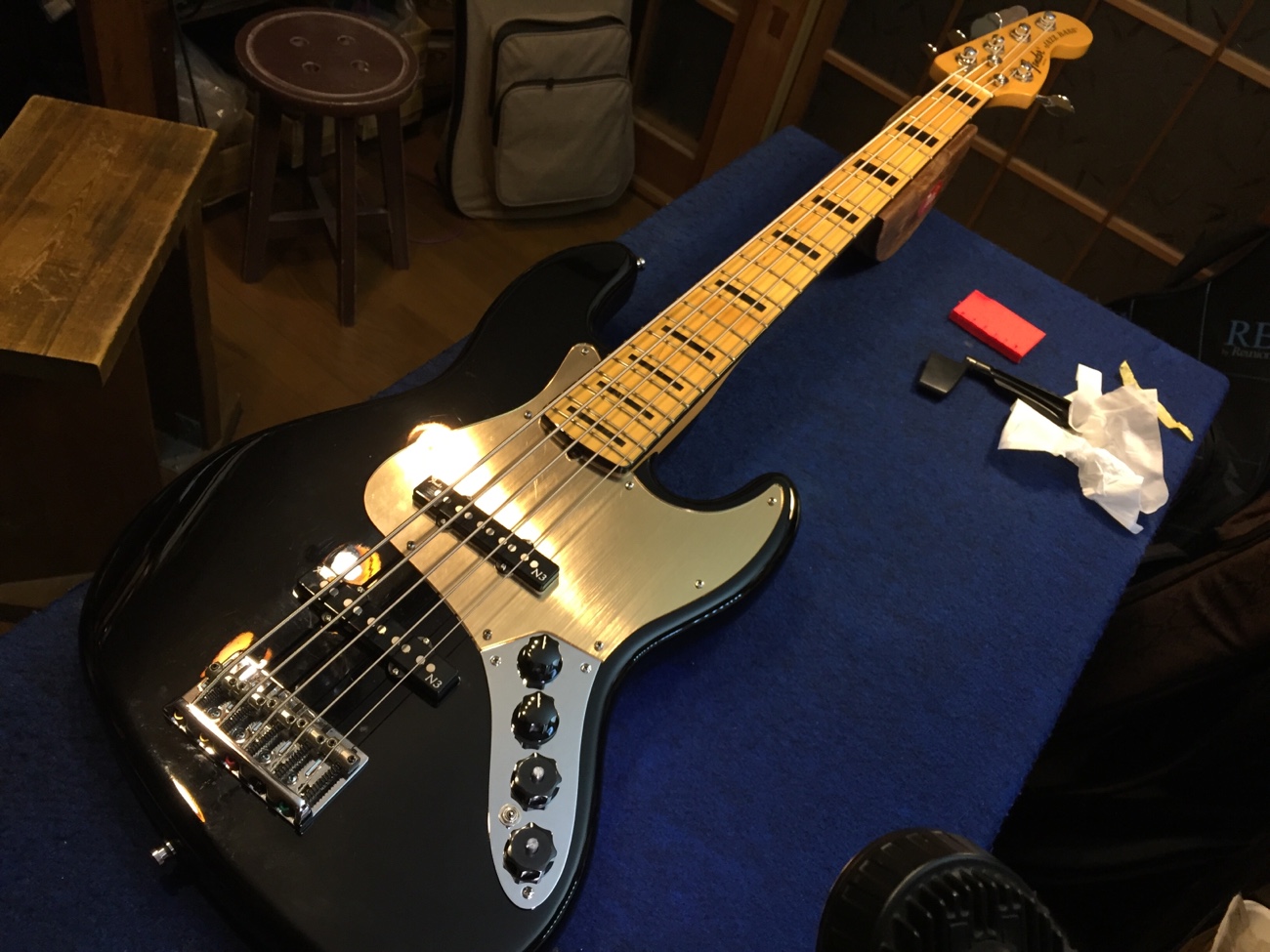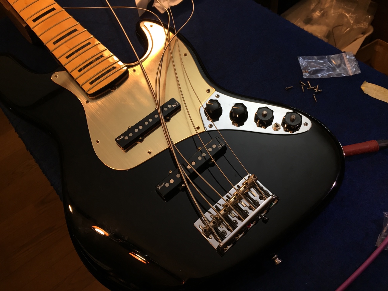 部品を戻して音出ししてみます。 それぞれのピックアップ内でふたつのコイルがノイズを打ち消すせいか、不思議な音域に残留ノイズが聞こえますが、まあまあ常識的な範囲に収まったと思います。
