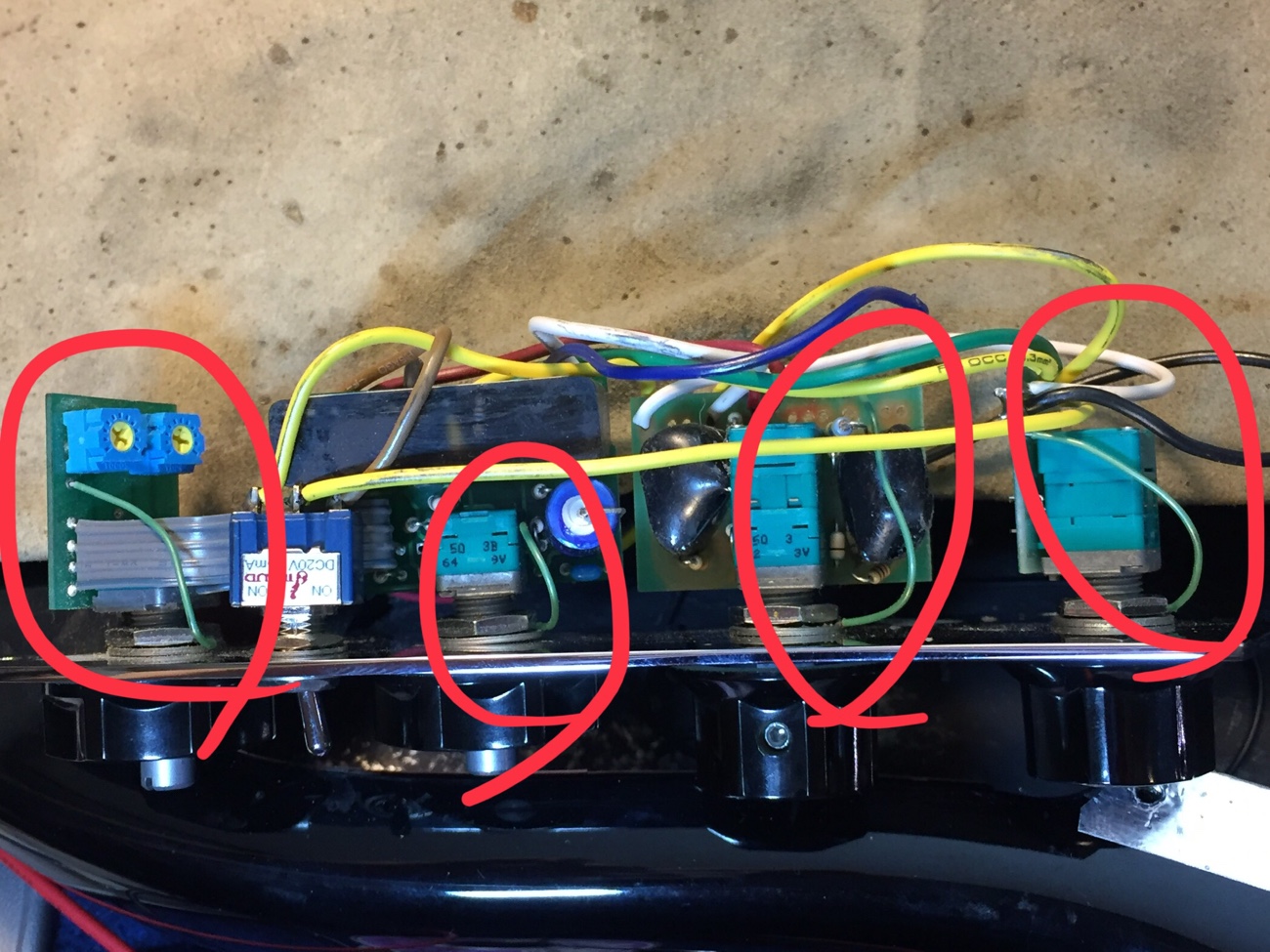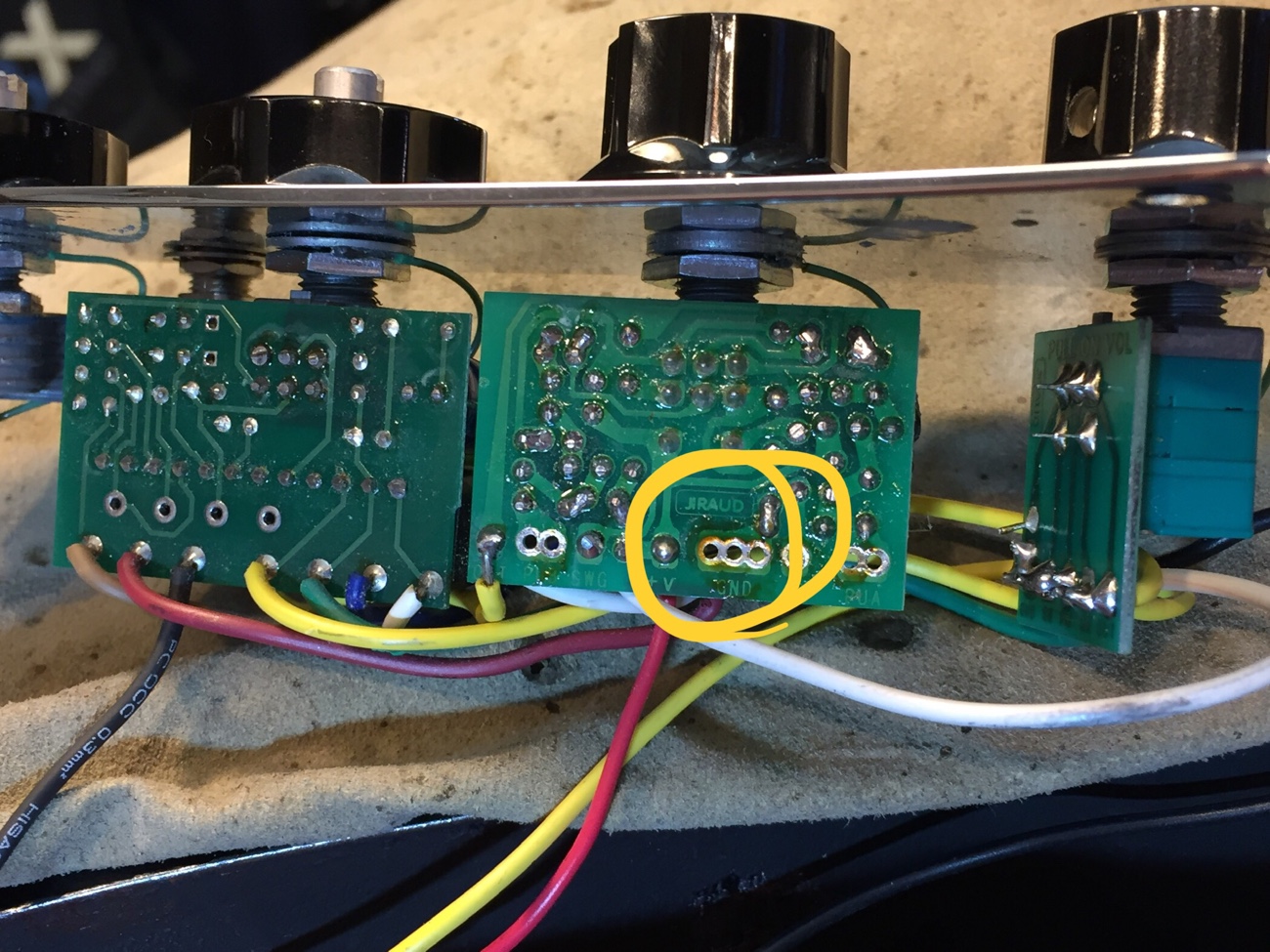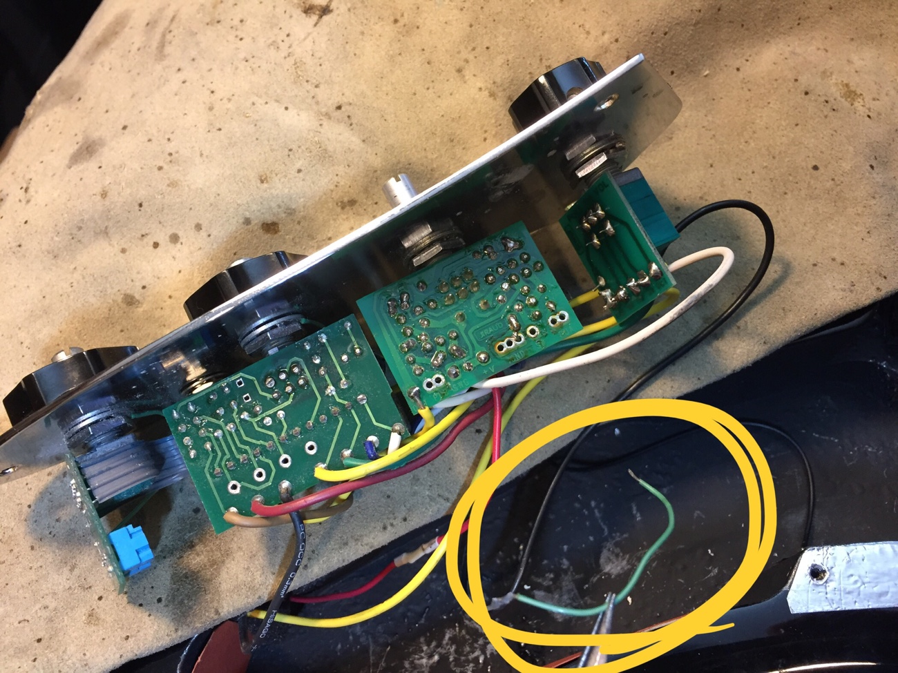 各ピックアップからくるコールド線が2本、隣の基板のグラウンドとつなぐ青い線が1本、基板をコントロールプレートにつなぐ緑の単線が1本。 合計4本がつながるのに穴が3個しかありません。 元はコールドどうしをよってまとめてから差し込んでありました。 元のものよりしっかりした出力線に交換したので同じことはしたくないです。
