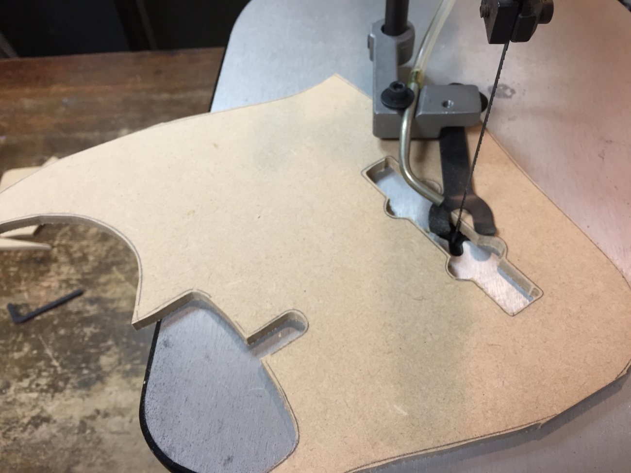 ピックガード製作を開始【Moon5弦にXTCTを増設する-12】 投稿日時: 2026年2月27日 投稿者: admin パール柄のピックガードを製作して登載することになりました。 ピックガードそのものをテンプレートにしますが、直接ピックガード材を加工するのはピックガードのエッジがベアリングビットの不具合で溶けたりしたときにもったいないことになりますから、MDF合板をカットしてテンプレートを作りましょう。 糸のこ盤でのカットを先に済ませます。 Tweet
