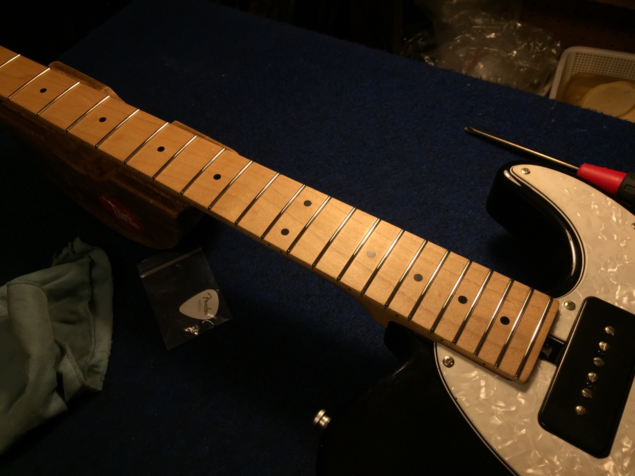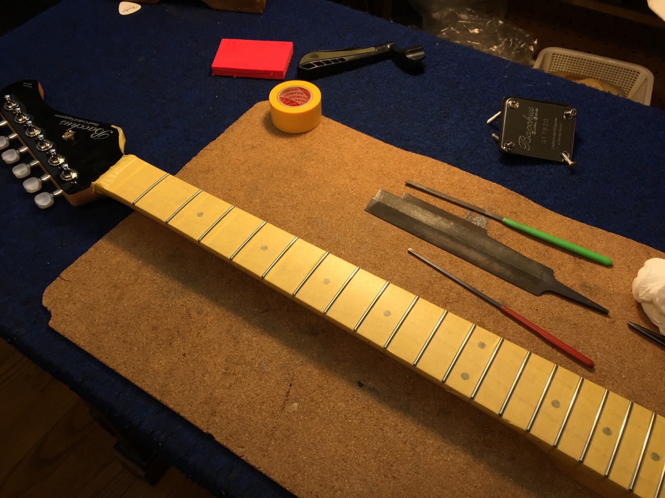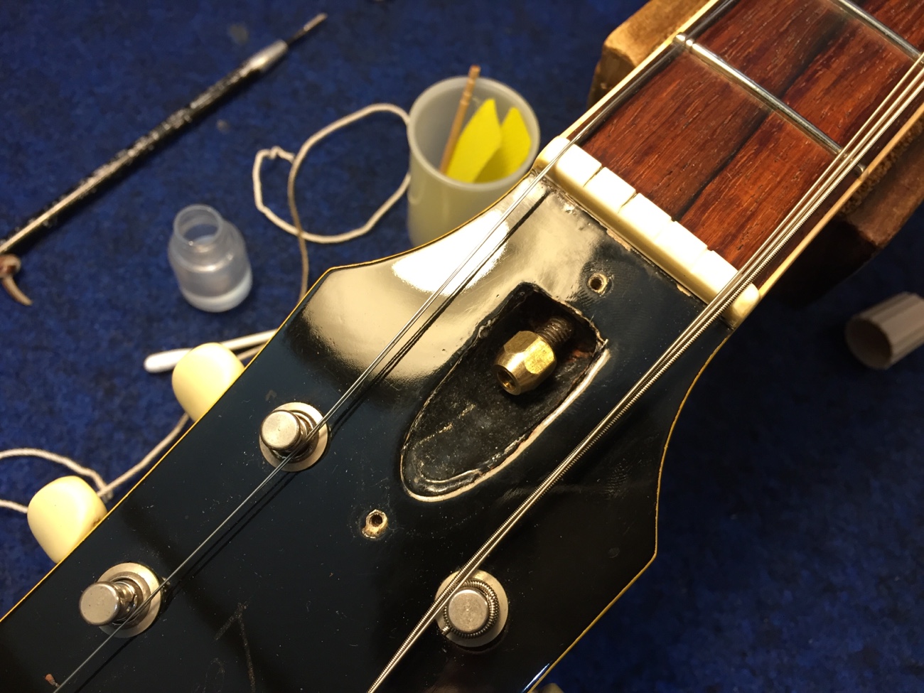 ロッドナットを交換してみた【レスポールスペシャル(20260131お預かり)のブリッジ交換-7】 投稿日時: 2026年3月1日 投稿者: admin 新品のロッドナットが届いたので交換してみました。 ロッド側のネジの錆び取りをしたこともあってスムーズに動きます。 ネックの順反りが気になります。 ロッドをけっこう締め込んでやっと真っ直ぐ。 ・・・かといってヒーター修正だけしてもまた戻るかも知れませんし、リフレットの時で良いような気もします。 Tweet