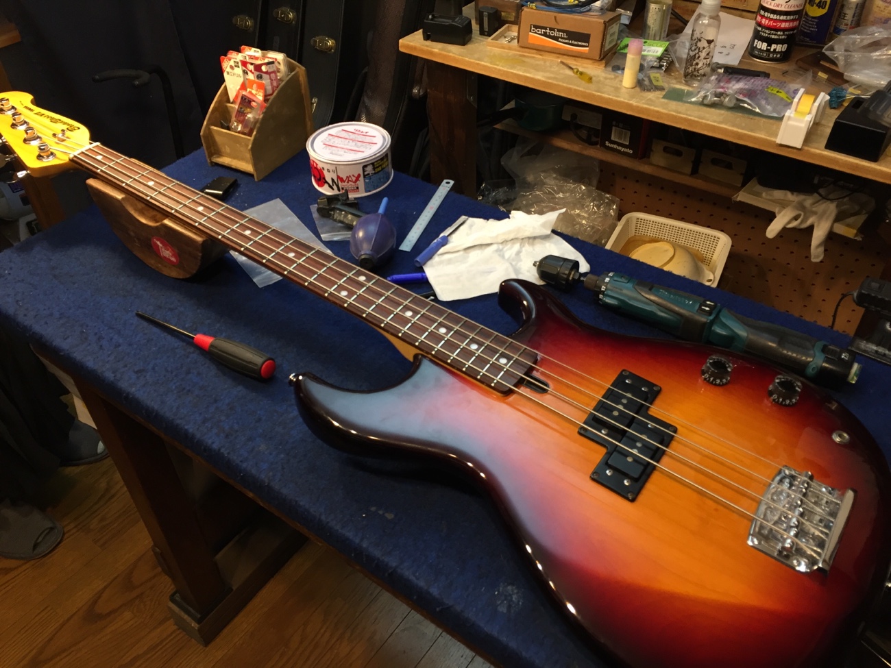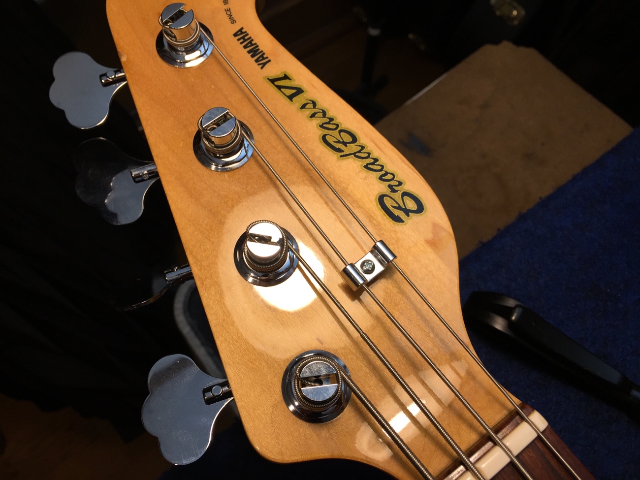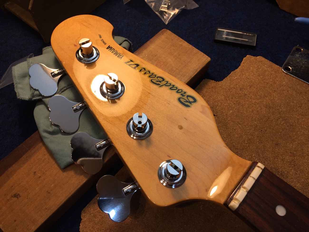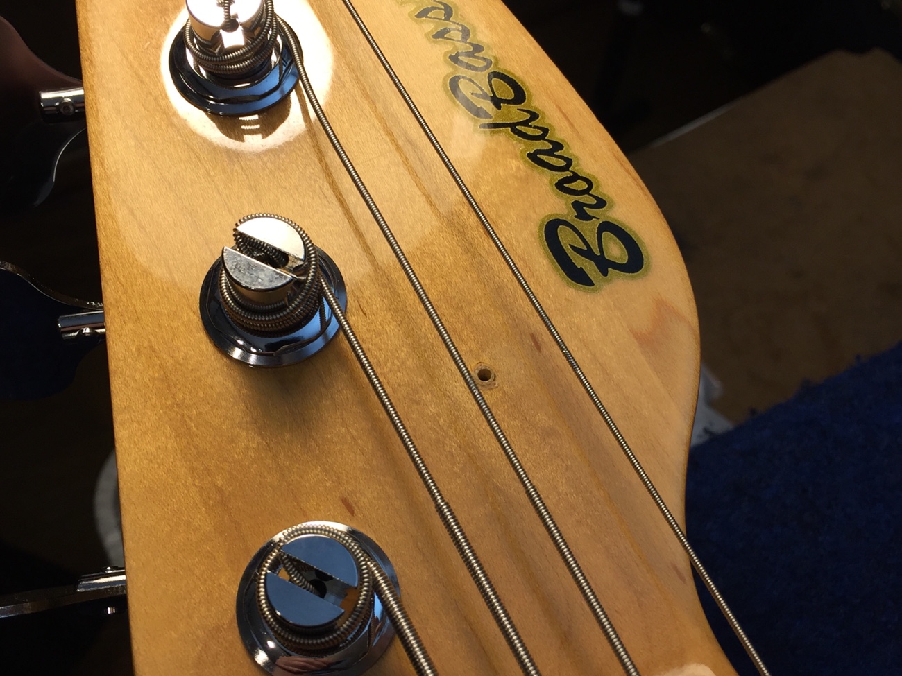 ペグとリテーナーの取り付け【YAMAHA BBのペグ交換-2】 投稿日時: 2026年3月1日 投稿者: admin ペグのネジ穴をあけていきます。 新しいペグはこちら。 こんな感じになりました。 ジョイントのネジ穴をメンテナンスしておきます。 太いネジに交換したのですが、長さがちょうどヘッドの厚みと同じだったので、数ミリグラインダーで削りました。 新しいネジ穴を弦と弦の中央にあけます。 取り付けができました。 これで作業が完了です。 Tweet