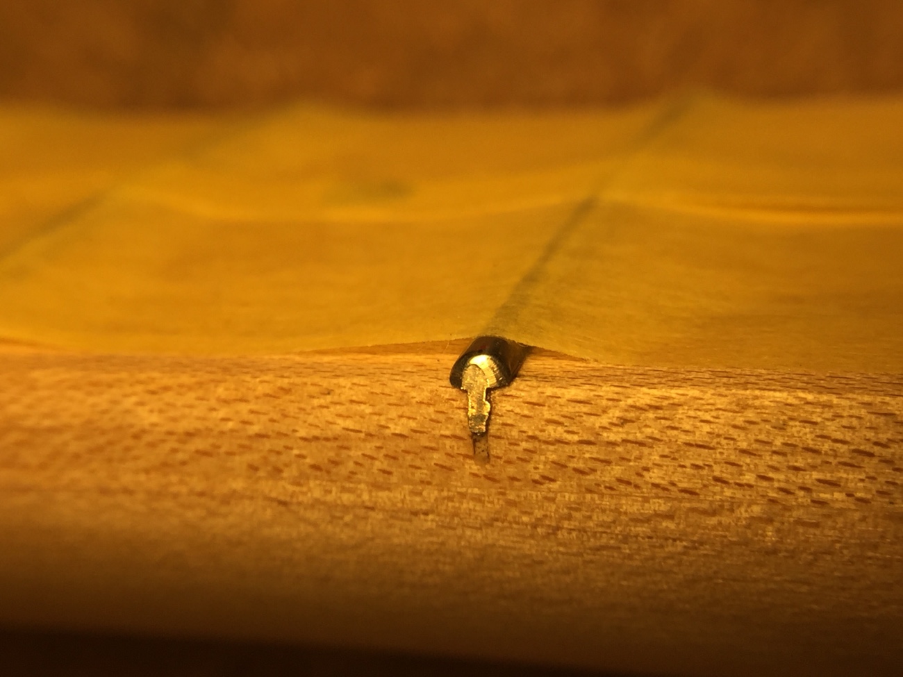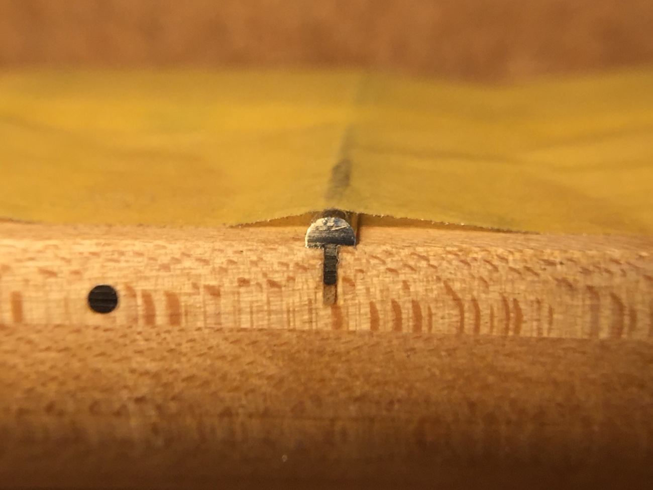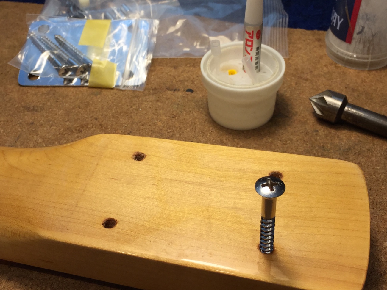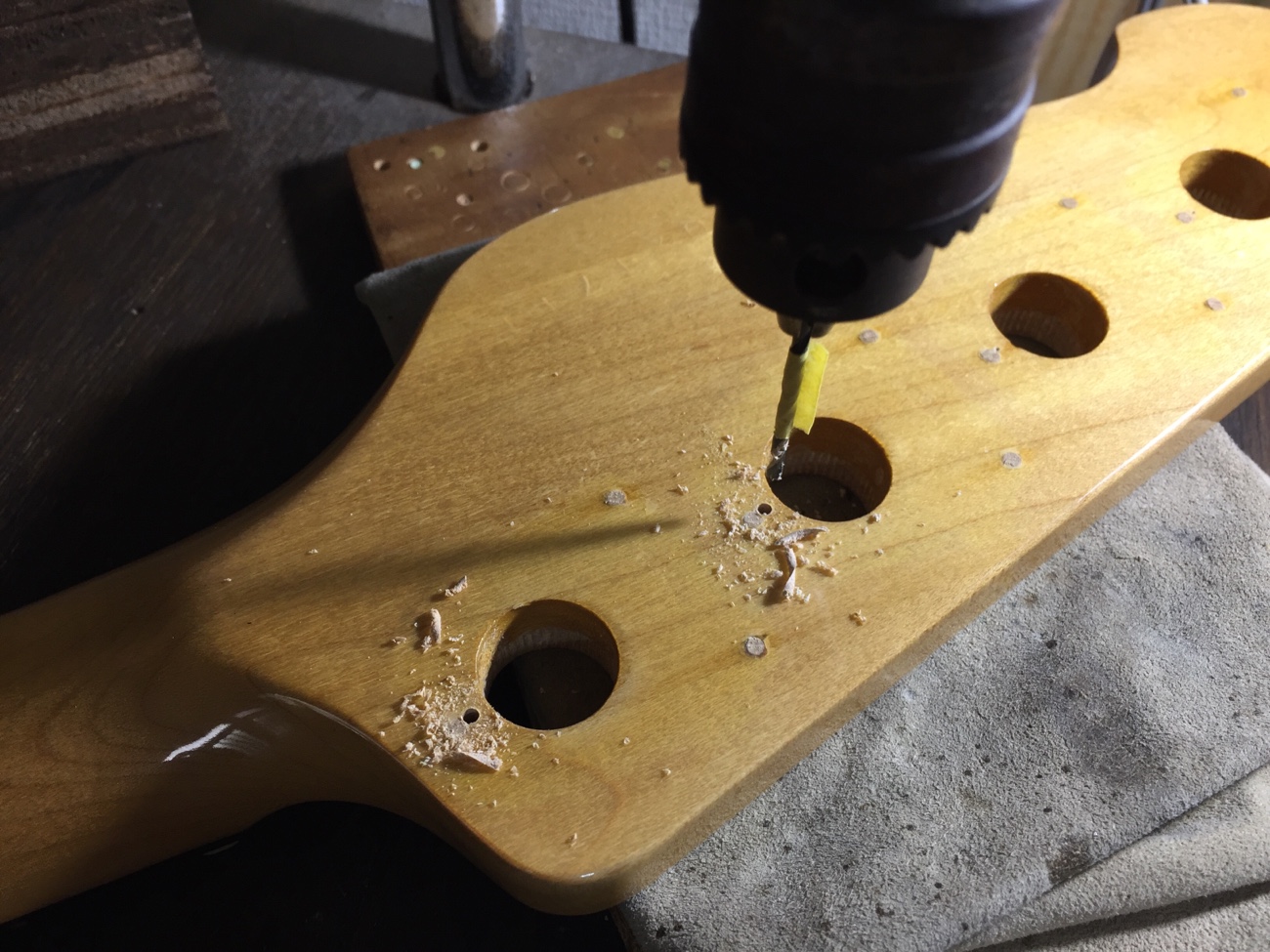 ペグとリテーナーの取り付け【YAMAHA BBのペグ交換-2】 投稿日時: 2026年3月1日 投稿者: admin ペグのネジ穴をあけていきます。 新しいペグはこちら。 こんな感じになりました。 ジョイントのネジ穴をメンテナンスしておきます。 太いネジに交換したのですが、長さがちょうどヘッドの厚みと同じだったので、数ミリグラインダーで削りました。 新しいネジ穴を弦と弦の中央にあけます。 取り付けができました。 これで作業が完了です。 Tweet