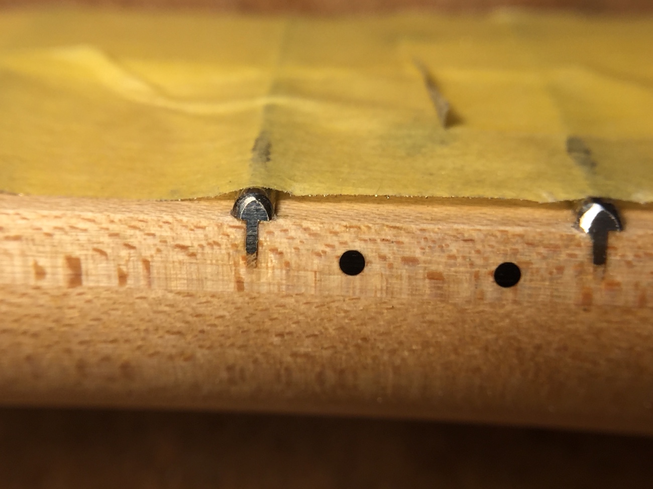 飛び出したフレットの端を削る【バッカステレのメンテナンス-2】 投稿日時: 2026年3月1日 投稿者: admin 乾燥で指板が縮んだことで、フレットのサイドが飛び出ています。 指板サイドにピッタリになるところまで削り直します。 フレットのクラウンを丸め直しました。 この状態で指板をマスキングします。 フレットを磨いて仕上げ直しました。 弦を張っていきましょう。 Tweet
