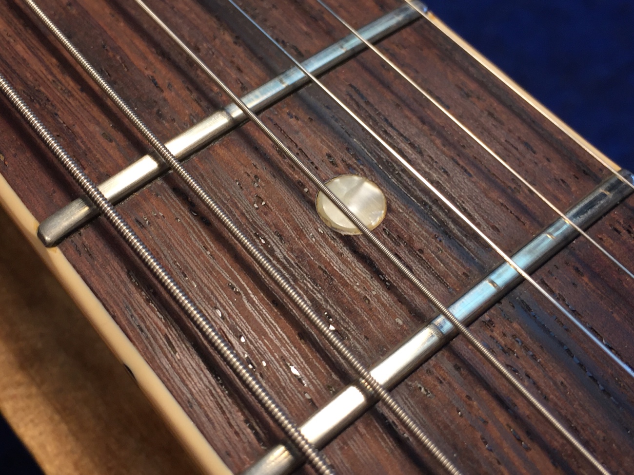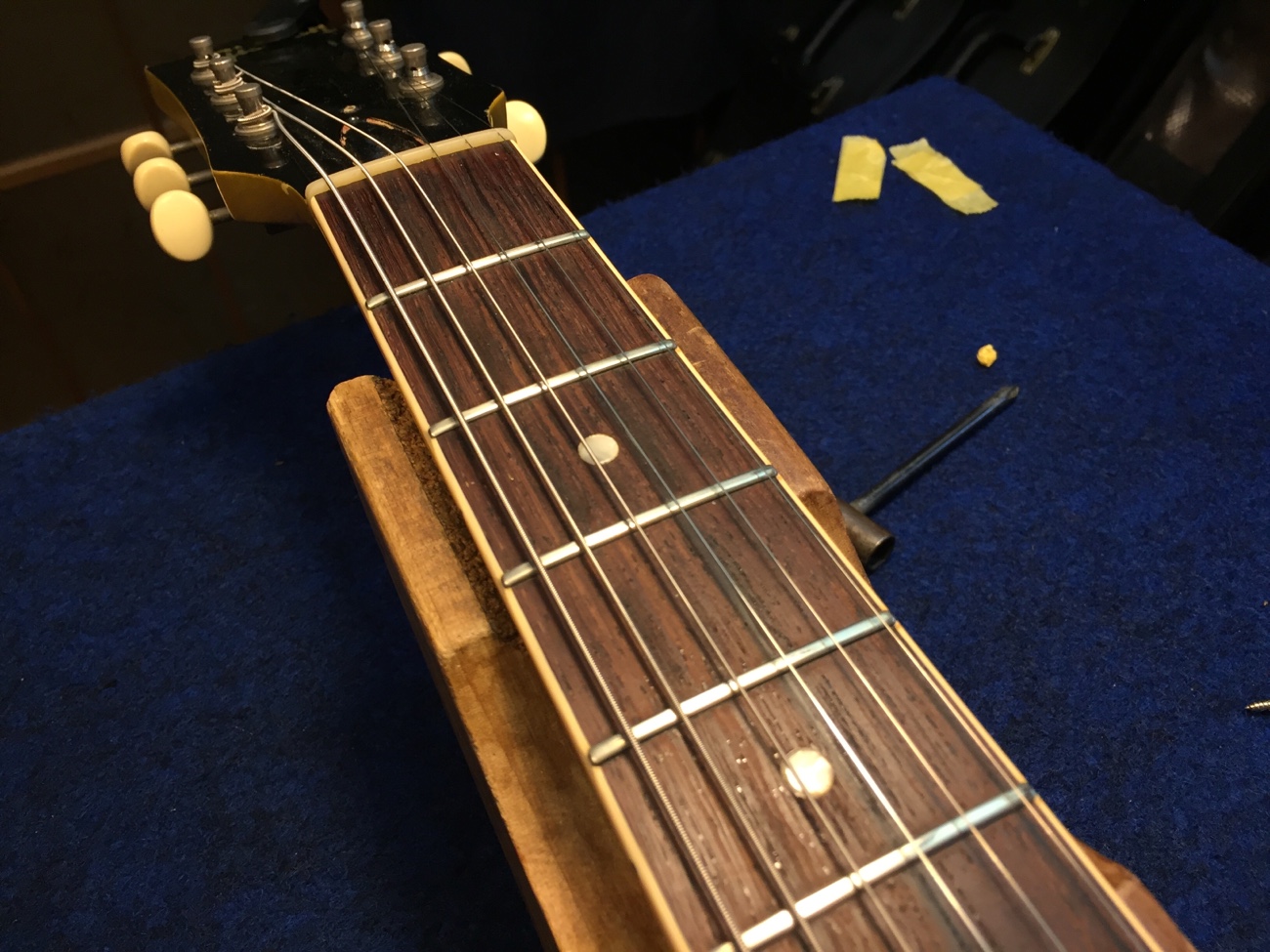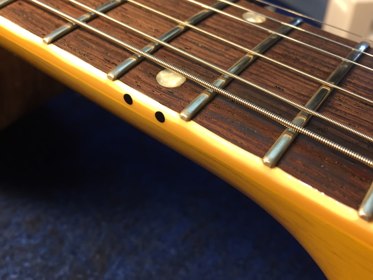 ポジションマークが膨らんでいるところがあります。 ヒーター修正の熱のせいとかでしょうか? フレット交換のついでに全体的に修理しましょう。