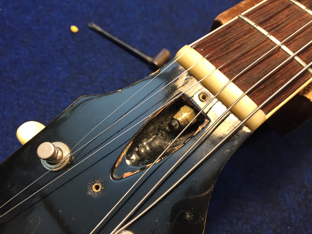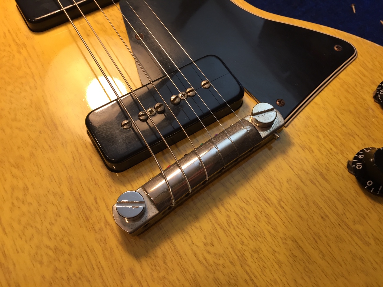 ブリッジはモントルー製バダスタイプのブリッジに交換します。 入荷待ちなのでこのギターの本格的な作業は少し先になります。