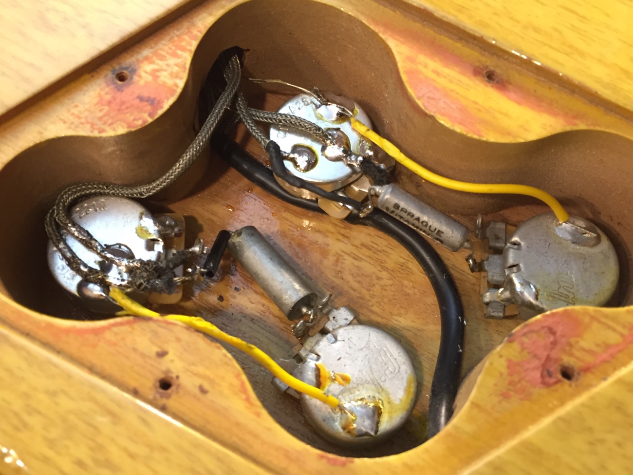 配線はこんな感じでした。 導電塗料の塗布をして、配線をきれいにやり直します。 ポットなどの電装部品はそのままでも良いかもしれません。