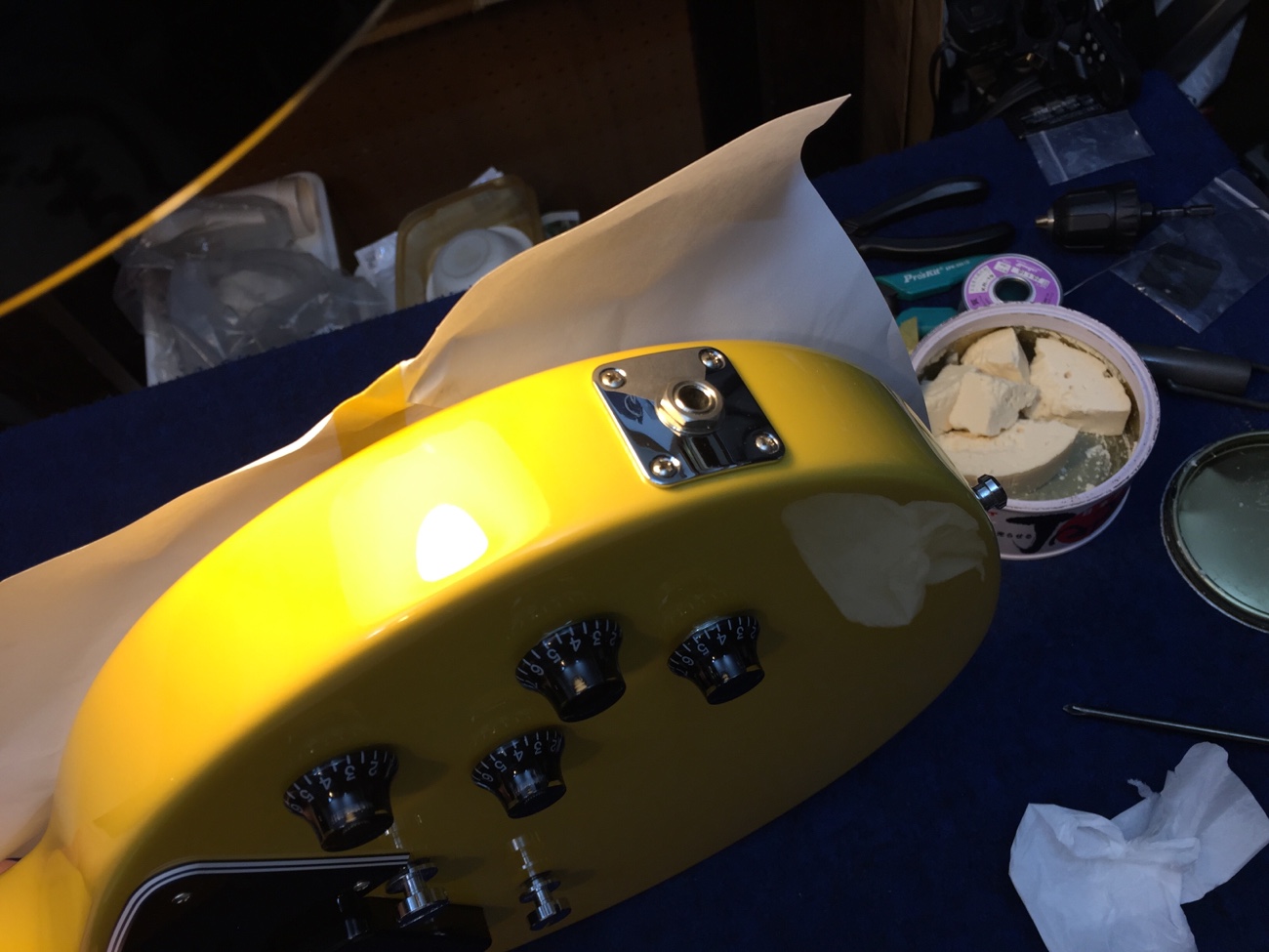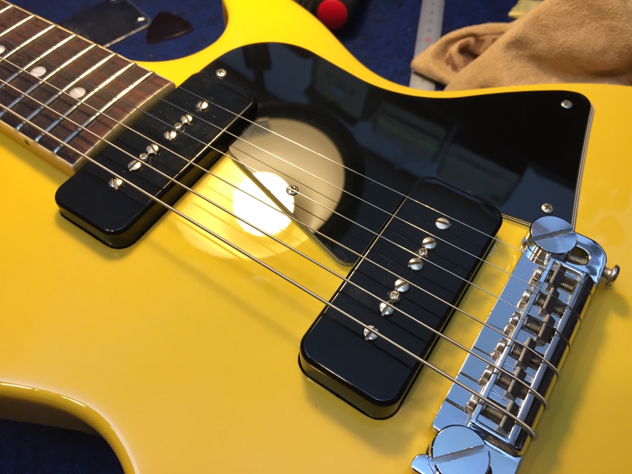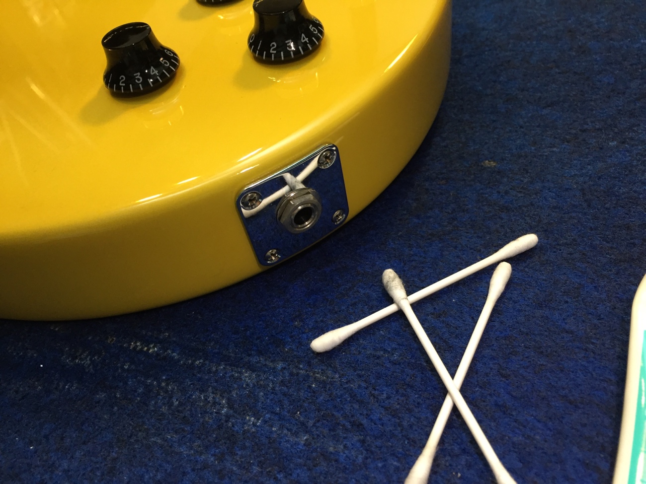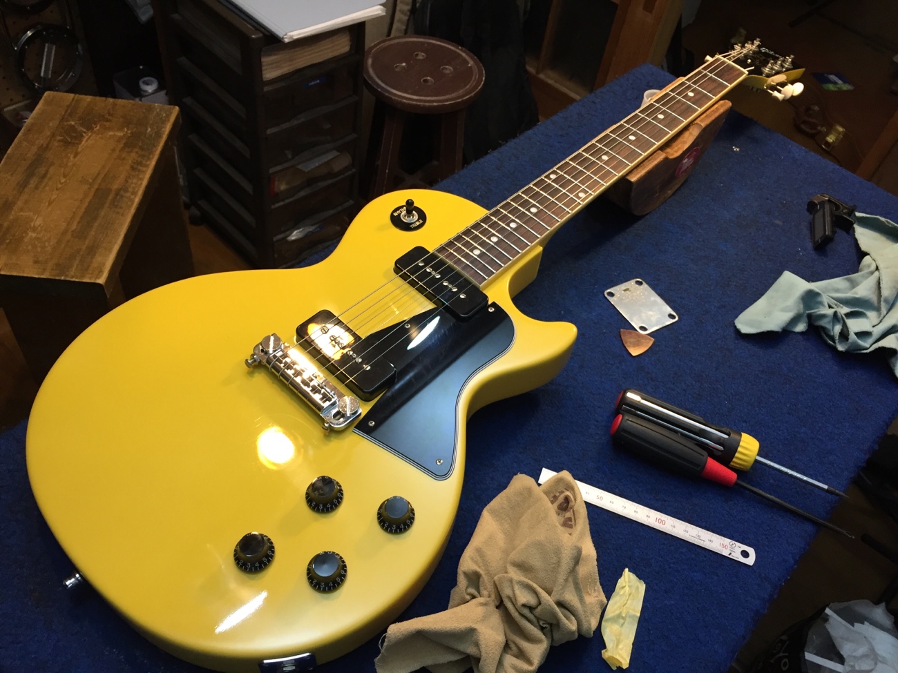 ジャックプレートの交換~完成【レスポールスペシャル(20260407お預かり)のピックアップ改造-4】 投稿日時: 2026年4月27日 投稿者: admin 新しいネジ穴をあけました。 金属製のジャックプレートが取り付けできました。 ジャックが曇ってきていたので掃除しておきます。 ピックアップの配線を戻していきます。 フレットをクリーニングしておきます。 ナットの弦溝を掃除して、追いグリスしておきます。 ピックアップの高さを調整します。 弦高やオクターブチューニングを調整しました。 ブリッジピックアップのミドルが詰まった感じと、まき直したことでローを残しつつも弦のきらめき感が出てくるようになったネック側ピックアップの音色とが、ミックスポジションで良い具合の音量で溶け込むように音量バランスを取りました。 Tweet