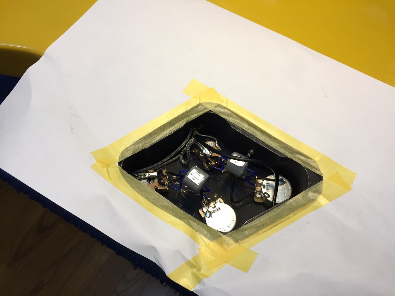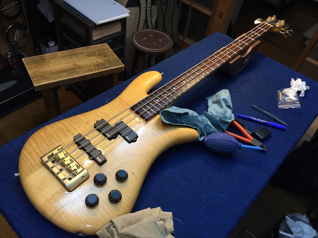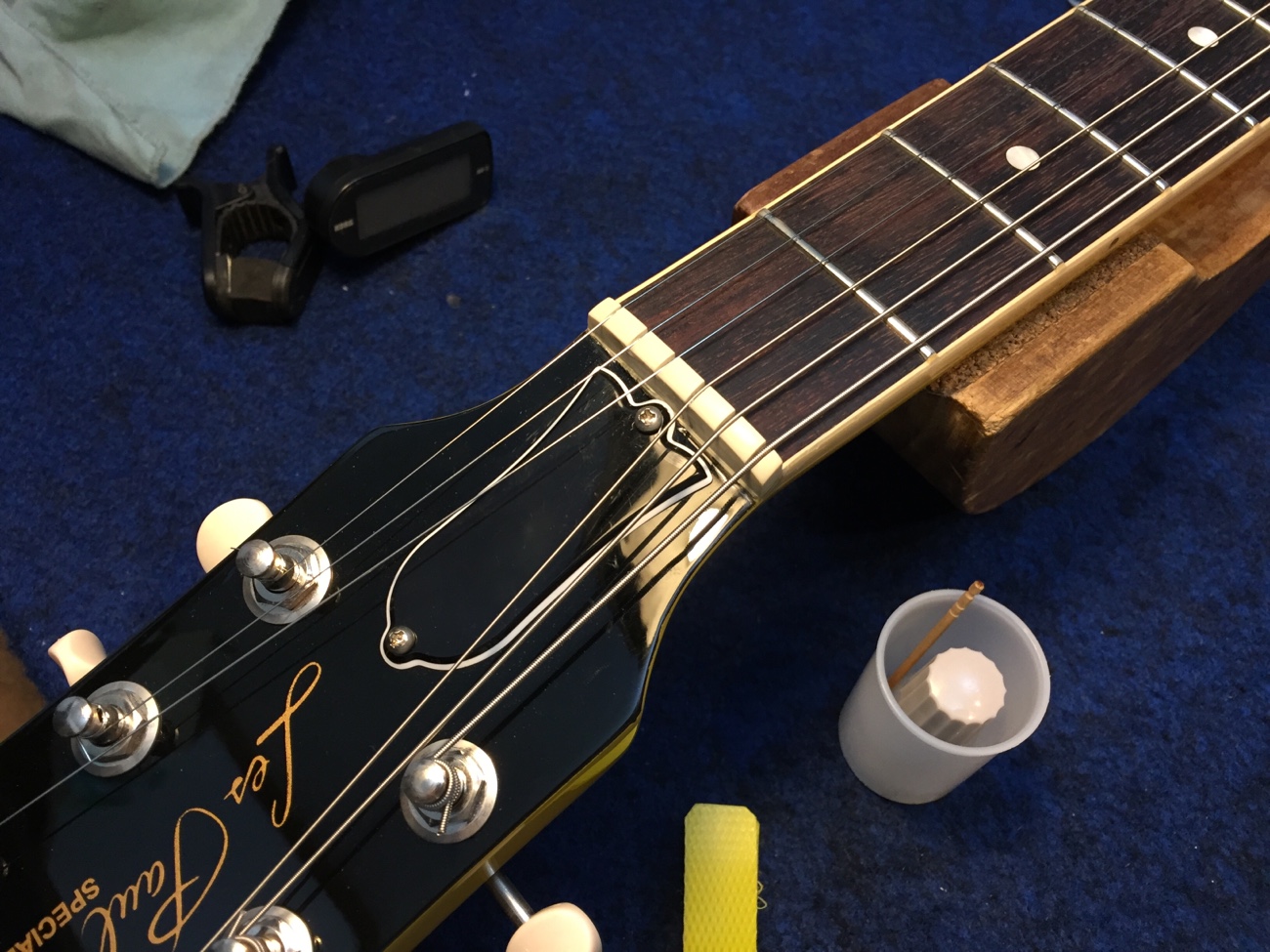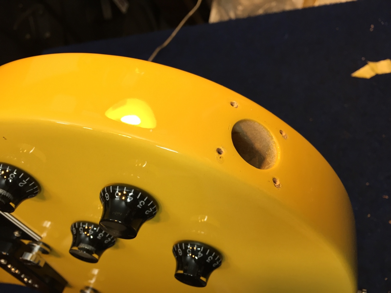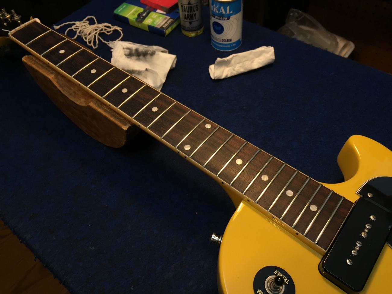 ジャックプレートの交換~完成【レスポールスペシャル(20260407お預かり)のピックアップ改造-4】 投稿日時: 2026年4月27日 投稿者: admin 新しいネジ穴をあけました。 金属製のジャックプレートが取り付けできました。 ジャックが曇ってきていたので掃除しておきます。 ピックアップの配線を戻していきます。 フレットをクリーニングしておきます。 ナットの弦溝を掃除して、追いグリスしておきます。 ピックアップの高さを調整します。 弦高やオクターブチューニングを調整しました。 ブリッジピックアップのミドルが詰まった感じと、まき直したことでローを残しつつも弦のきらめき感が出てくるようになったネック側ピックアップの音色とが、ミックスポジションで良い具合の音量で溶け込むように音量バランスを取りました。 Tweet
