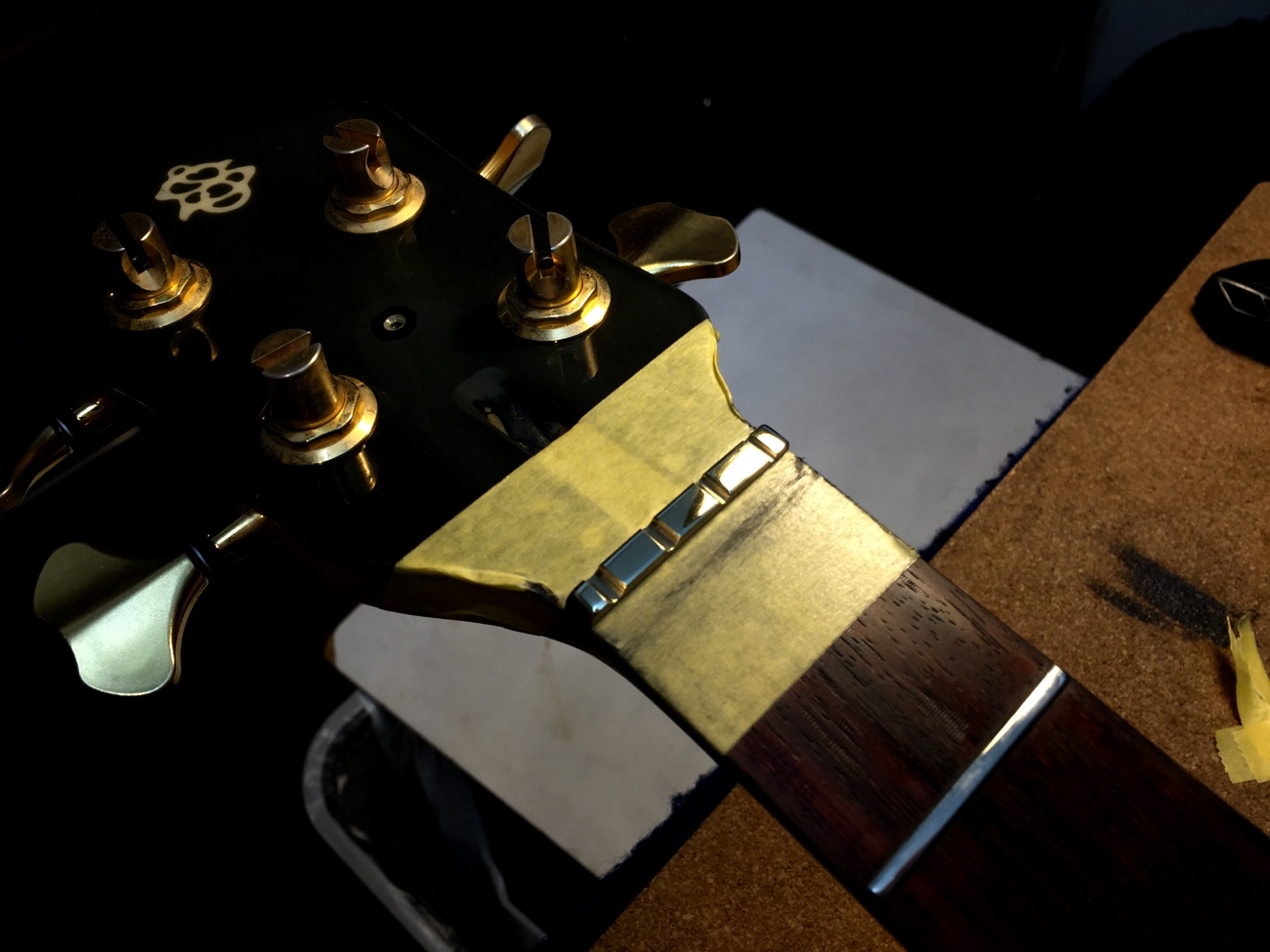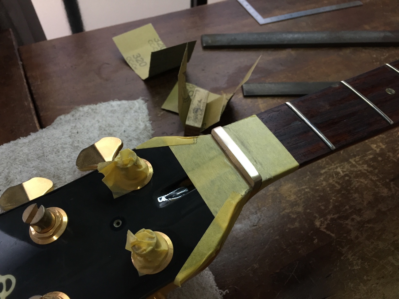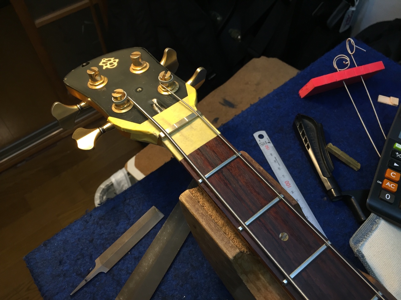 ブラスナット成形~完成【スペクターNS-2のフレットすり合わせとナット交換-4】 投稿日時: 2026年4月27日 投稿者: admin ブラスナットの形を整えます。 弦溝を作っていきましょう。 太い弦を張ってありますがドロップDから半音下げで異音が鳴らないように溝を作るのは非常に気を遣います。 しかももし失敗したらブラスナットの加工は大変です・・・。 なかなか良い感じにできたので、ナット全体を仕上げました。 新しい弦を張っていきます。 とても良くなった気がします。 これで完成です。 Tweet