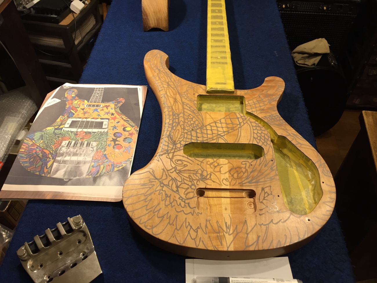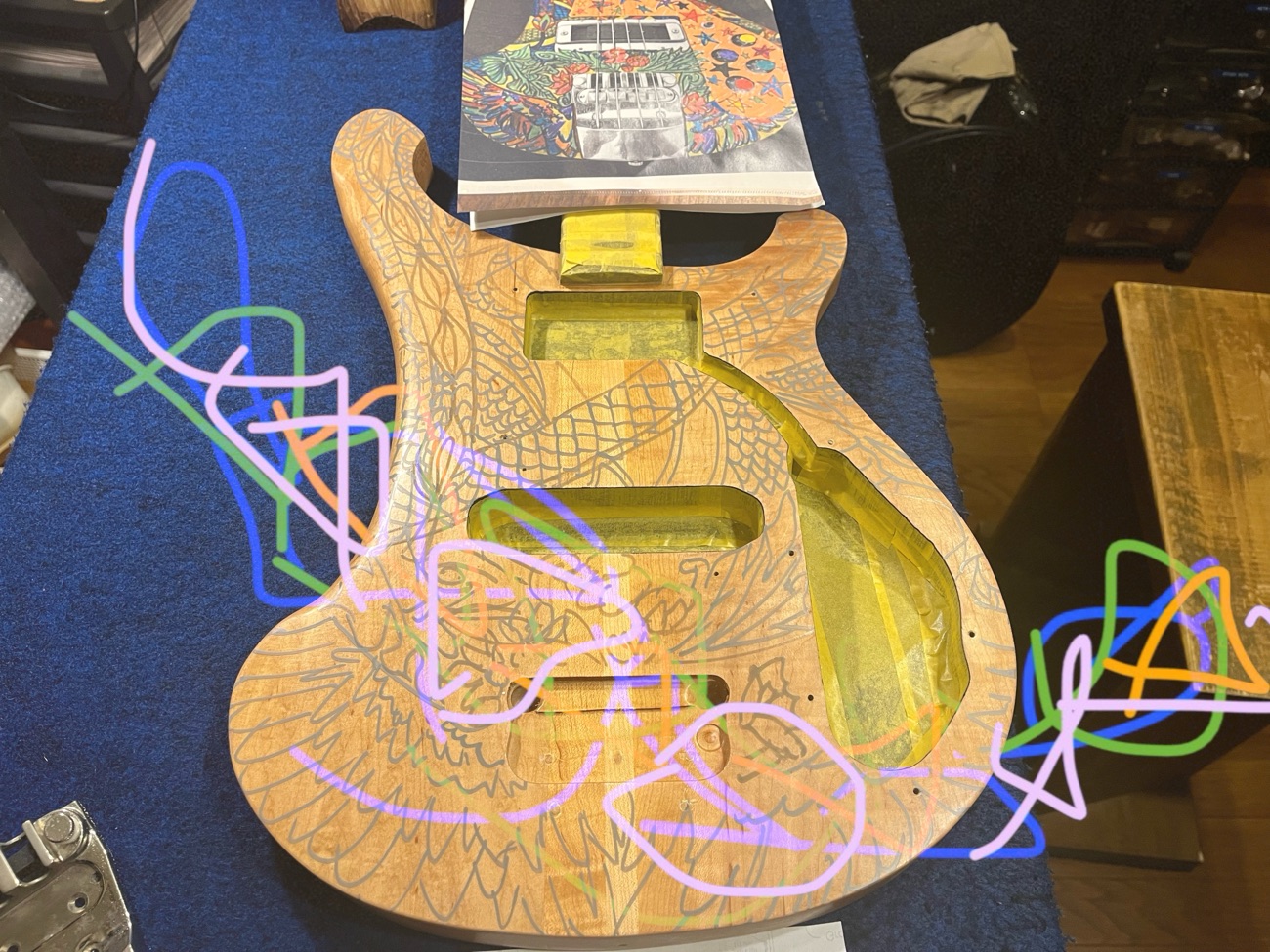 線画が完成【グレコのリッケンバッカー風ベースの改造-21】 投稿日時: 2025年9月22日 投稿者: admin 昨日3ヶ月ぶりの閃輝暗点が出て、2日続けて今日も。 頭痛がひどいので横になっていましたが、偏頭痛でもできそうなことを見つけたので進めます。 下絵が完成しました↓ しかしこの絵、同じ症状の人が描いたせいか、ちょっと閃輝暗点っぽさがありますね。 Tweet